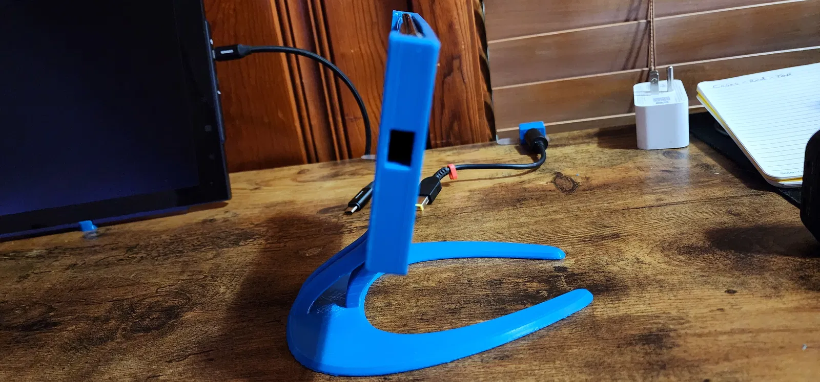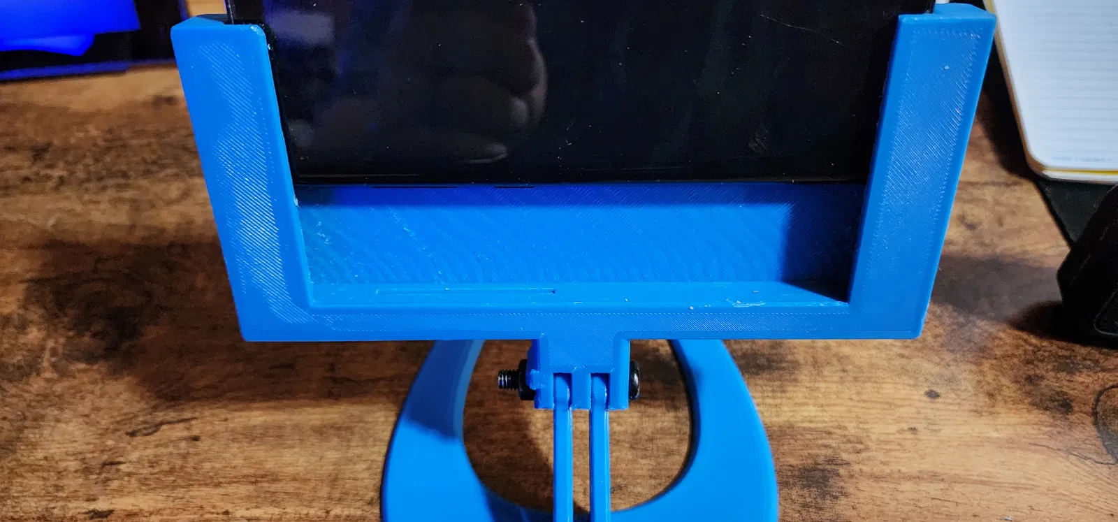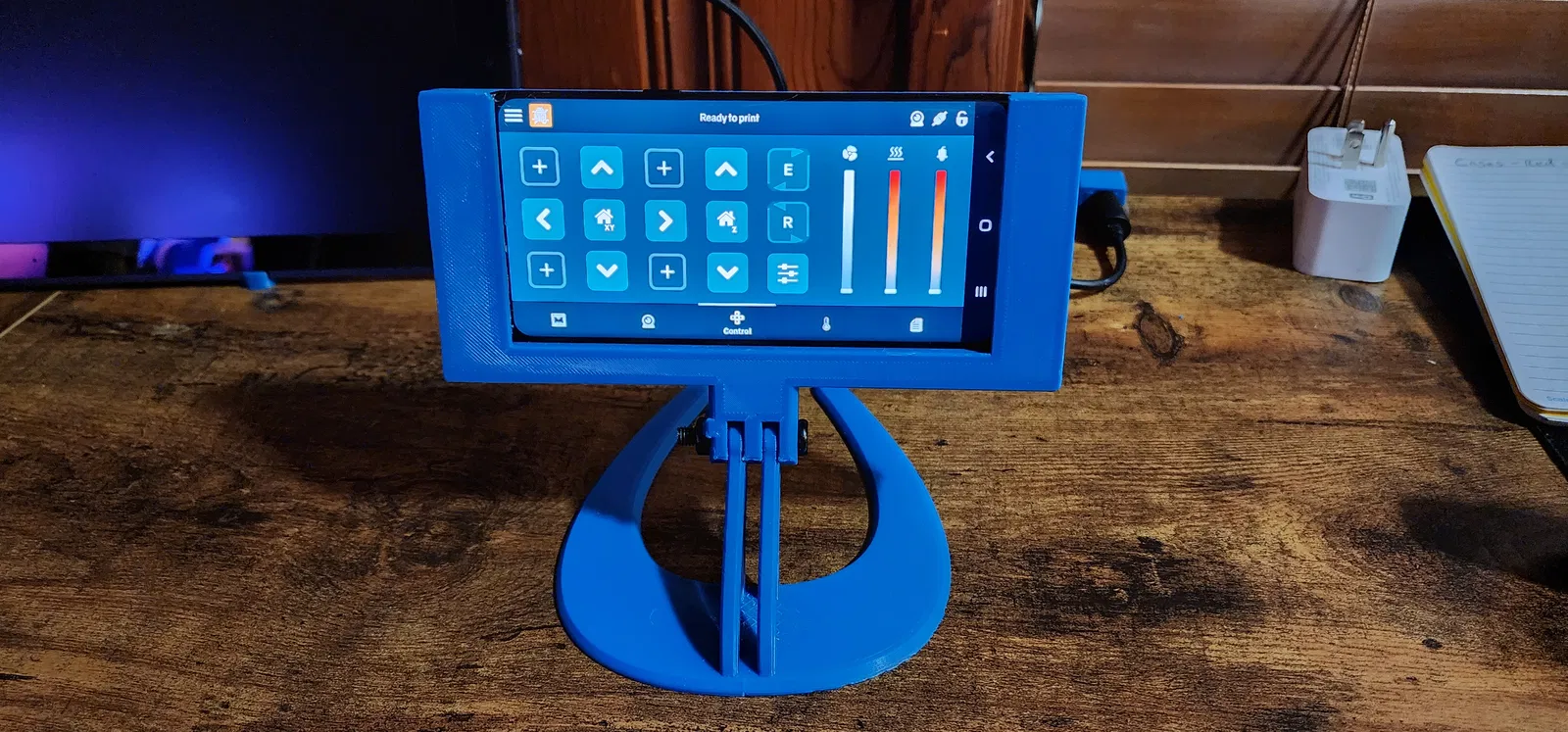 Tui có cái quạt máy để bàn này trong văn phòng và rất ấn tượng với sự đơn giản của khớp nối và đế. Tui đã tháo khớp nối dưới ra khỏi vỏ và gắn nó vào giá đỡ. Giữ nguyên phần đế, chúng khớp với nhau và tạo thành một giá đỡ rất chắc chắn và đơn giản. Tui đã khoét một lỗ trên giá đỡ để các nút Bixby và Âm lượng không bị bấm khi điện thoại ở đúng vị trí. Ngoài ra còn có một lỗ khoét để cắm sạc. Chỉ cần một con vít và bu lông M6 x 30 là đủ để nối giá đỡ và đế lại với nhau. Điều này cho phép tui có một thiết bị cảm ứng để điều khiển máy in, tui có thể di chuyển nó quanh nhà hoặc để trên bàn để thay đổi nhiệt độ và trục một cách nhanh chóng.
