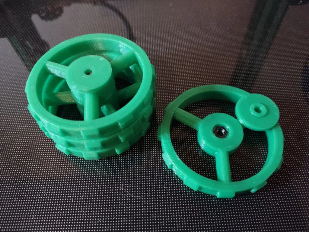 In gồm hai phần, bánh xe và một nắp, định hướng như trong file STL mà không cần supports.