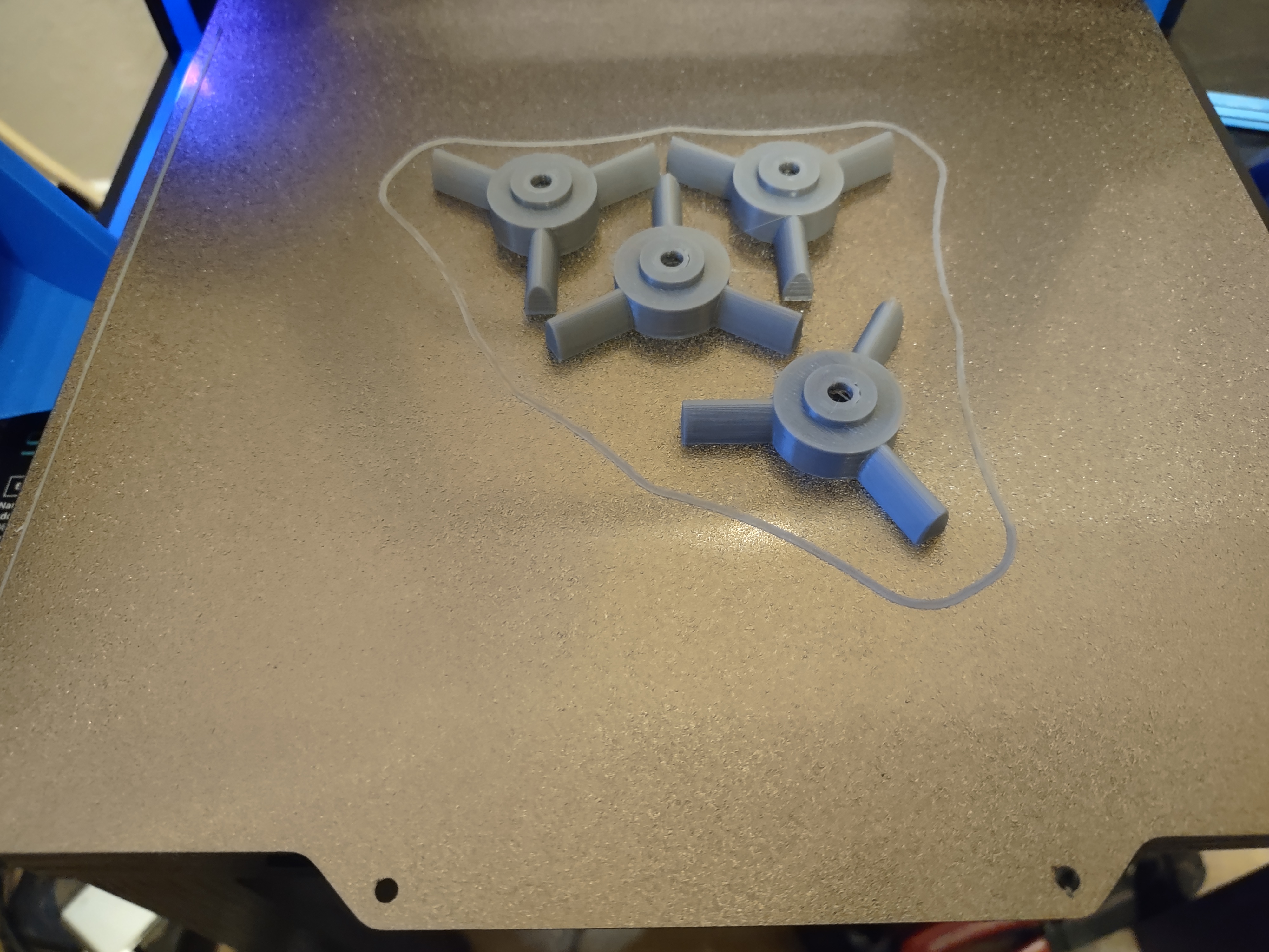 Thông thường, tôi thích in phần bánh xe ngoài với màu trùng với màu máy và in phần trung tâm với các nan hoa màu đen, điều này làm cho phần trung tâm trông gần như vô hình trên bề mặt đen nơi máy in của tôi được đặt. Bộ núm tôi sắp lắp vào máy Sunlu T3 này hơi khác một chút. Tôi đã không nhận ra cho đến khi in xong phần bánh xe ngoài màu xanh dương để hợp với máy đó, là tôi không còn sợi nhựa màu đen nào cả. Tôi tìm thấy một ít màu xám nhạt và nghĩ “Go Lions!” :) Tôi nghĩ đó là một sự kết hợp màu sắc hay.