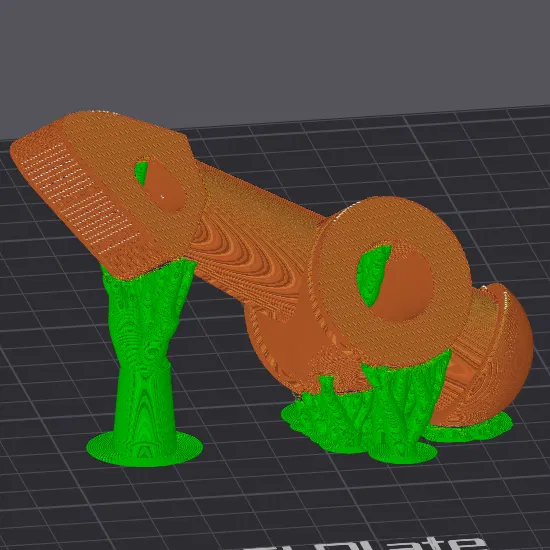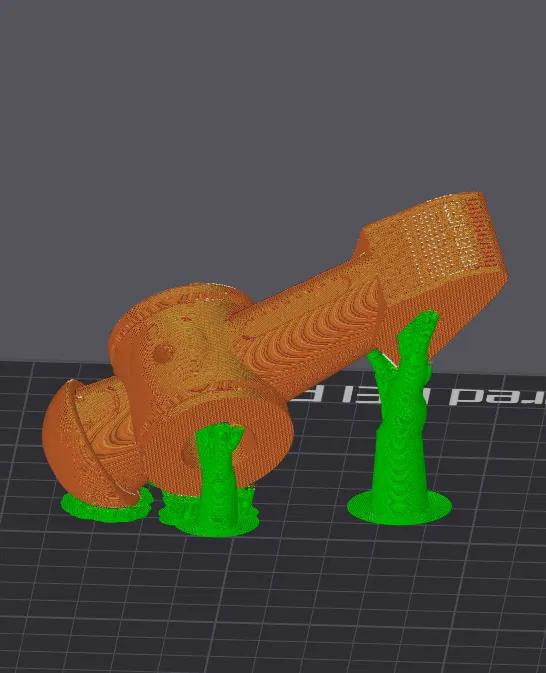 Tôi đã in phiên bản gốc ở góc kép và úp ngược để giảm thiểu vật liệu hỗ trợ ở những khu vực quan trọng như lỗ cốt. Cái vật liệu hỗ trợ đi vào lỗ cốt sẽ đỡ cho lỗ chốt (roll pin). Xem hình nha.