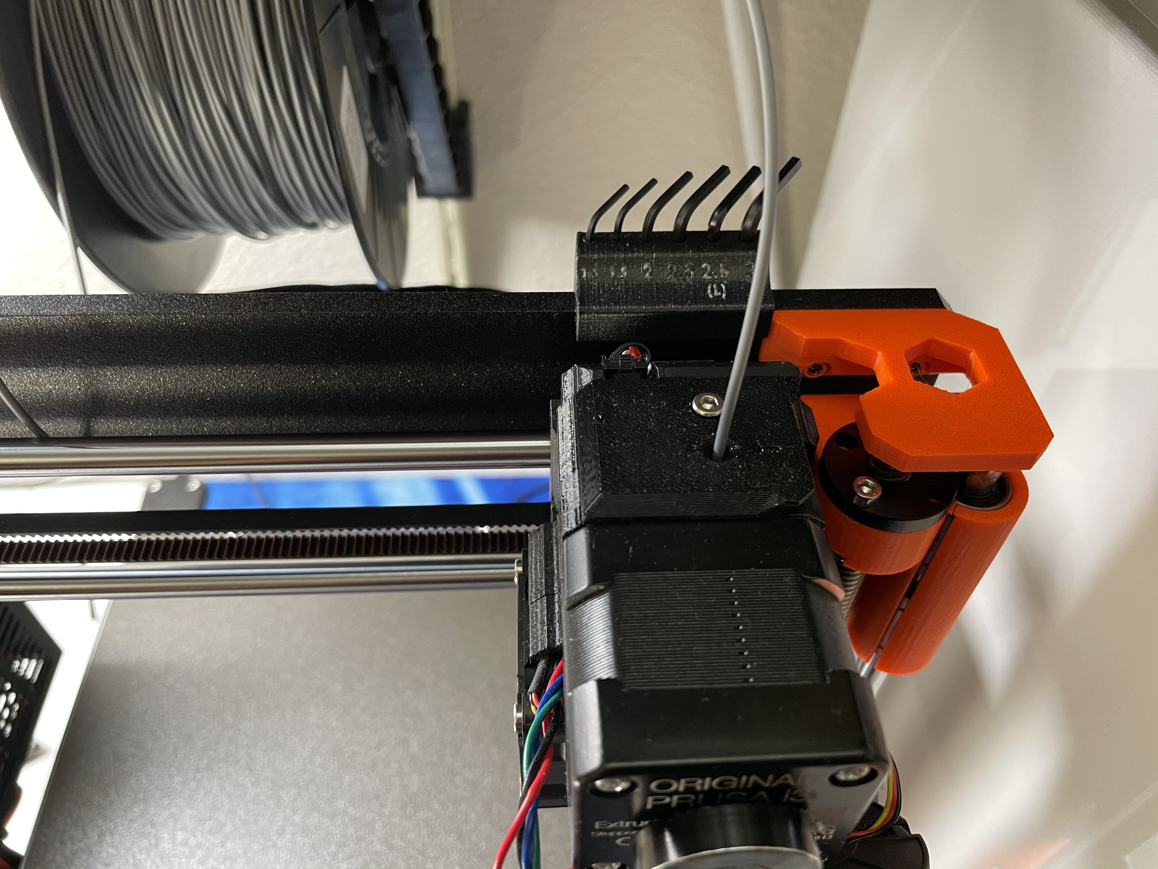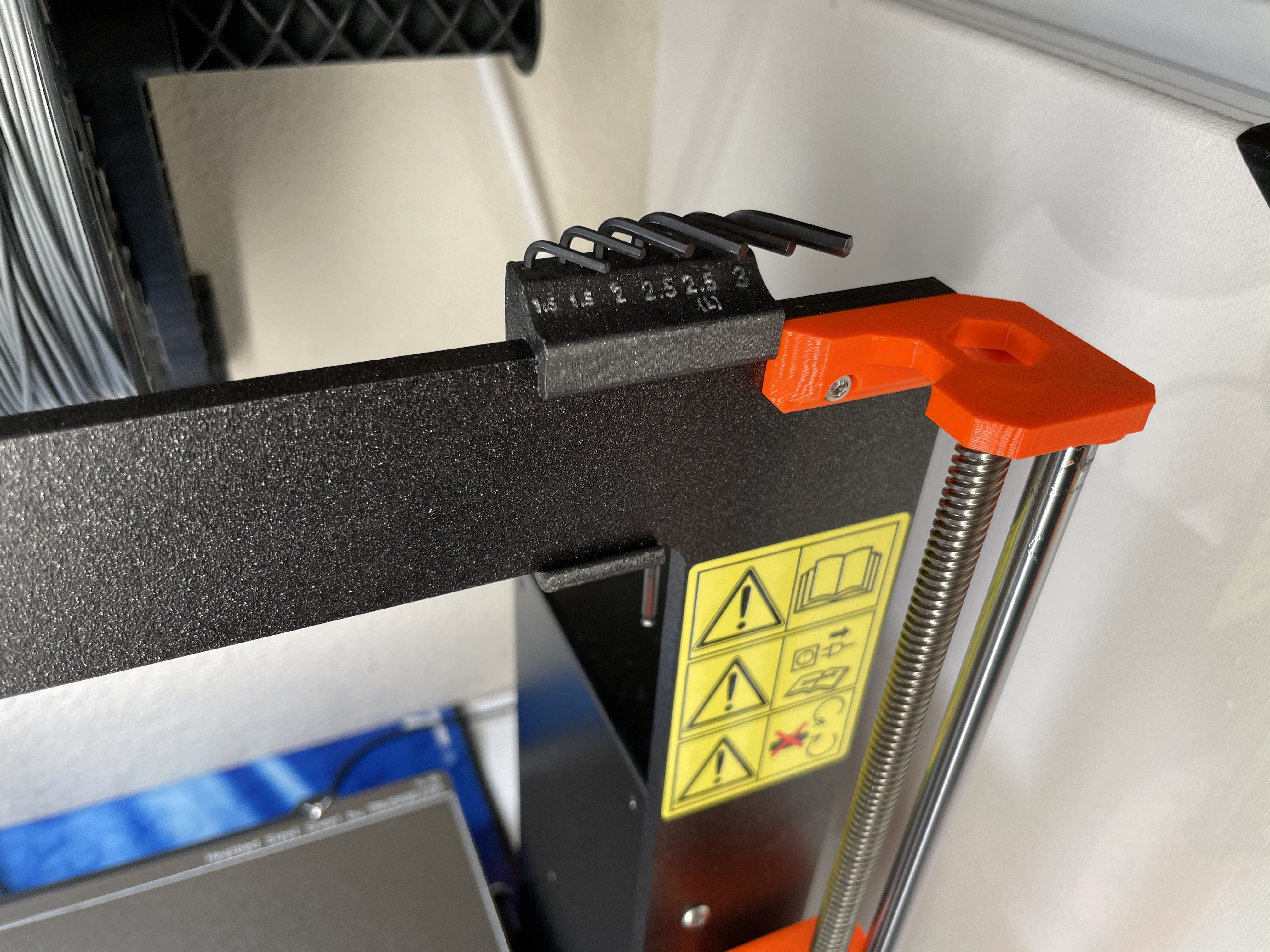 Chiếc đế này giúp cất giữ và dễ dàng gắn/tháo các chìa khóa Hex/Allen đi kèm bộ kit Prusa i3 MK3S+ ngay trên máy in. Có nhiều phiên bản (trái/phải, 5/6 khe, PLA/PETG) và không ảnh hưởng đến quá trình in. Thiết kế dựa trên kẹp spool holder, dễ dàng gắn vào khung máy.