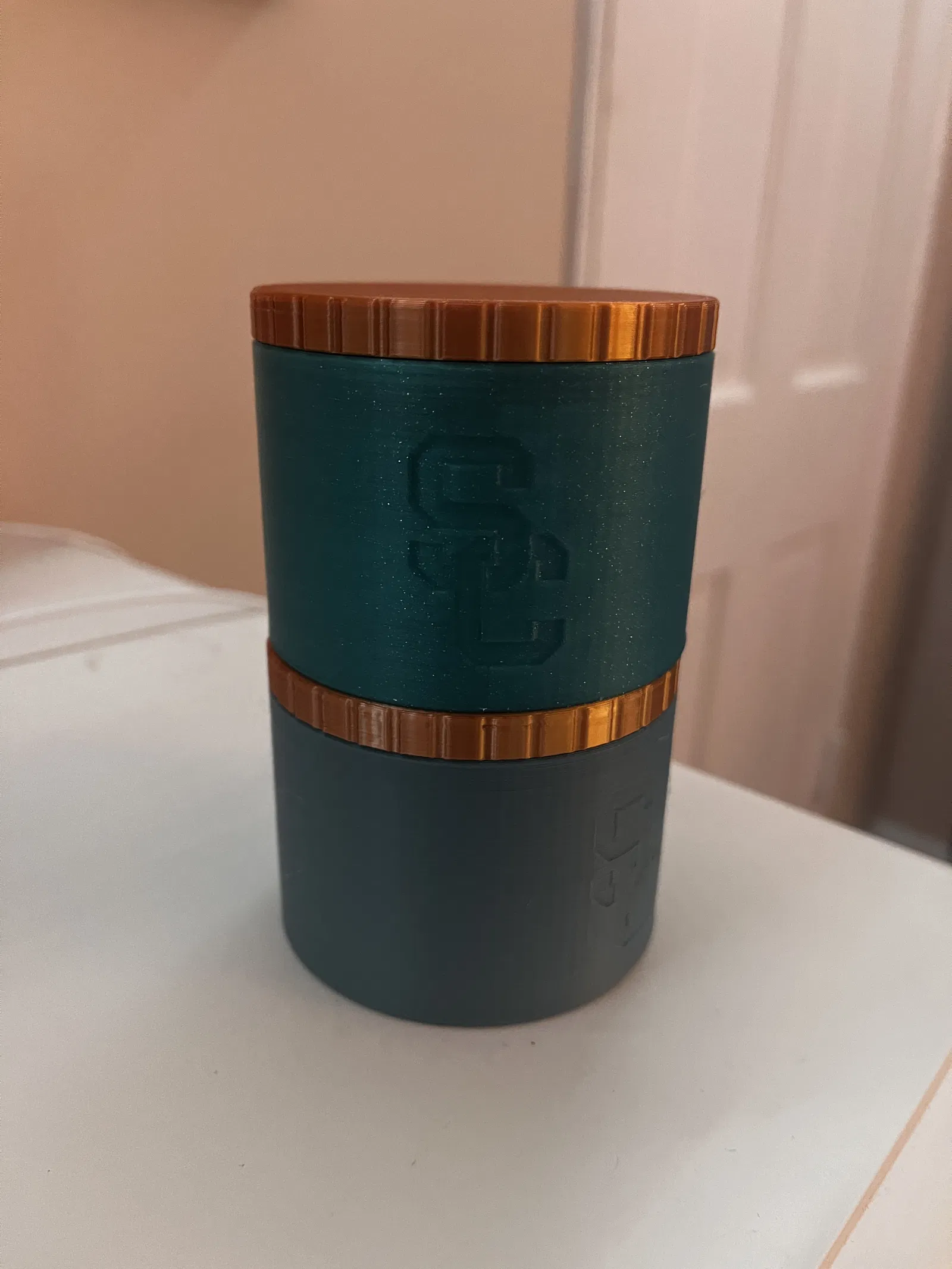 Cái hộp này có nắp vặn, có thể có hoặc không có logo SC. Thiết kế tối giản, phù hợp để đựng đồ. File STL có sẵn để bạn in 3D dễ dàng.