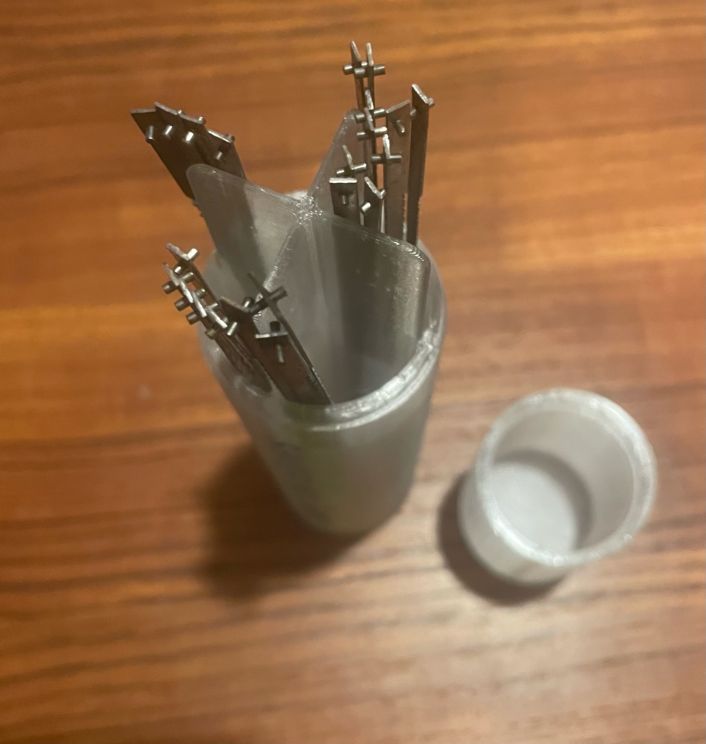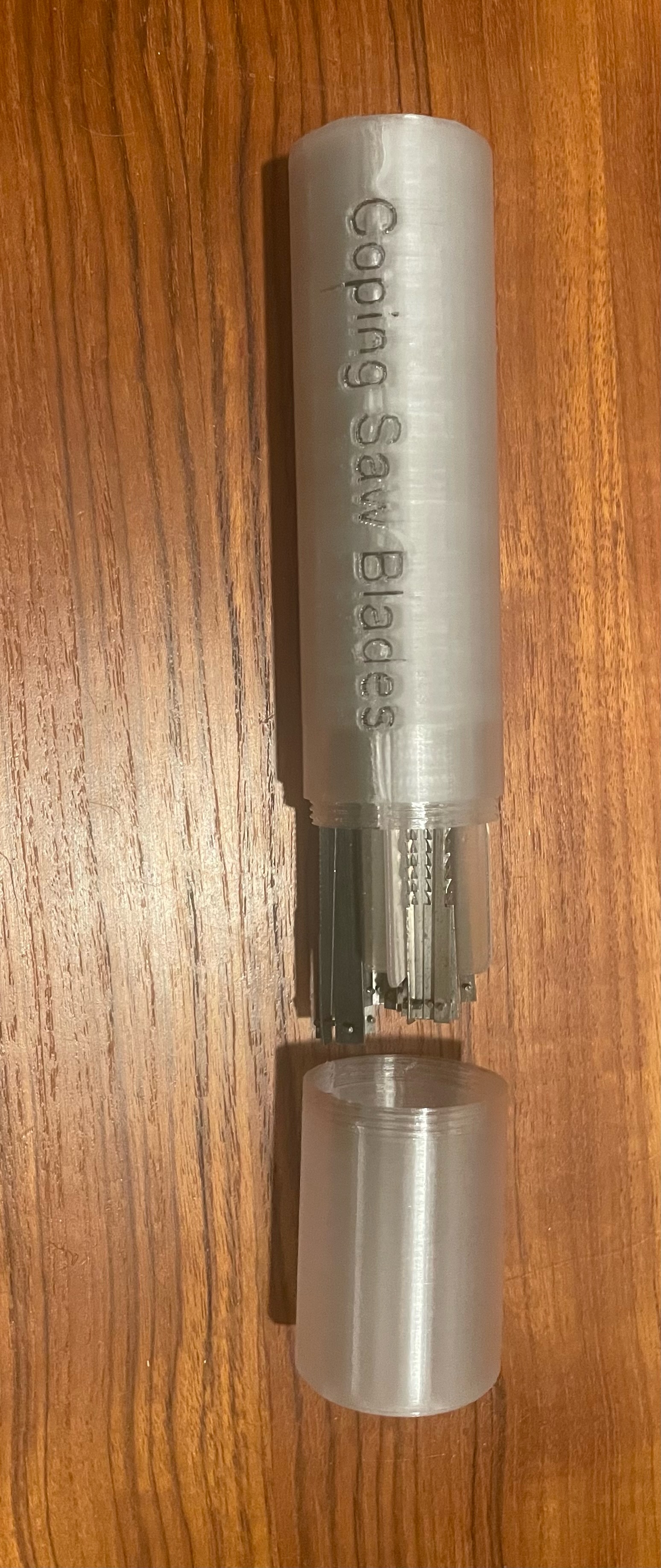 Hộp đựng lưỡi cưa lọng này chứa các lưỡi cưa tay kích thước tiêu chuẩn với 4 ngăn riêng biệt cho từng loại lưỡi. Mô hình được in bằng PETG hoặc PLA, không cần supports và ren hoạt động tốt ngay lập tức.
