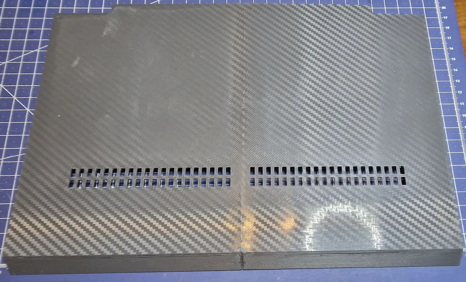 Bìa nên được in bằng ABS, ASA hoặc ABS-CF/ASA-CF gia cố. Đối với việc in hai phần trên một máy in nhỏ (giường 220mm), nên sử dụng keo ABS (ví dụ: Tamiya 87137), acetone, ethyl acetate (hoặc thậm chí dung dịch tẩy sơn móng tay) để dán các phần lại với nhau. Ở dưới cùng của bìa có một chỗ cho một chèn ren 2mm (M2L3) - có sẵn ví dụ như trên AliExpress.