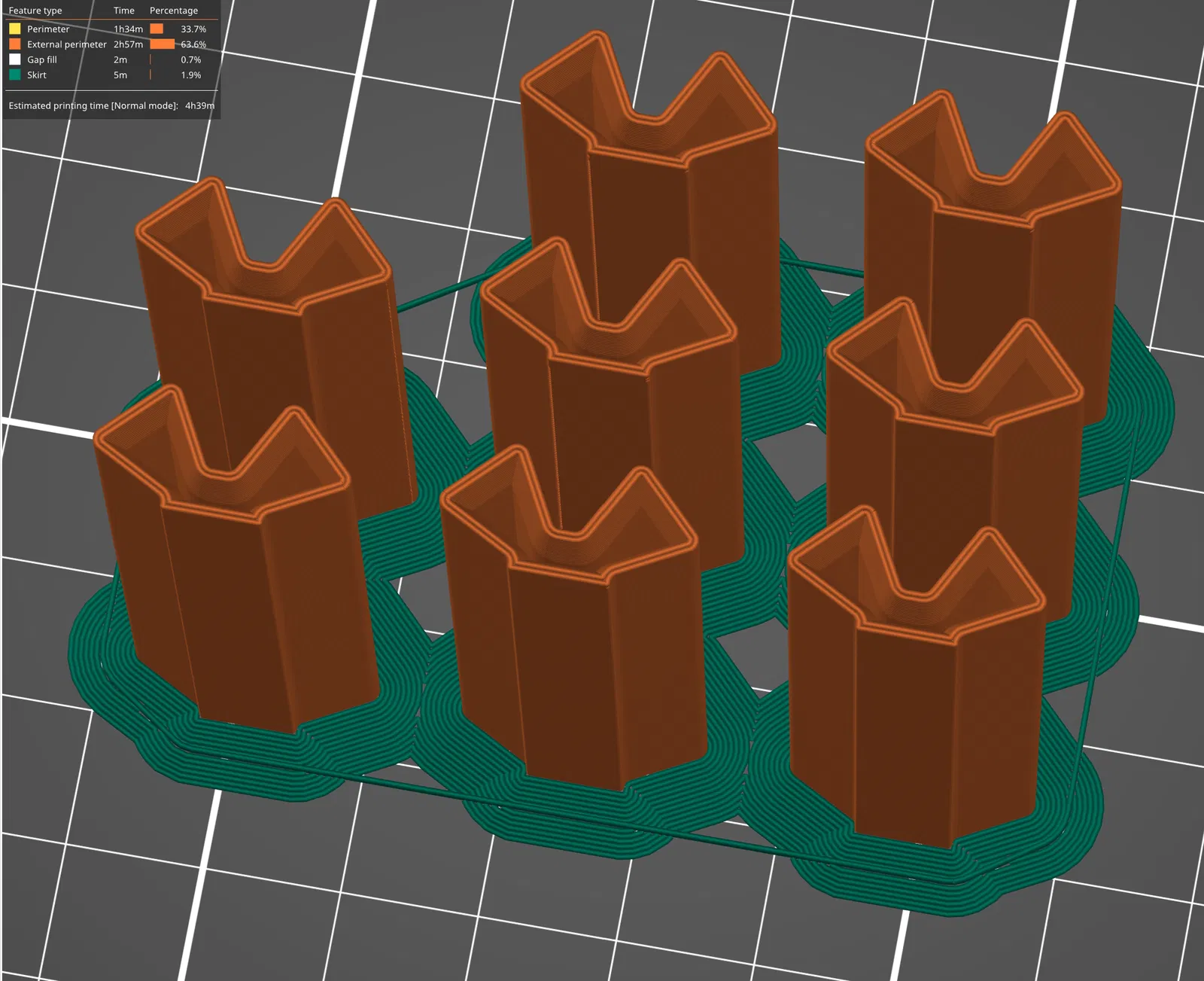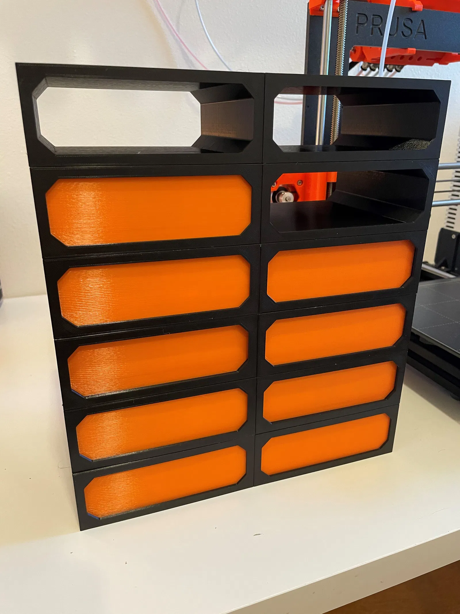 Ngăn kéo In chúng với đáy tiếp xúc với mâm in. Vì tất cả các thành đều mỏng, với 2 lớp chu vi, nên không cần lớp độn bên trong. Do phần nhô ra nhỏ trên tay cầm hình cầu, tôi đã thêm vật liệu hỗ trợ để đảm bảo hoàn thiện tốt, nó vẫn có thể hoạt động mà không cần hỗ trợ, nhưng tôi chưa thử in mà không có chúng.