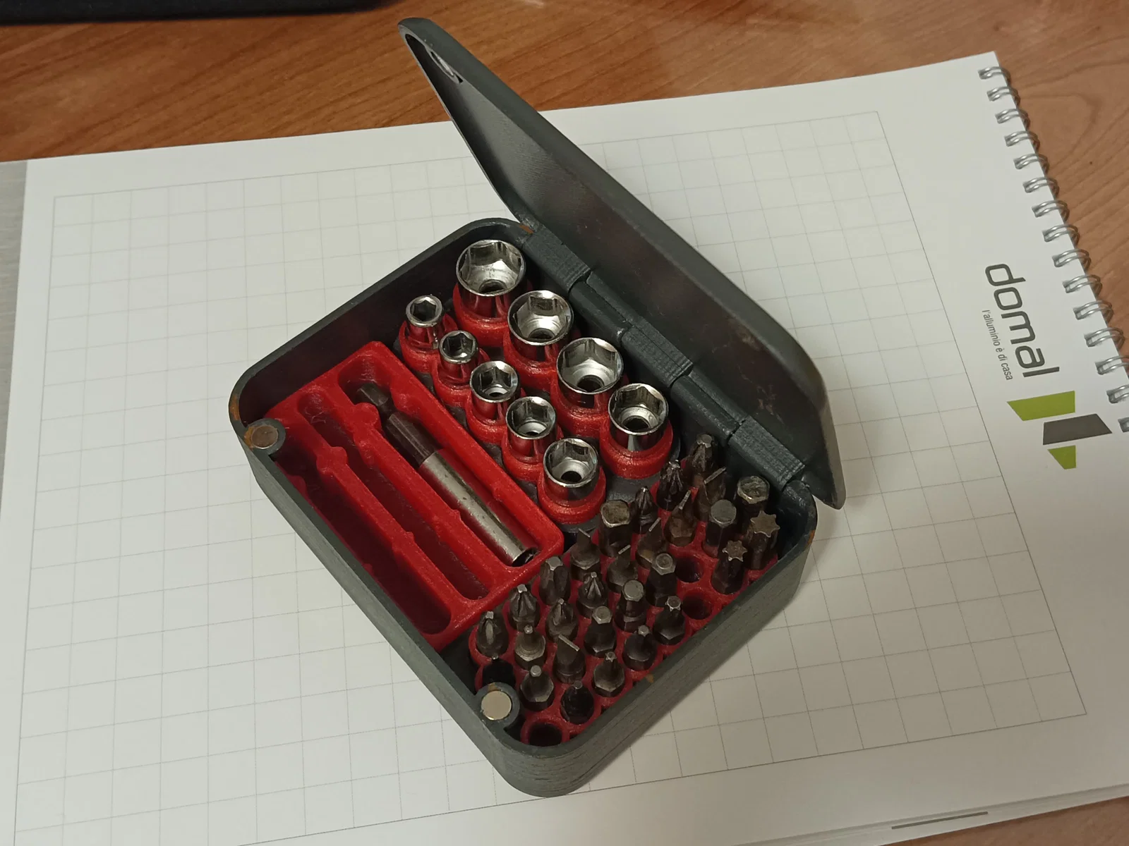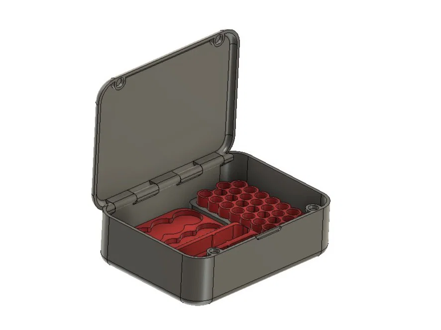 Hộp đựng mũi vít đơn giản, nhỏ gọn, có thể mang theo cả ổ cắm mũi vít và mũi lục giác. Có thể in phần giữ mũi bằng TPU, các bộ phận khác bằng PLA/PETG. Sử dụng 4 nam châm 5mm để đóng mở.