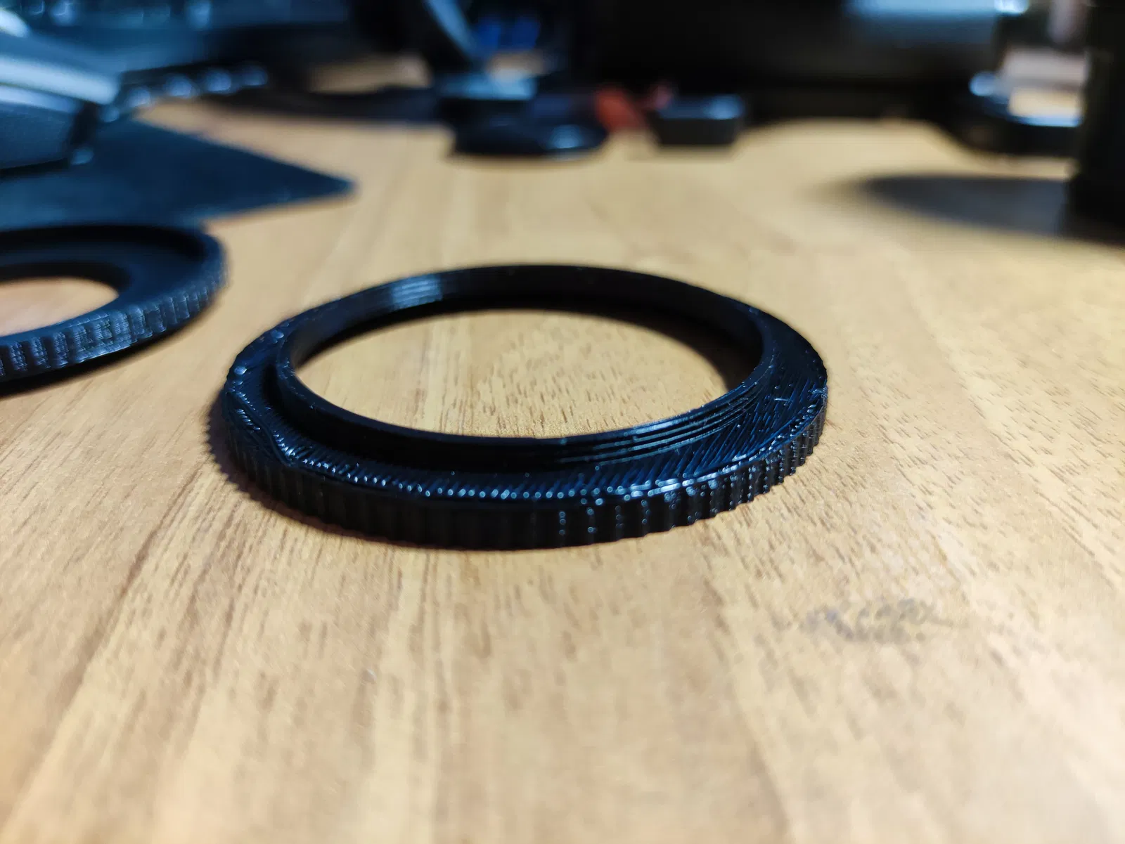 Vòng chuyển đổi ren 49-55mm giúp bạn gắn kính lọc ảnh 55mm vào ống kính có ren 49mm. Khuyến khích in bằng PLA với chiều cao lớp 0.1mm, ren nhỏ hướng xuống và sử dụng supports.