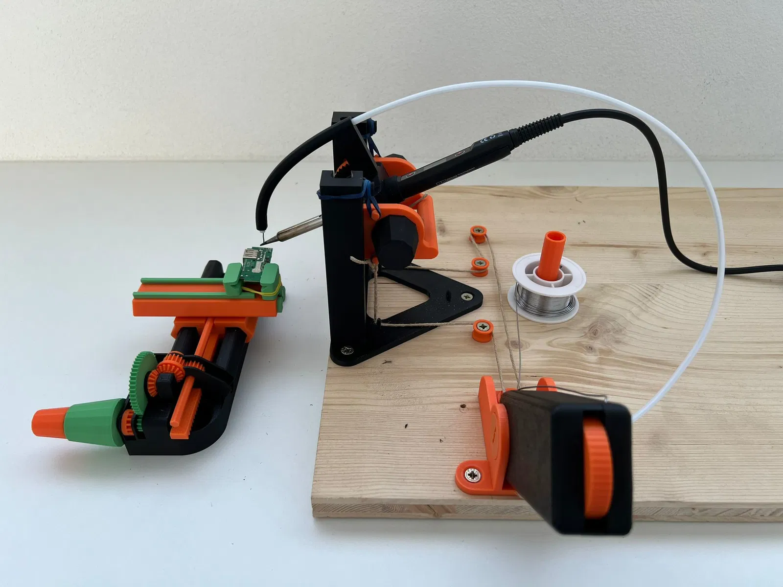- Đặt mọi thứ lên một tấm gỗ theo cách bạn thấy phù hợp nhất. Tôi đã không gắn bộ giữ PCB vì tôi thích nó linh hoạt, nhưng nó cũng có các lỗ để gắn nó. Thanh dài trong hình là bộ giữ thiếc hàn, và hai bộ dẫn dây nhỏ là bộ chuyển hướng cho dây cáp, bạn cần gắn chúng sao cho có một đường dẫn tốt từ bộ giữ mỏ hàn đến cần gạt.
