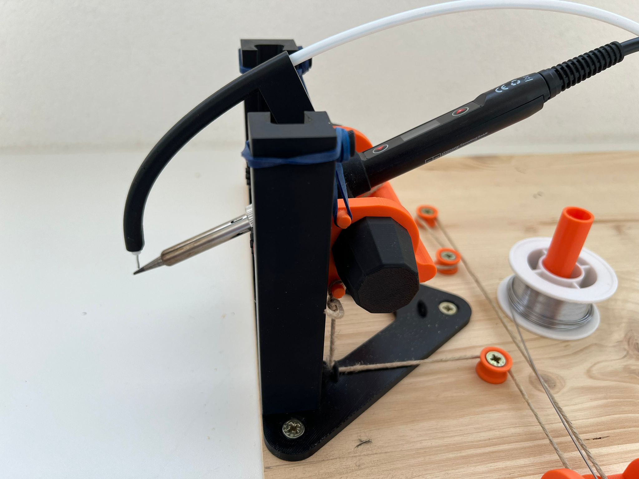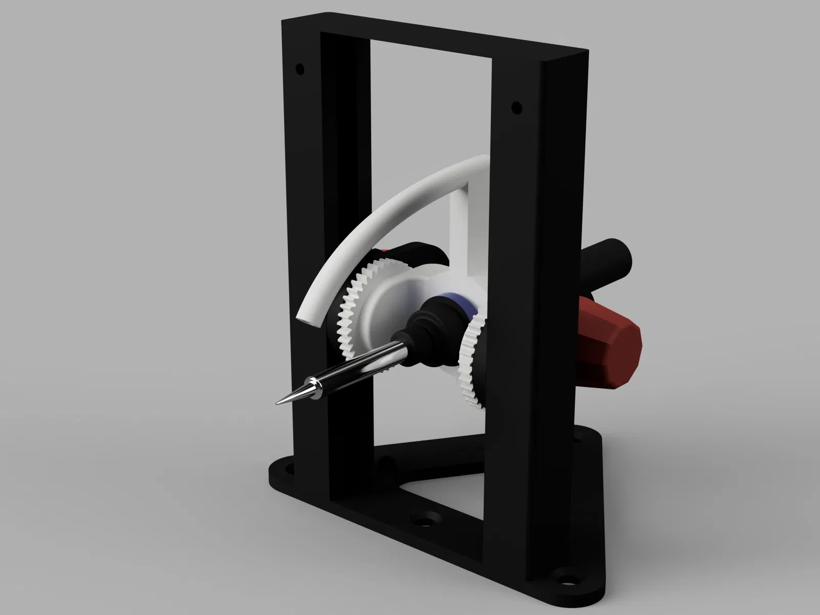Mục tiêu của mô hình này là tìm ra giải pháp để hàn các bảng mạch nhỏ (PCB). Tôi luôn gặp khó khăn trong việc giữ mỏ hàn ổn định và điều này tương đối quan trọng với các bảng mạch nhỏ. Đó là lý do tại sao tôi muốn thiết kế một dụng cụ hỗ trợ hàn để giữ mỏ hàn luôn ổn định và vẫn có thể di chuyển nó theo cả 3 trục. Điều quan trọng đối với tôi là nó có thể cấp thiếc hàn trực tiếp và bạn không cần dùng thêm một tay chỉ để làm việc đó. Tôi cũng muốn có thể thay đổi góc của mỏ hàn bất cứ lúc nào và không bị giới hạn ở một góc độ duy nhất, vì các công việc khác nhau yêu cầu các góc khác nhau.