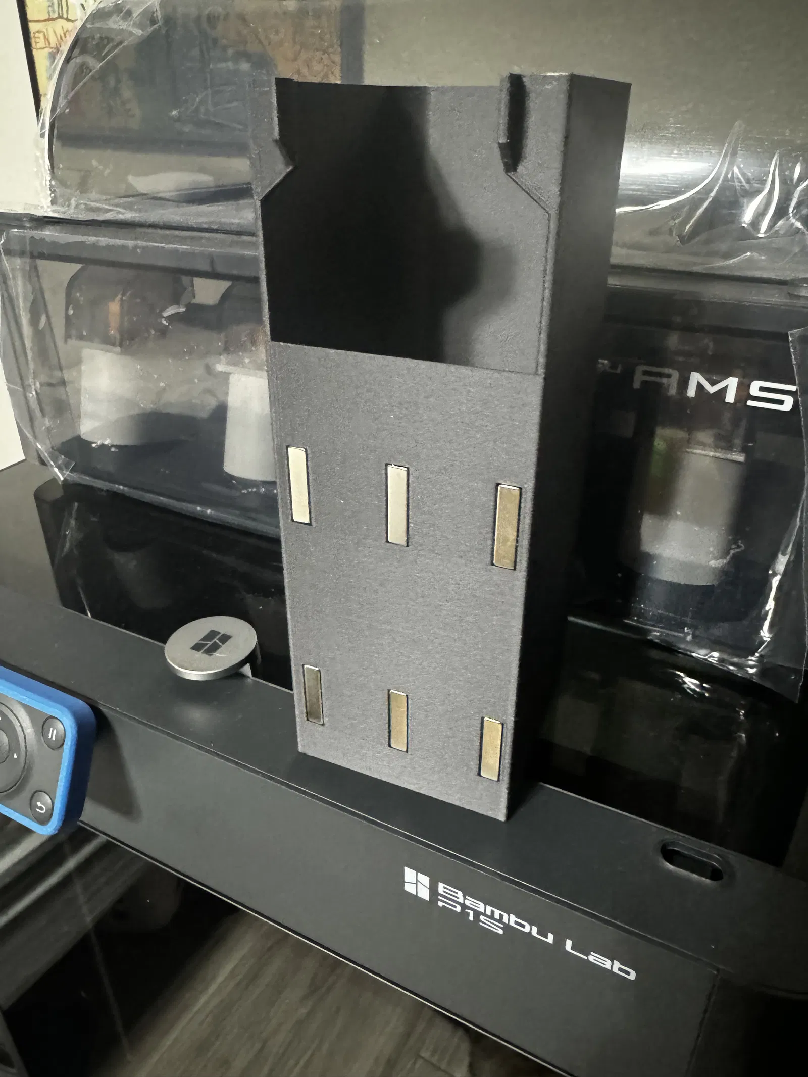 Model này dày 3mm ở đáy, 2mm ở khu vực cong, và dày 3mm ở thành nơi đặt nam châm. Tôi có nam châm kích thước 20mm x 5mm x 2mm nên tôi đã làm model với các khe cắt cho kích thước đó, file đính kèm bên dưới. Tôi cũng bao gồm một bản trống để bạn có thể nhập vào Tinkercad và cắt theo kích thước/hình dạng nam châm của riêng mình. Sử dụng sáu viên nam châm 20x5x2mm có lẽ là hơi thừa nhưng tôi không ngại vì nó dính chắc chắn vào máy in.
