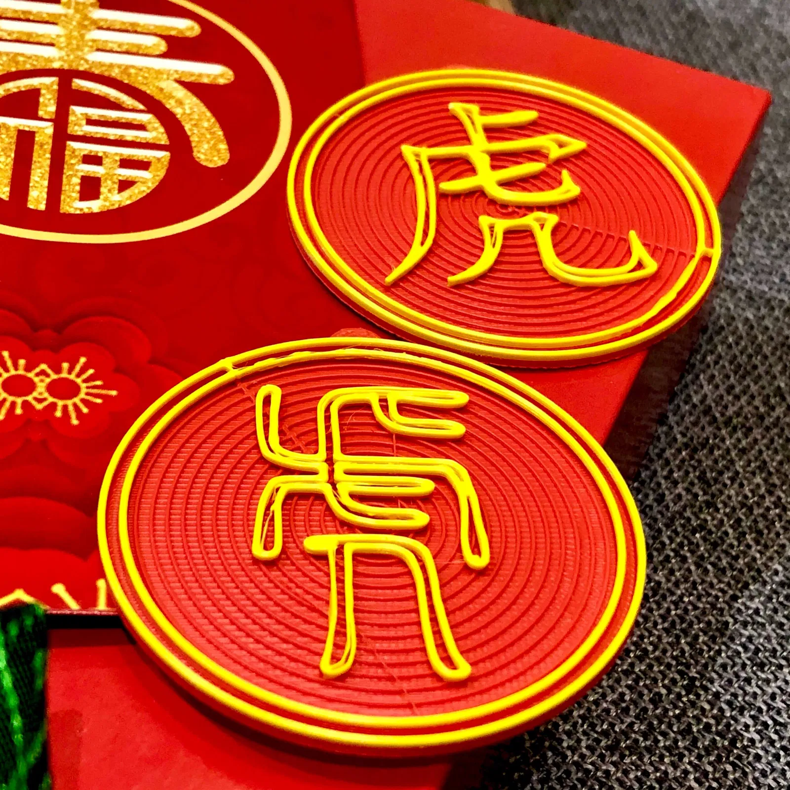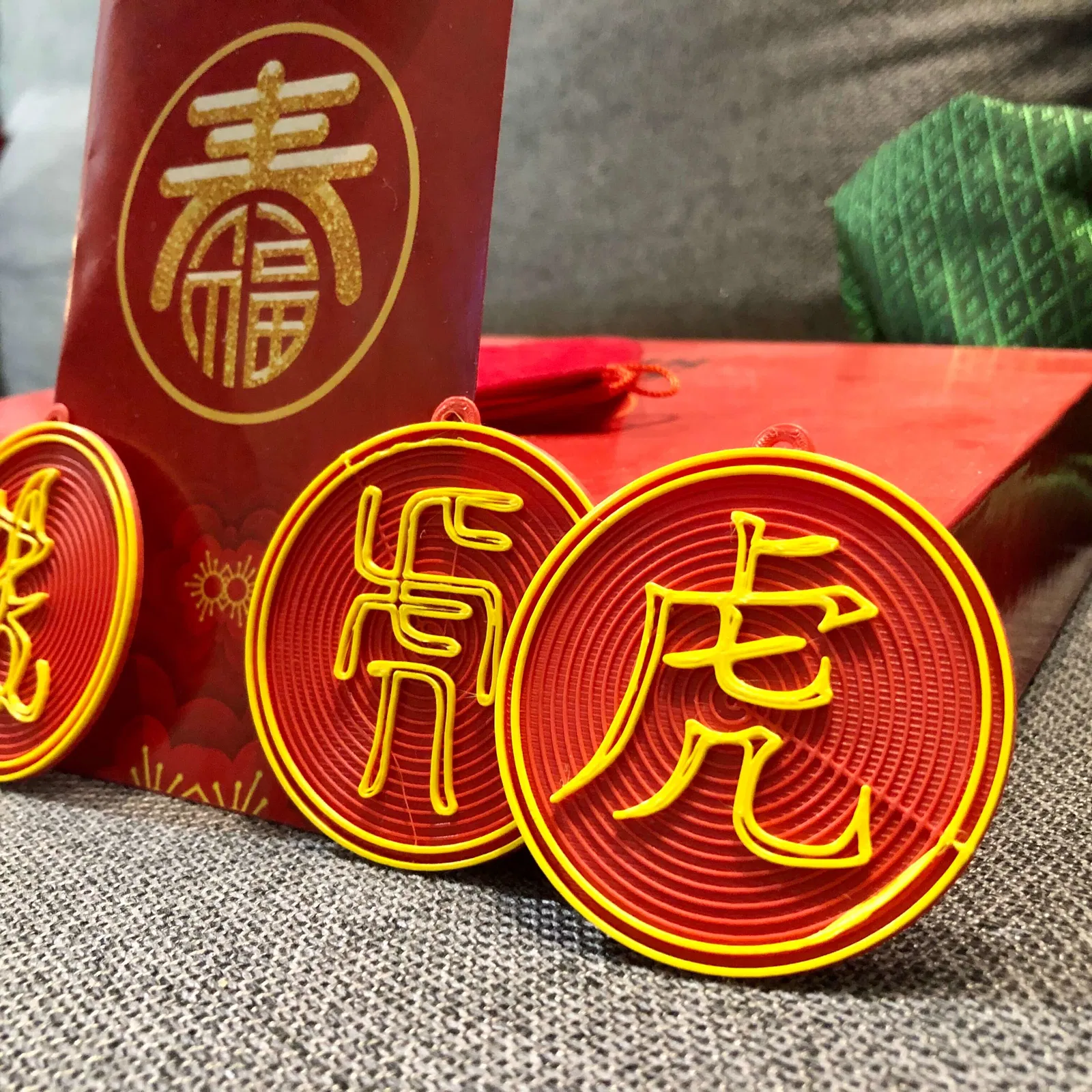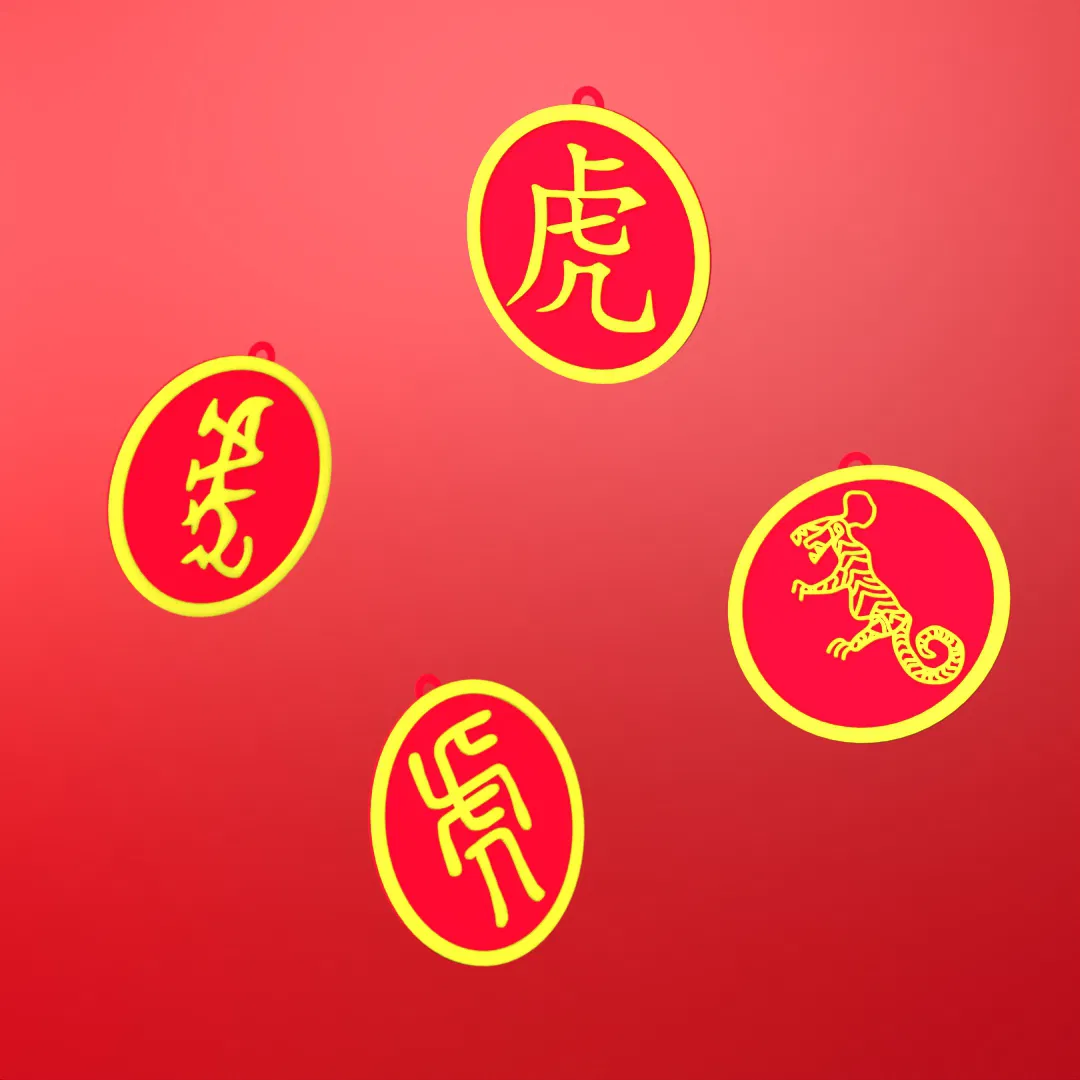 Những món treo này với sự phát triển của chữ Hán cổ tượng hình con hổ, từ dạng rất hình tượng ban đầu cho đến chữ hiện đại. Chúng có thể dùng để trang trí và mang lại may mắn khi treo trên cây, cửa, gương xe hơi, hay bất cứ đâu!