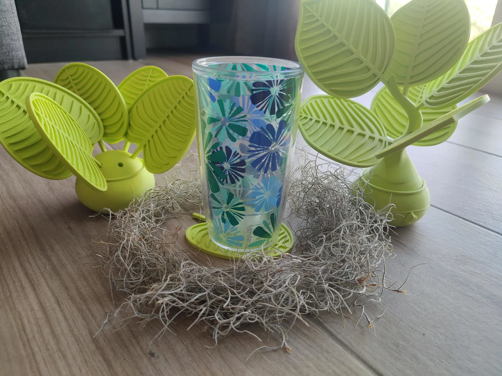 Có 2 loại lá khác nhau, 2 loại chậu khác nhau và 3 loại cây khác nhau để bạn lựa chọn. Ly có đường kính khoảng 90mm, đủ để chứa hầu hết các loại ly và cốc, trừ khi bạn có những chiếc ly "hàng độc" cỡ lớn.