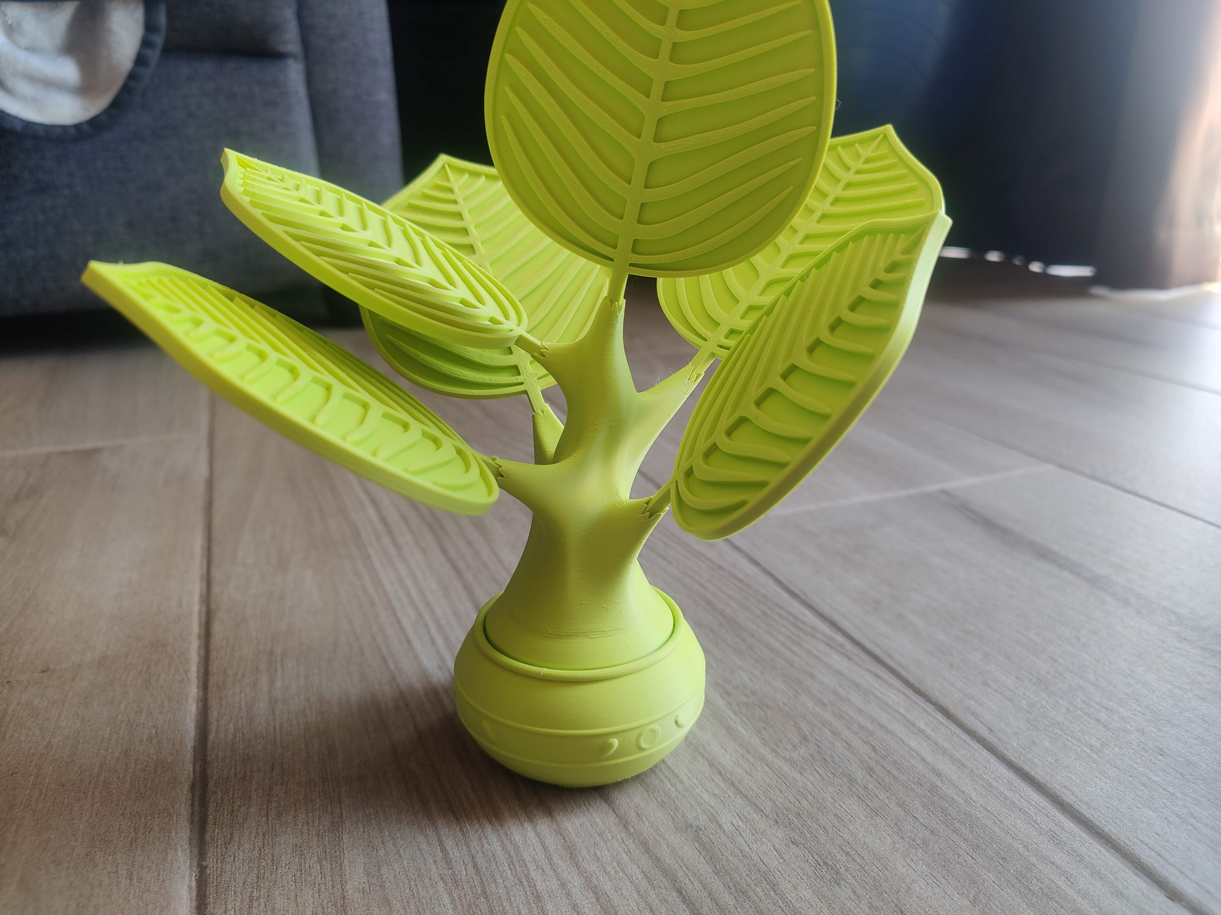 Mọi thứ đều chỉ cần ghép lại với nhau! Bạn có thể muốn đặt một viên đá hoặc một ít đất vào đáy chậu để giúp nó giữ thăng bằng trước khi đặt bộ phận cây lên trên. Sẽ khá khó để tháo bộ phận cây ra sau khi đã lắp ráp, vì vậy hãy chắc chắn bạn hài lòng với lựa chọn của mình. Phần cuống lá sẽ cắm vào các lỗ trên bộ phận cây, có nhiều vị trí khác nhau có thể đặt.