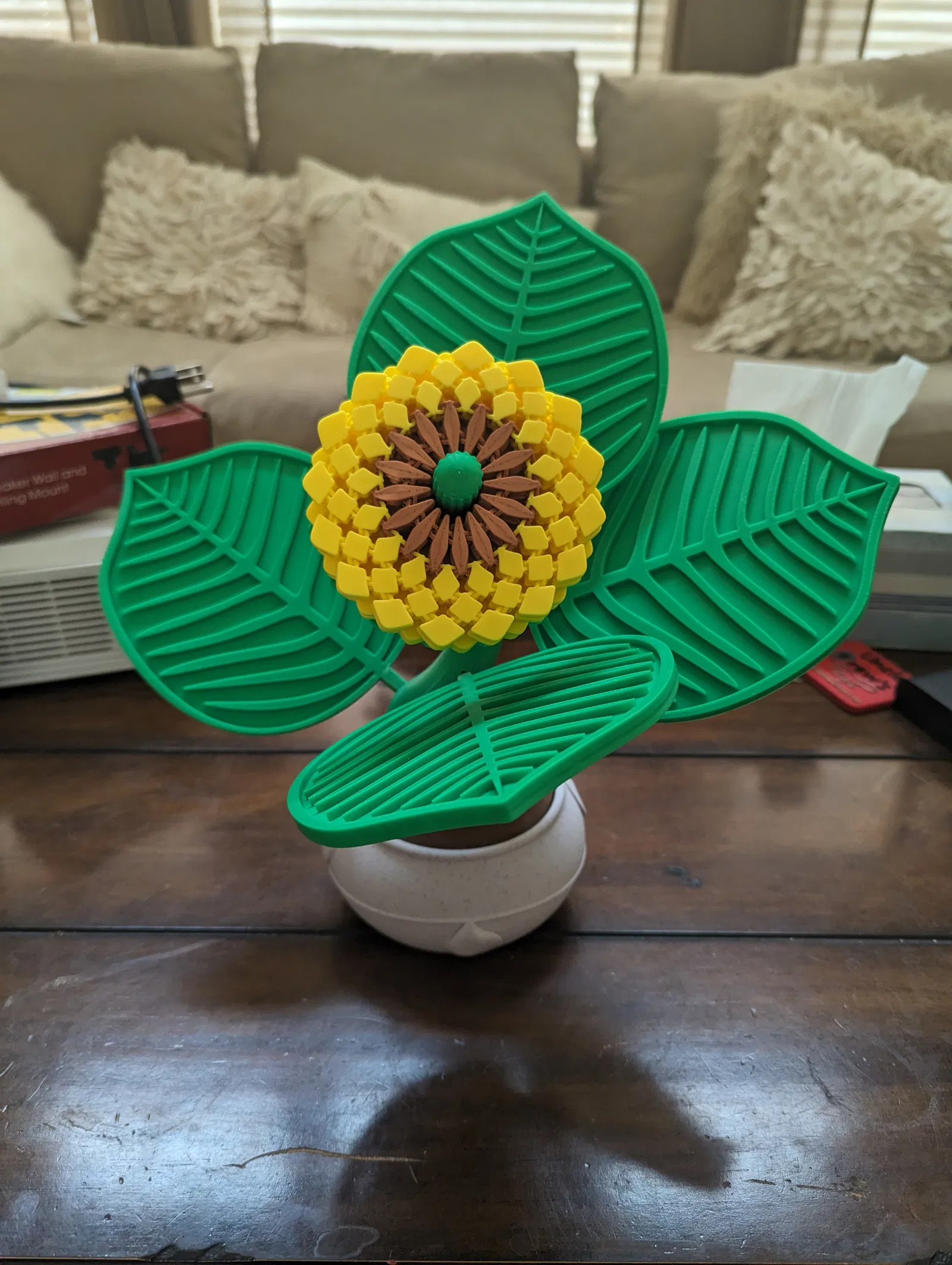 Ghép 2 mẫu đế lót ly thành 1 phiên bản lớn hơn, kết hợp hình ảnh hoa hướng dương và lá cây. Bản in này được điều chỉnh tỉ lệ, có thể chứa vừa 4-5 lá. Khuyến khích dùng file 3mf để có chi tiết âm bản đầy đủ, hoặc tự thêm khối âm bản nếu dùng STL.