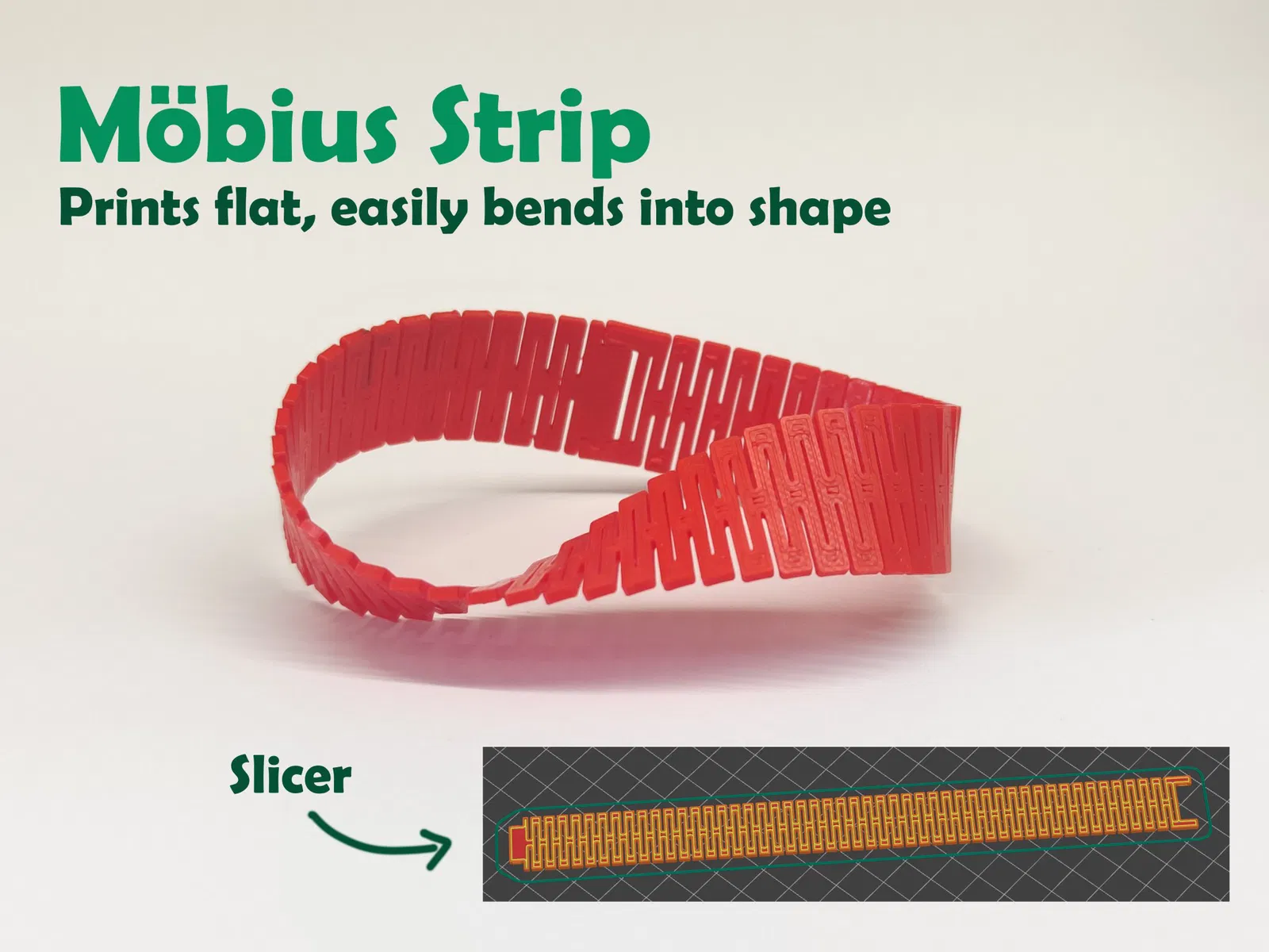 Lấy cảm hứng từ các bản in có thể uốn cong của Teaching Tech, tôi đã tạo ra dải mobius này. Kích thước không phải từ thiết kế của anh ấy, vì vậy nó thực sự hoàn toàn do tôi làm. Có một kẹp ở mỗi đầu, vì vậy sau khi in xong, bạn có thể uốn và kẹp dải lại với nhau mà không cần xử lý gì khác.