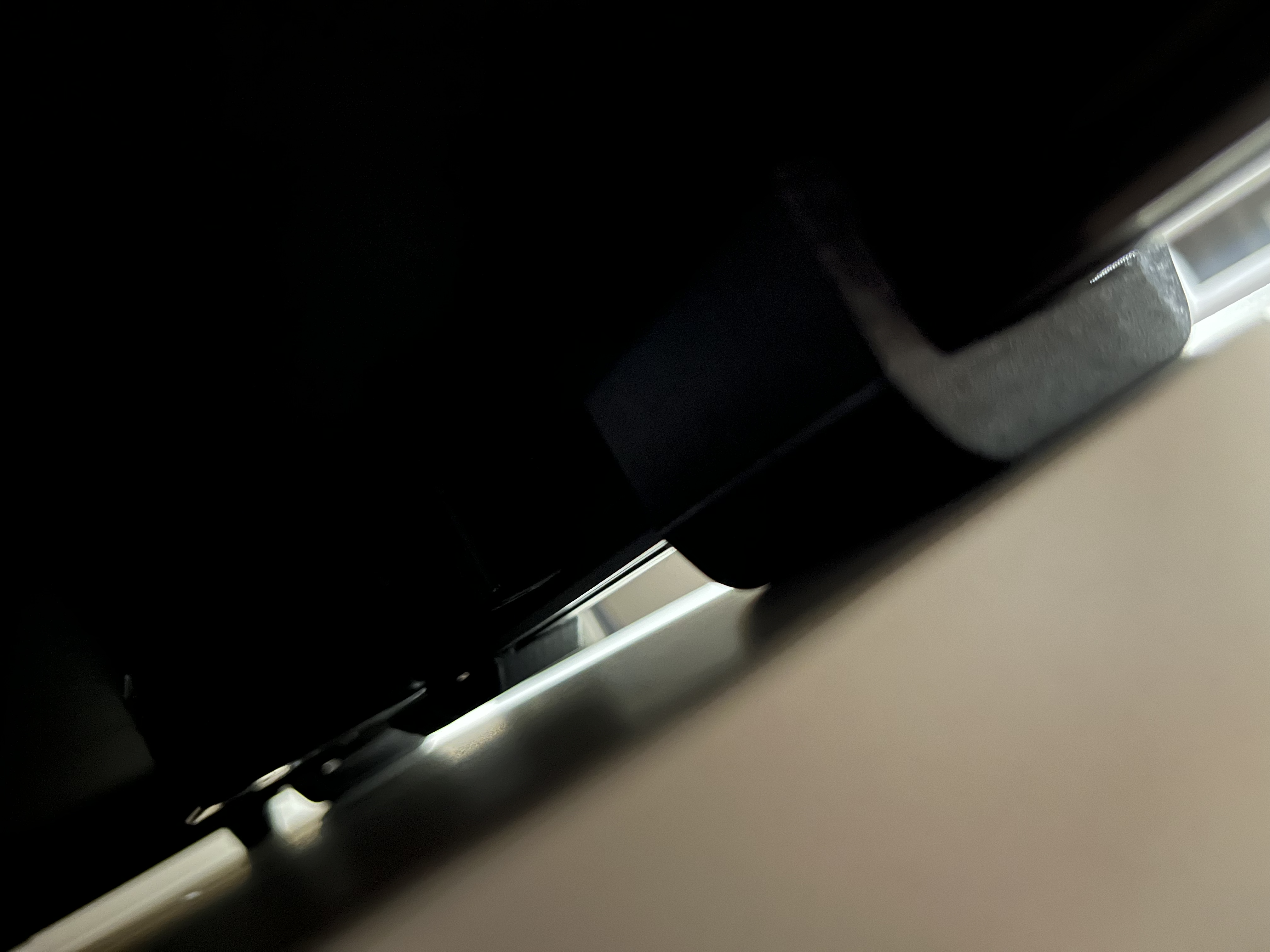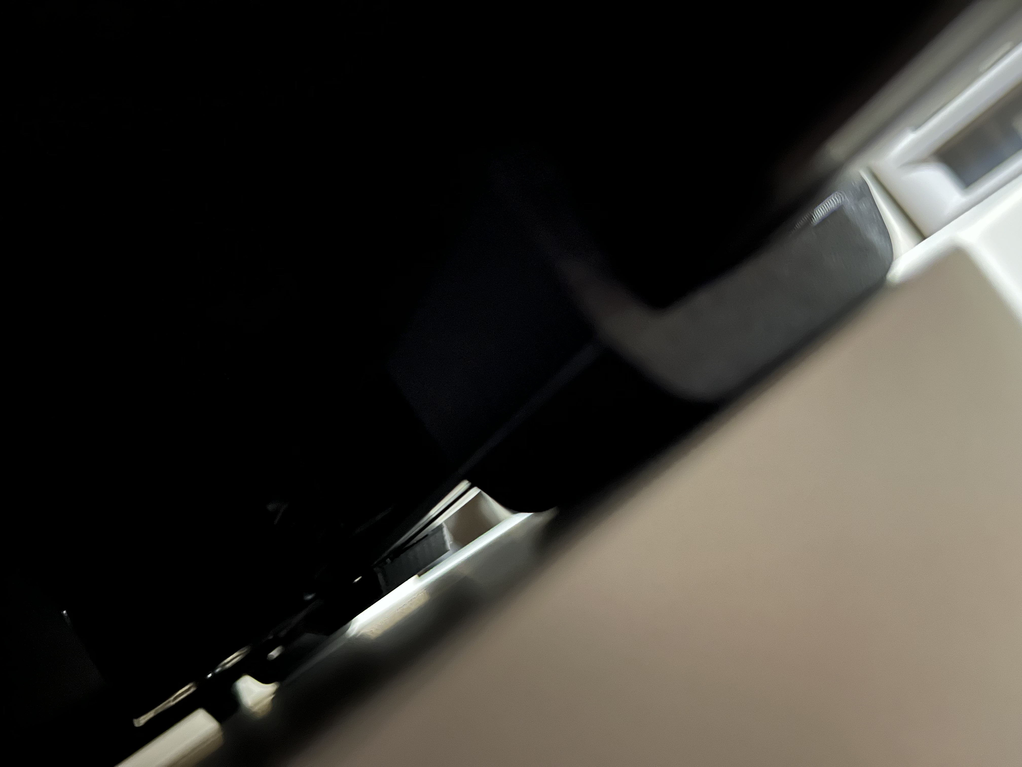 Máy XL to hơn cái bàn tui để, nên nó bị thòng ra ngoài mép. Mấy cái chân đi kèm theo máy bị lơ lửng trên không và nó dựa vô mấy cái kẹp nhựa che rãnh dây cáp. Tui làm mấy cái chân đơn giản này để có thể dồn cái máy in ra ngoài mép bàn mà vẫn giữ cho nó vững.