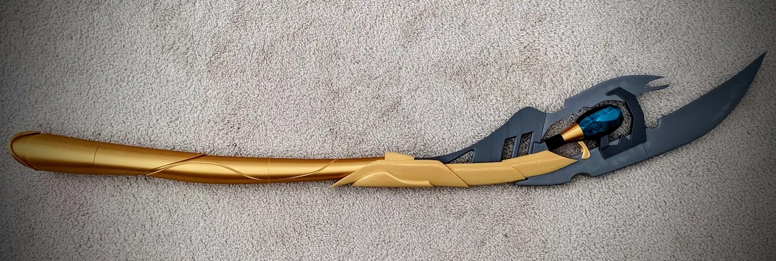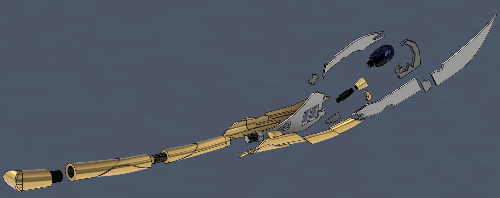 4 . Tiếp theo, sử dụng các bộ phận kết nối lưỡi kiếm để nối phần lưỡi kiếm dưới cùng với thân lưỡi kiếm chính và phần đầu với lưỡi kiếm dưới cùng. Tùy thuộc vào máy in của bạn, bạn có thể cần chà nhám hoặc keo CA ở đây. Gắn phần lưỡi kiếm trên cùng bằng bộ phận kết nối của nó. Thanh đỡ lưỡi kiếm cũng nên được gắn vào đây. Dễ nhất là căn chỉnh chốt ở trên cùng bên trong lỗ lưỡi kiếm trên cùng, sau đó gắn lưỡi kiếm trên cùng vào thân lưỡi kiếm chính trong khi ấn xuống thanh đỡ lưỡi kiếm để lắp nó vào các bộ phận dưới cùng của lưỡi kiếm.