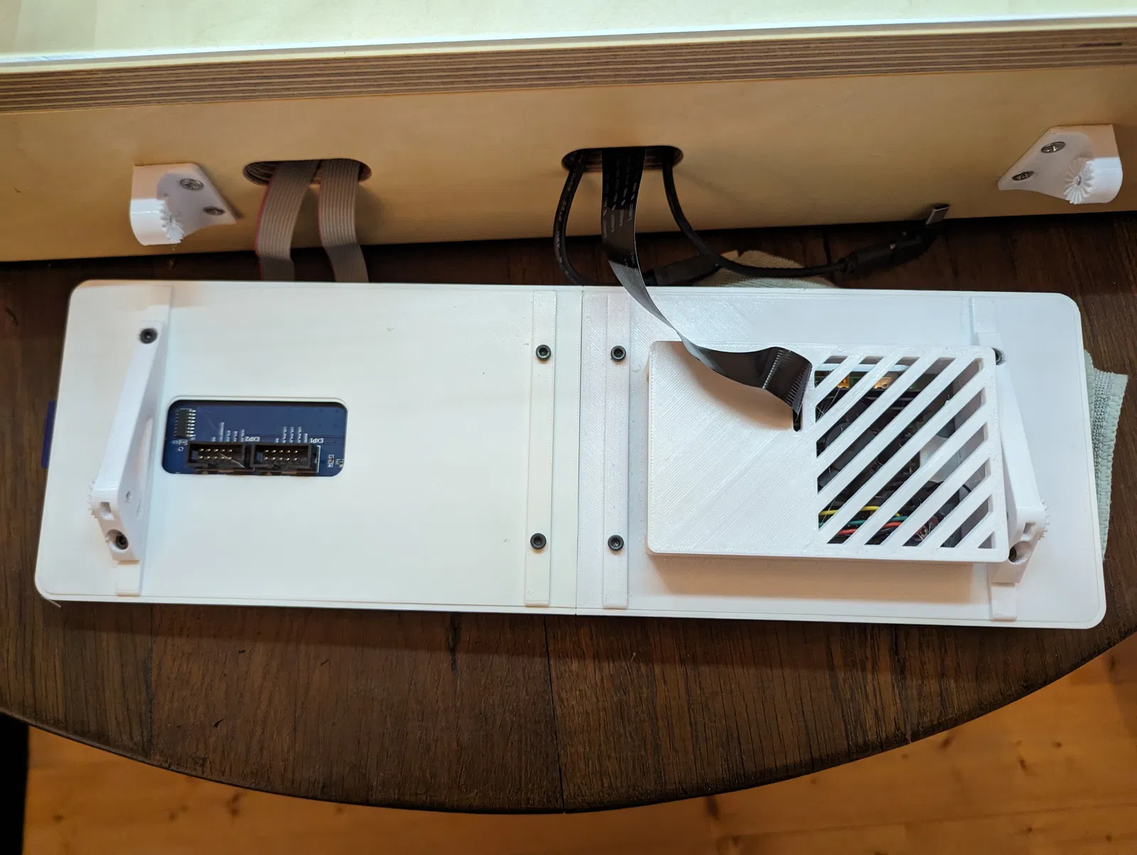 - Sau đó bạn có thể gắn phần màn hình cảm ứng, đặt màn hình cảm ứng, phần mặt sau, cũng như bộ phận đỡ vào. Lưu ý: trước khi làm vậy, bạn cần lắp ráp Raspberry Pi vào màn hình cảm ứng, kết nối dây, cho thẻ nhớ microSD với ảnh Octoprint vào, và kết nối camera Pi bằng cáp dẹt nếu có. Bạn sẽ không thể làm điều đó sau khi đã lắp ráp xong. Bạn sẽ cần tháo vít phần mặt sau màn hình cảm ứng nếu muốn truy cập thẻ SD, hoặc rút cáp dẹt. Các cổng HDMI, âm thanh, Ethernet và USB của Raspberry Pi vẫn có thể truy cập được khi bảng điều khiển được lắp ráp hoàn chỉnh.