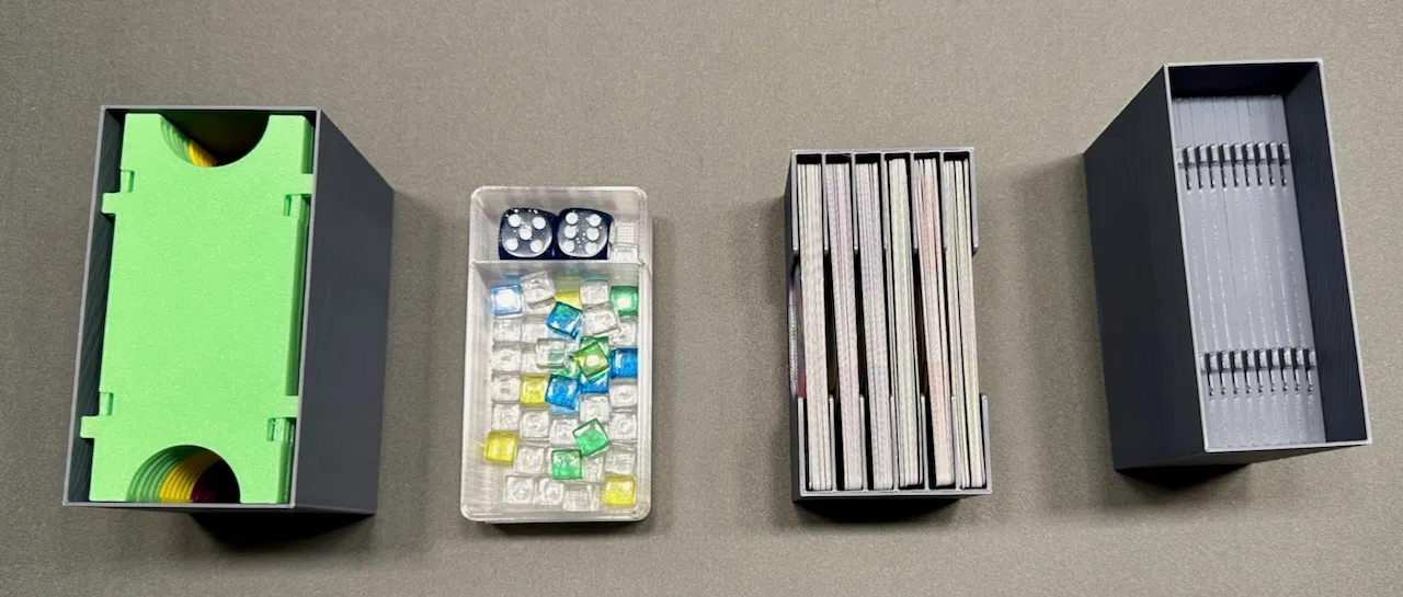 ]. Bộ insert này thay thế hoàn toàn bộ insert bằng nhựa hút chân không đi kèm với phiên bản gốc của trò chơi. (Bộ insert này sẽ không dùng được cho Space Base: Command Station.) Không giống như hầu hết các mô hình game khác của tôi, mô hình này KHÔNG hỗ trợ thẻ bài có bọc (sleeved cards). "cube box" và nắp của nó, cũng như các hộp thẻ tàu thuyền in tốt nhất ở độ cao lớp 0.16 (nozzle 0.4) nhưng 0.20 là ổn cho mọi thứ khác. Bạn thực sự muốn sử dụng 0.16 (hoặc thấp hơn) cho các hộp có nắp vì có một số phần nhô ra nhỏ nhưng dốc được hỗ trợ tốt hơn nhiều bởi độ cao lớp nhỏ hơn một chút. (Kiểm tra bản xem trước của bạn.) Không cần supports nếu bạn in ở 0.16 hoặc thấp hơn. Tôi đã in những thứ này với độền 15% infill dạng gyroid, nhưng bạn có thể sử dụng độền 10% infill nếu bạn tăng thêm một lớp shell phía trên (hoặc nếu bạn không quan tâm đến những khiếm khuyết nhỏ ở đáy hộp). PLA/PLA+ hoạt động tuyệt vời cho tất cả các bộ phận này. Cuối cùng, các nắp của tất cả các hộp được lắp khít bằng ma sát và vừa với đáy hộp của chúng để không bị lạc trong quá trình chơi. Dung sai trên các bộ phận này có thể hơi khít, nhưng chúng đã được in ra rất đẹp trên máy Bambu X1C của tôi. Lưu ý dành riêng cho từng mô hình: colony_tile_box.stl - In một cái. Được thiết kế để chứa 12 ô colony tile từ mô hình Space Base Card Grid của tôi. cube_box.stl, cube_box_lid.stl - Chứa tất cả các khối lập phương trong suốt cũng như một cặp xúc xắc. In một cái cho mỗi loại. Bạn có thể in chúng cùng nhau trên cùng một khay. player_cards_box.stl - Chứa 5 bộ thẻ khởi đầu của người chơi và 12 thẻ colony. Thẻ người chơi bắt đầu cũng có thể được lưu trữ cùng với thẻ colony. In một cái. ship_cards_box.stl - Chứa các chồng thẻ rút cho thẻ shipyard. In ba cái (với các màu tương ứng, nếu muốn). shipyard_tile_box.stl - In một cái. Chứa 18 ô lưới shipyard cộng với một vài ô lấp đầy từ mô hình Space Base Card Grid của tôi. filler_box_1.stl, filler_box_2.stl - In một cái cho mỗi loại. Chúng chỉ để ngăn các bộ phận khác trượt xung quanh trong hộp. Bạn có thể đặt đồ vào chúng nếu muốn.