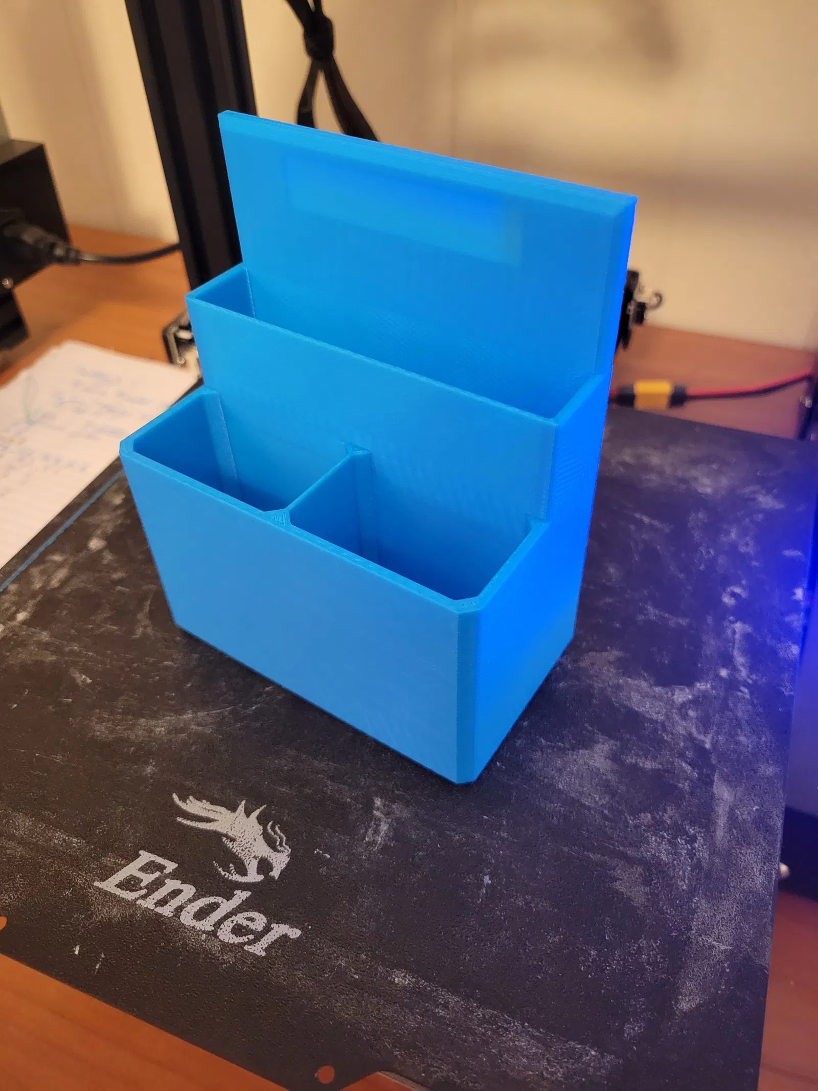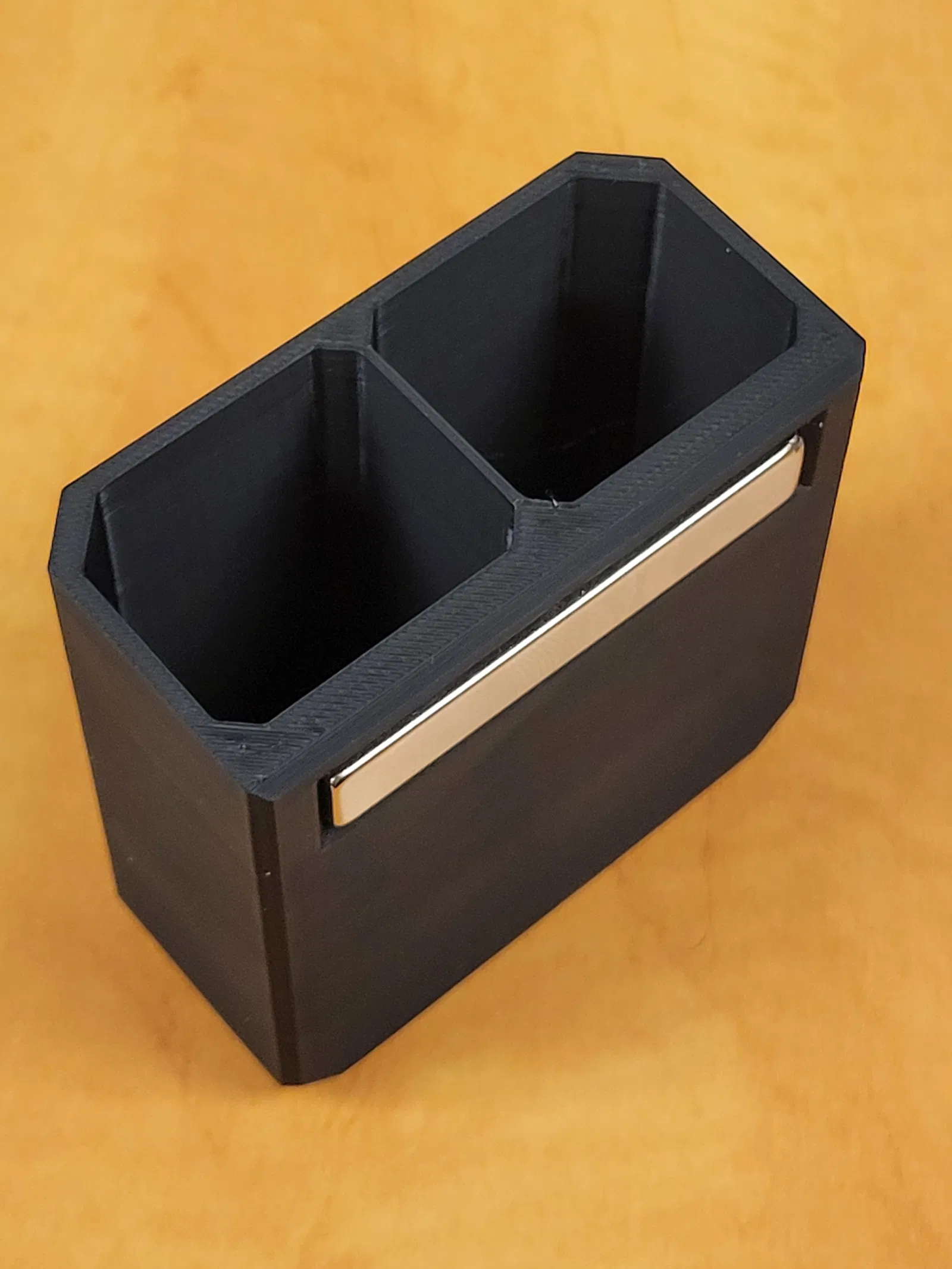 Cái này là cái đế đựng bút xịn xò, có nam châm gắn lên bảng nè. Dùng nam châm thanh 60 x 10 x 5mm. In ngon lành, không cần support, có thêm mẫu cho 3 nam châm và để sổ tay luôn.