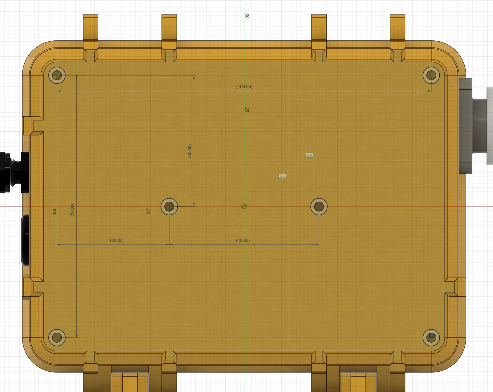 Hệ thống gắn ở mặt sau của vỏ gồm bốn lỗ cách nhau 100mmx70mm hình vuông và hai lỗ ở giữa cách nhau 40mm (xem hình). Mấy cái lỗ này không đục xuyên qua vỏ nha, nên nước không có bị lọt vô được. Chúng có kích thước vừa cho ốc cài nhiệt M3x4.6x6mm.