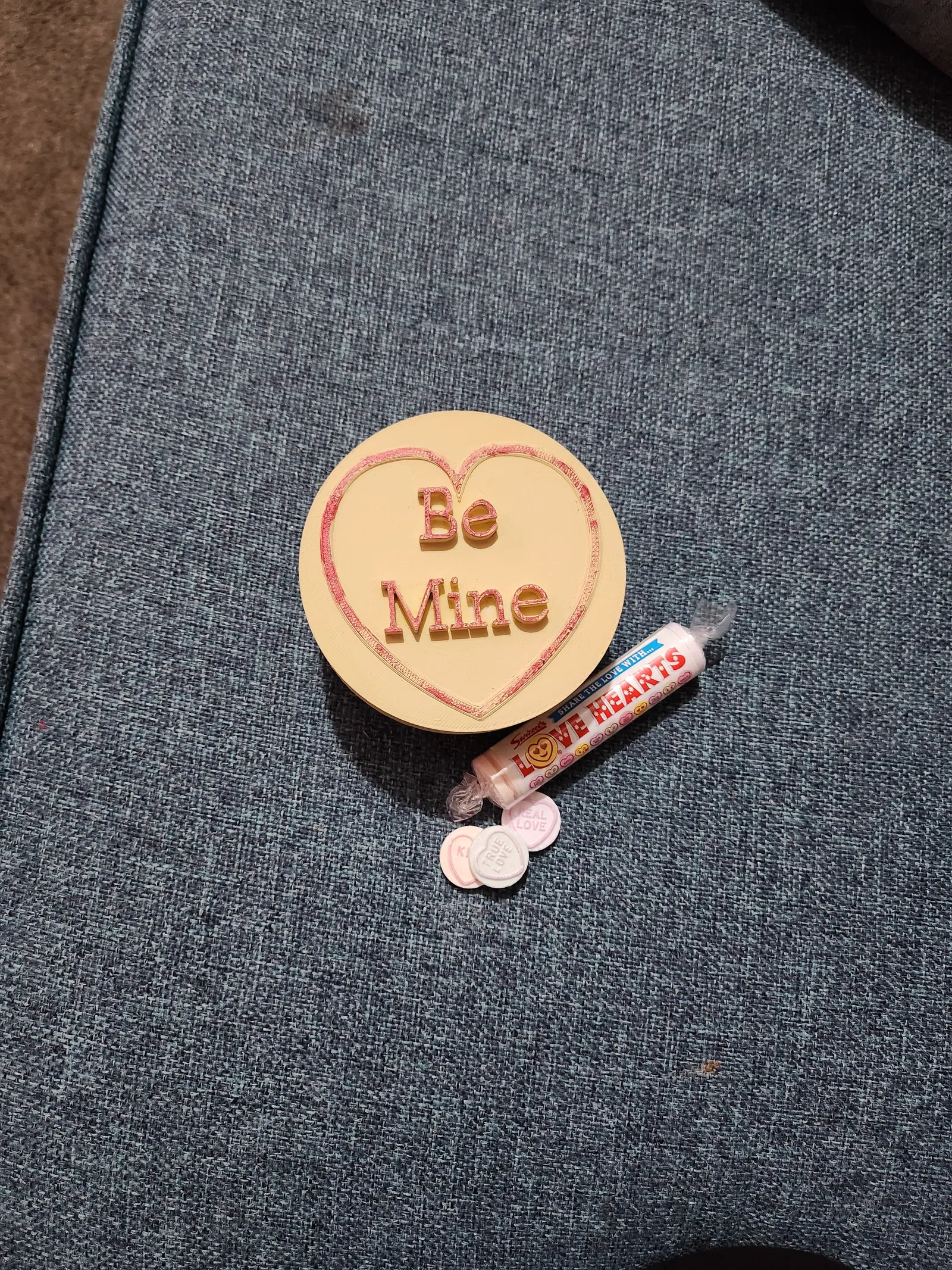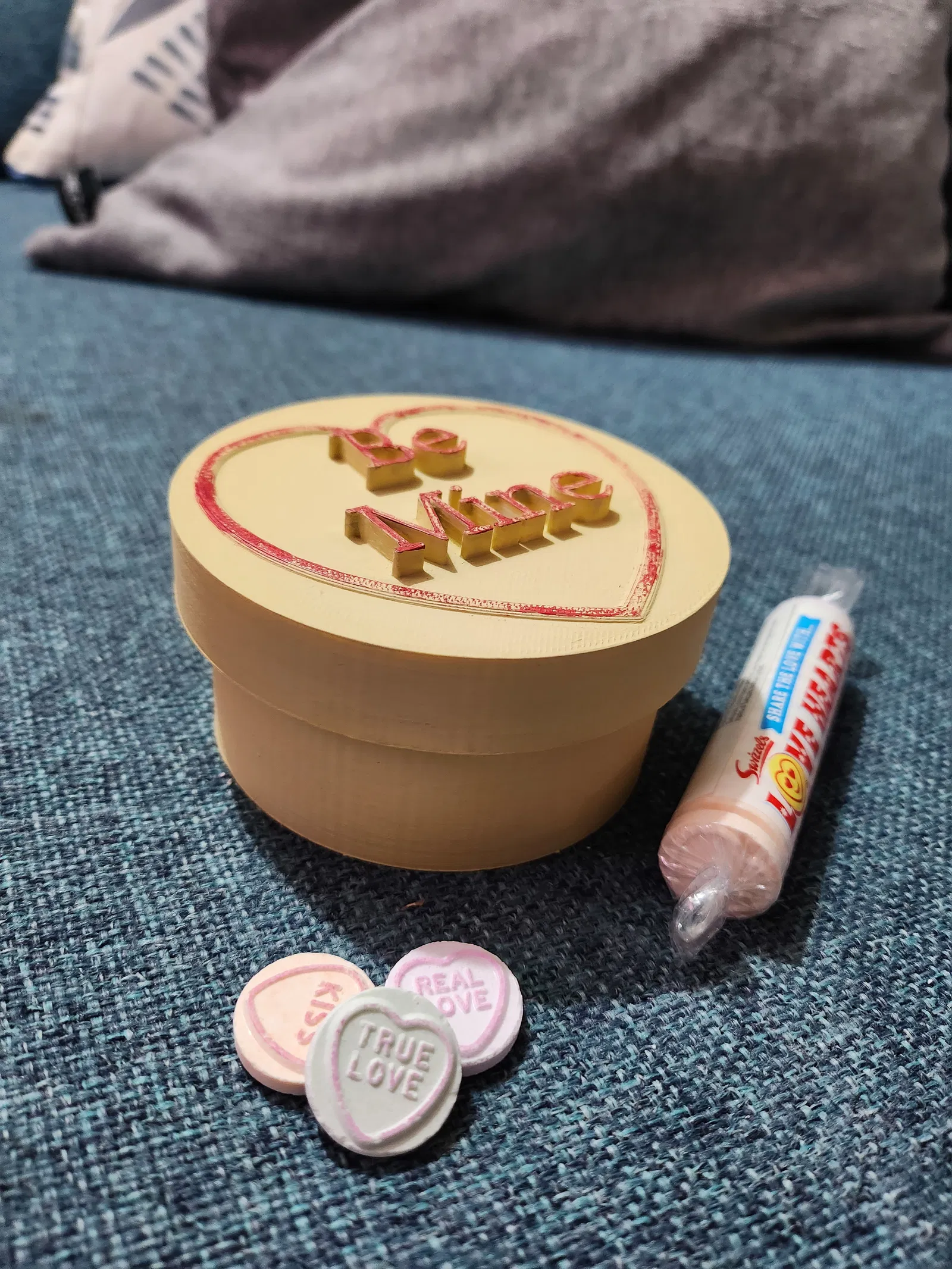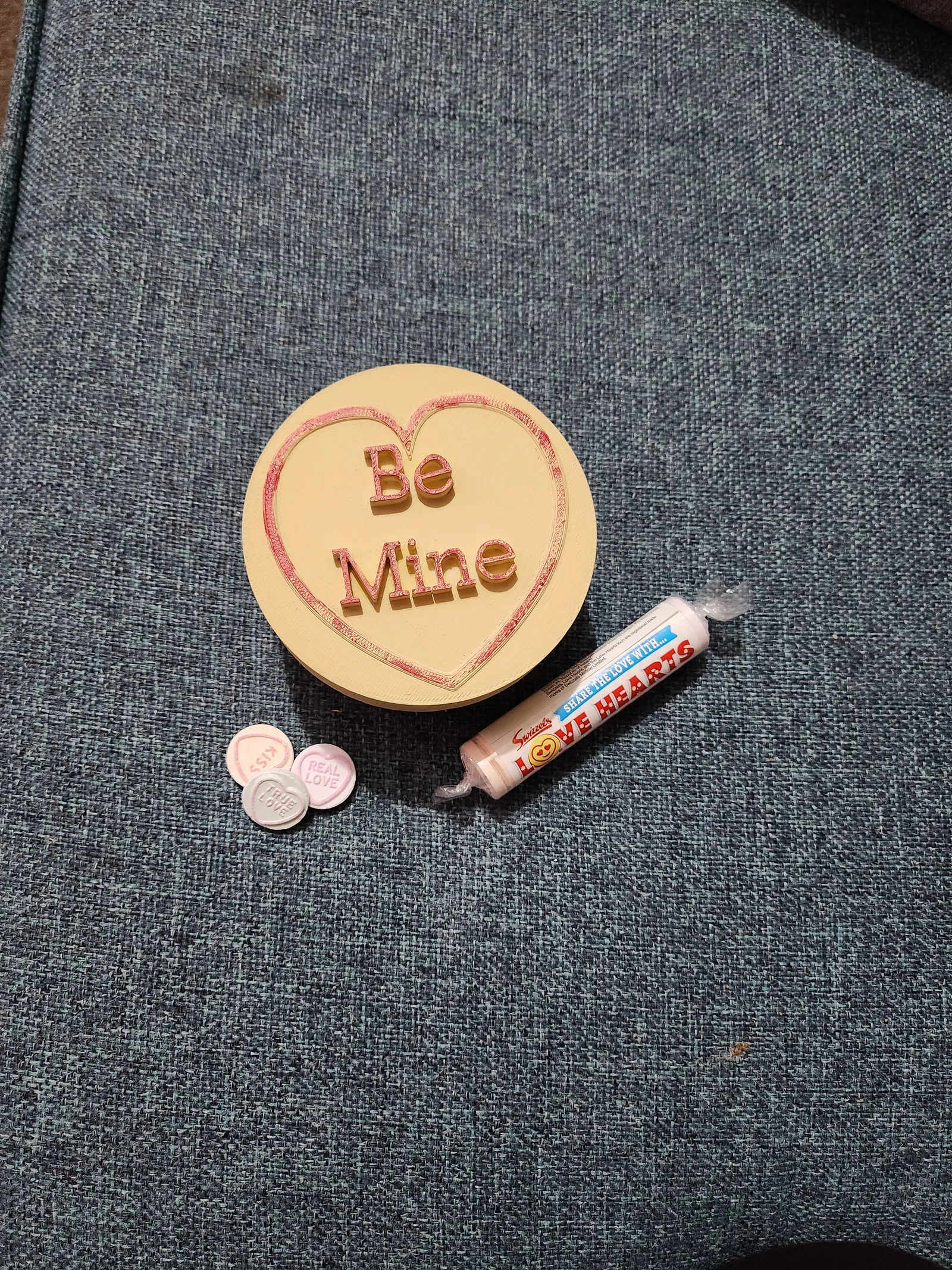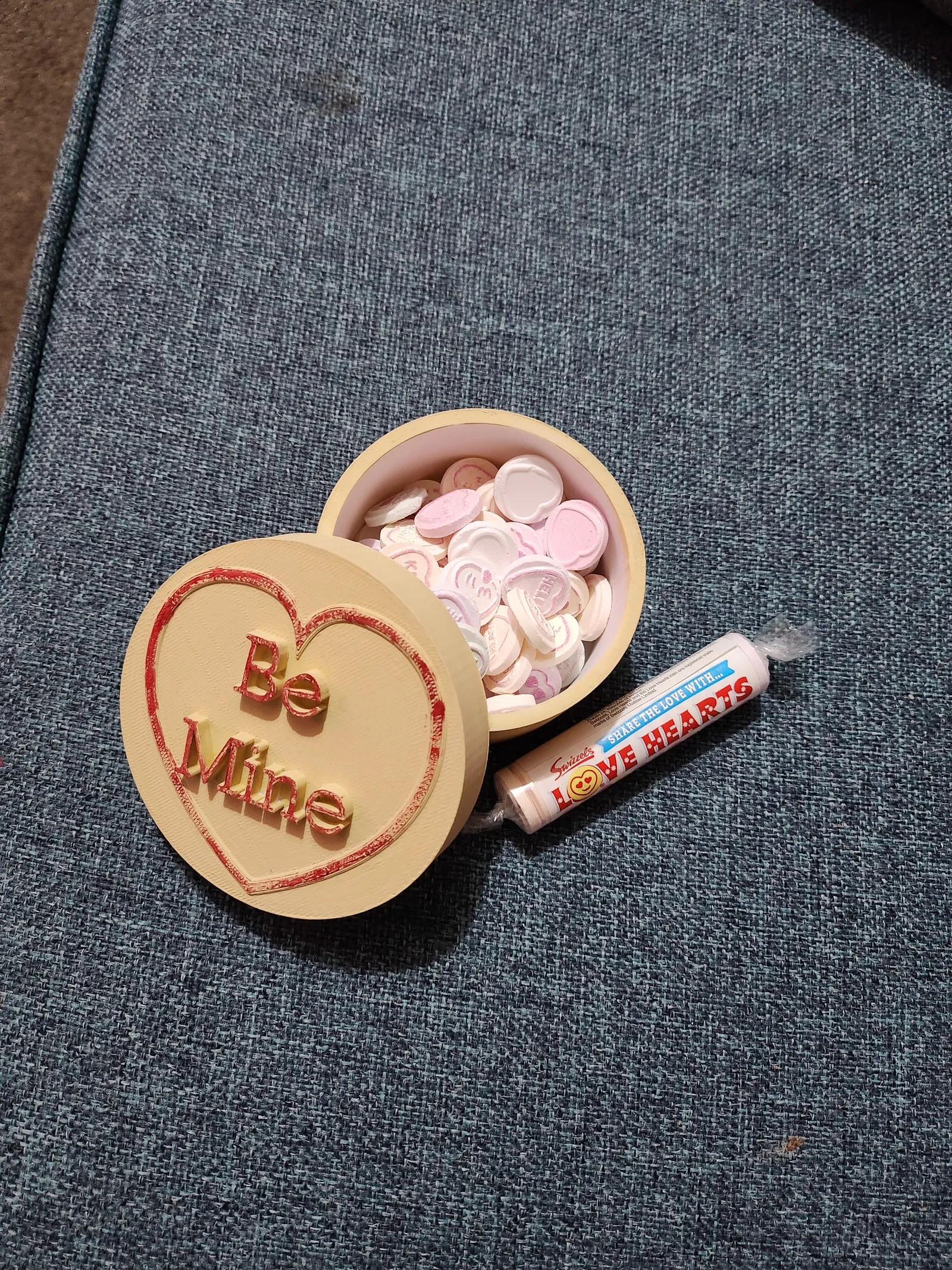 Mô hình 3D kẹo "love hearts" kiểu cổ điển, thiết kế hộp quà có chữ "Be Mine" trên nắp, thích hợp làm hộp đựng trang sức hoặc quà tặng Valentine ý nghĩa. In với chiều cao lớp 0.2mm, không cần support, 3 lớp tường và 10% infill.