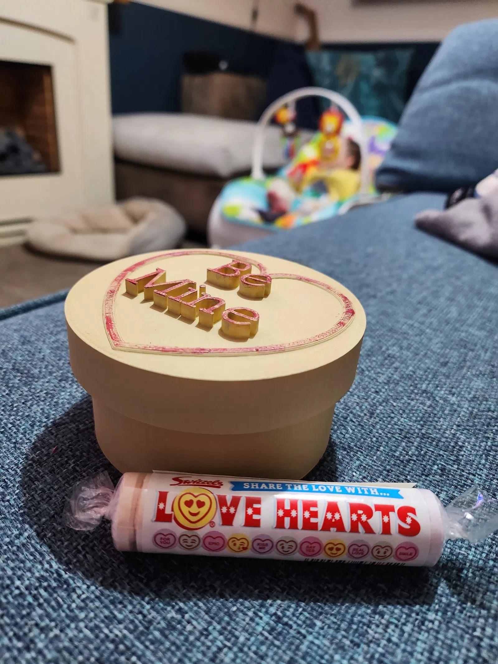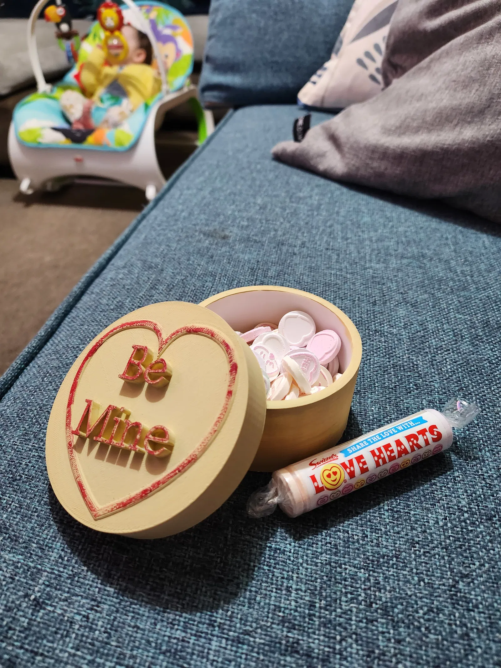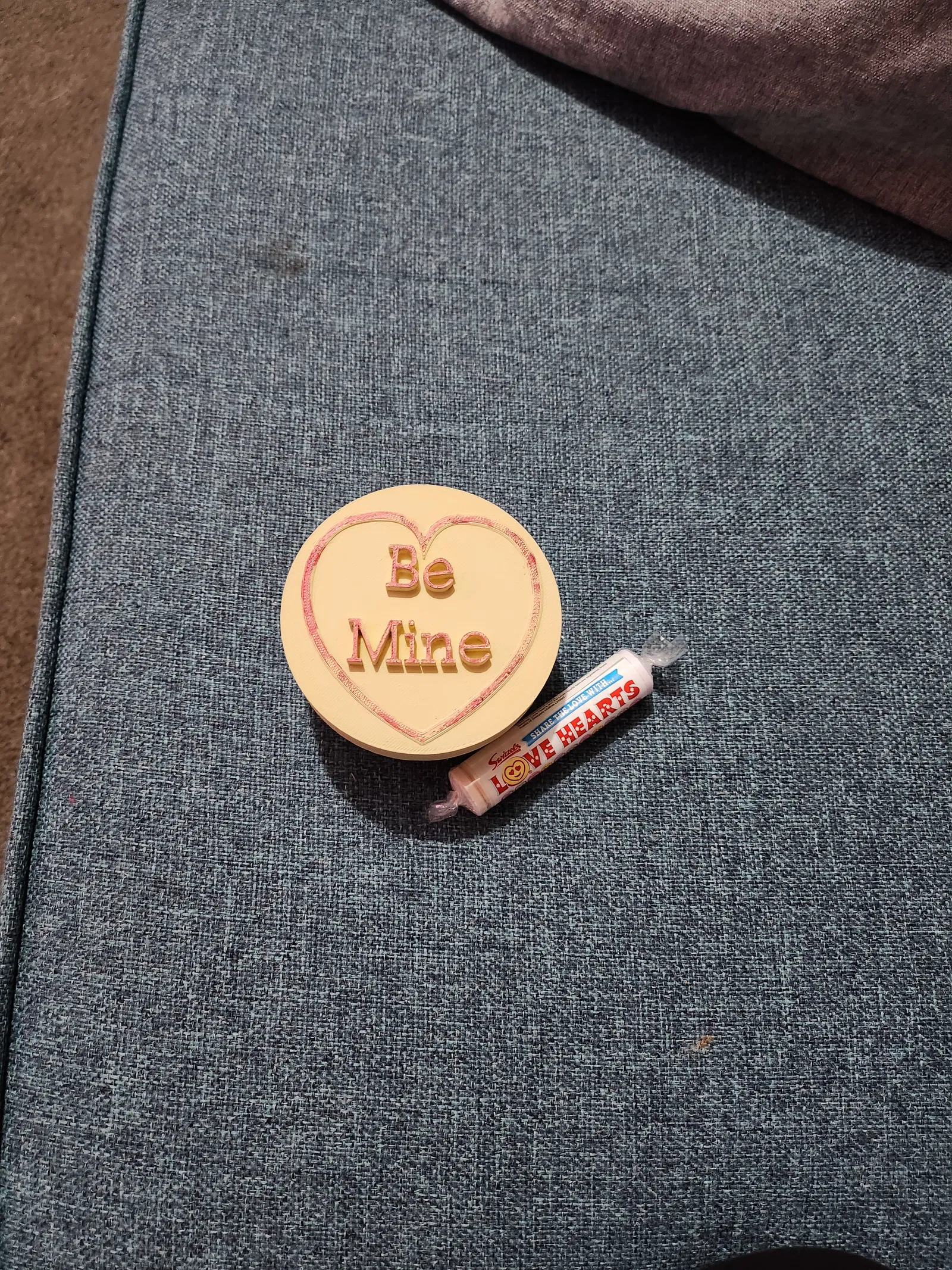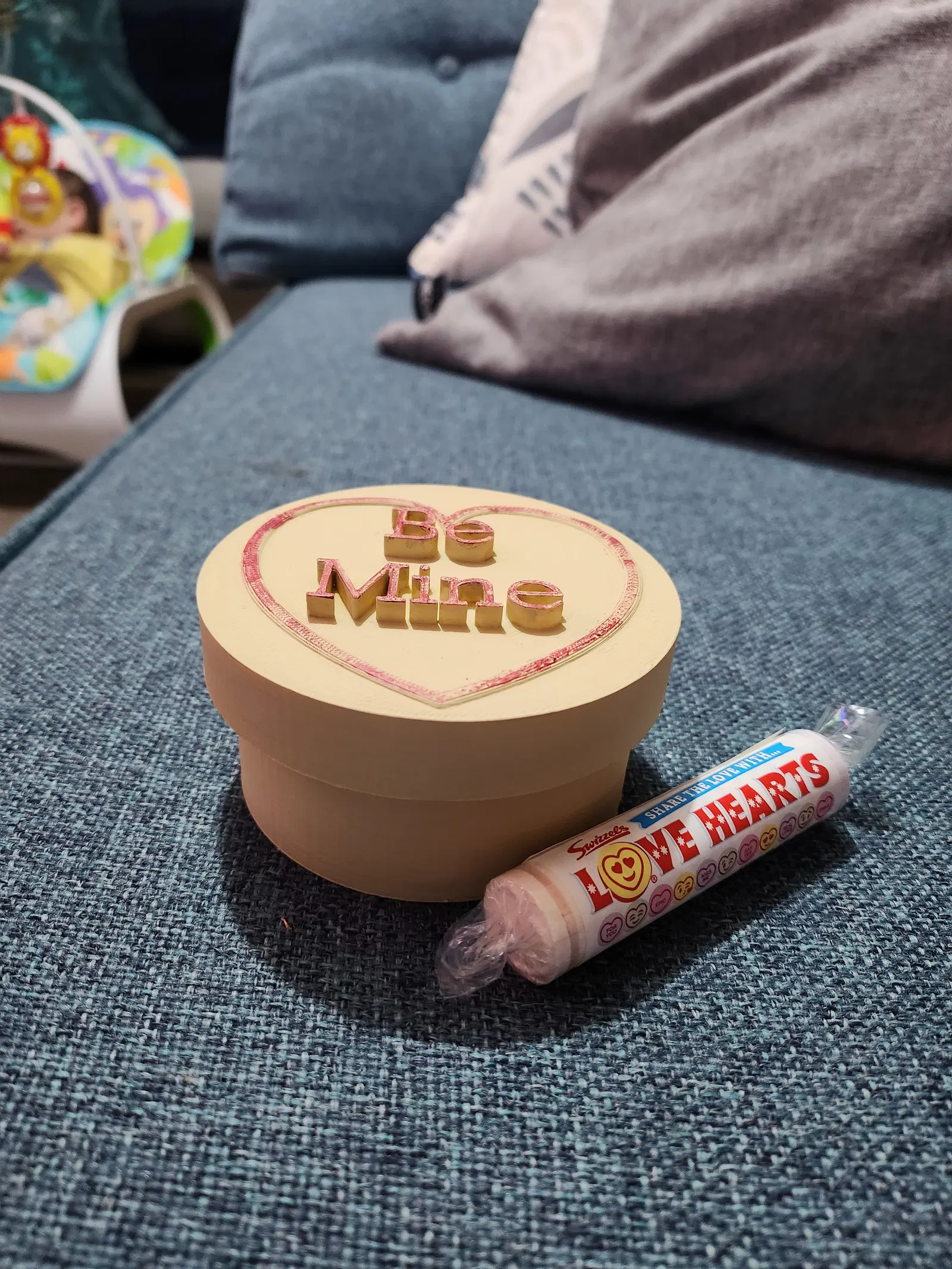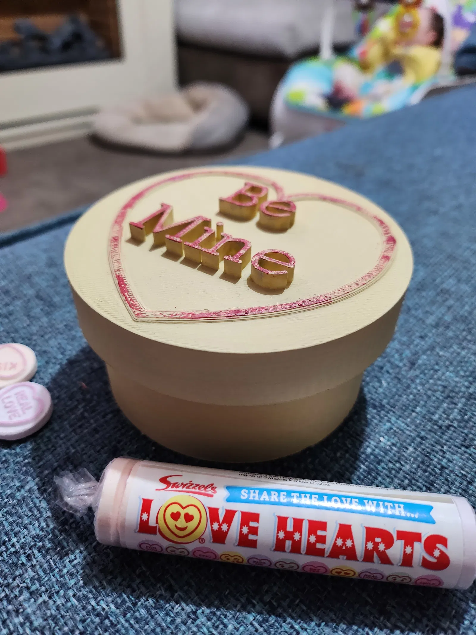 Mô hình 3D kẹo "love hearts" kiểu cổ điển, thiết kế hộp quà có chữ "Be Mine" trên nắp, thích hợp làm hộp đựng trang sức hoặc quà tặng Valentine ý nghĩa. In với chiều cao lớp 0.2mm, không cần support, 3 lớp tường và 10% infill.