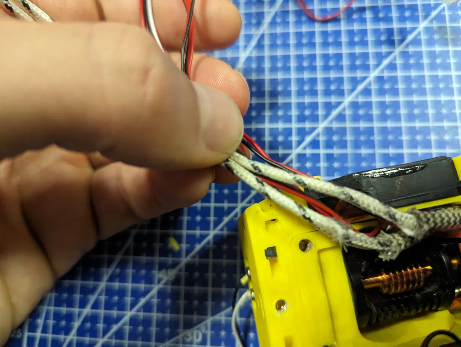 - Cẩn thận lắp bộ phận đầu in, đảm bảo dây không bị kẹp và dây đai không cọ vào khung máy. Phần lớn dây cáp sẽ đi vào khe được khoét ở quạt bên phải, phía bên kia sẽ có đủ không gian cho dây đầu dò và quạt.