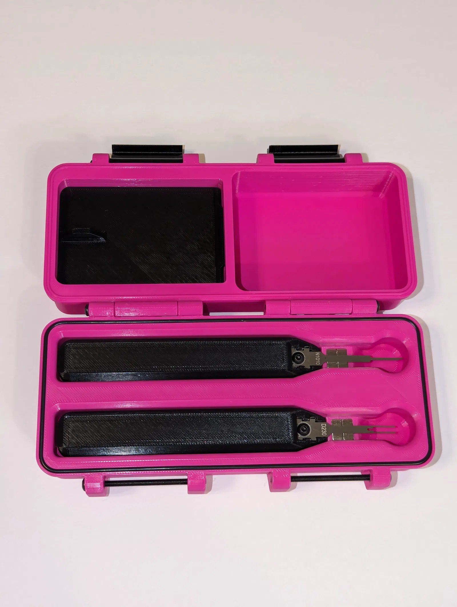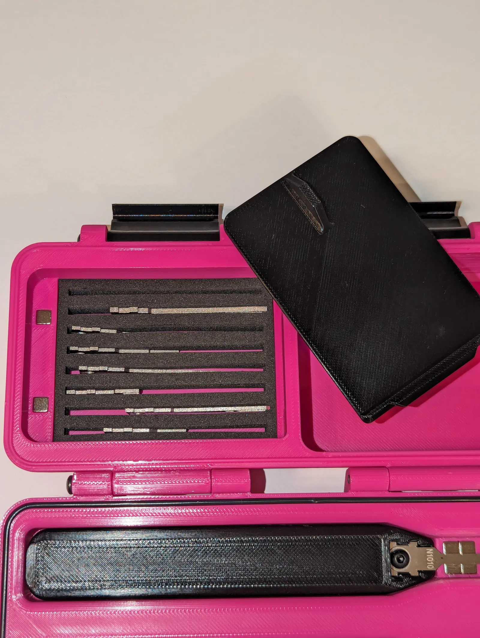 Cái hộp đựng được hai tay cầm và có một cái nắp để đựng mấy cái đầu thay thế trong khối xốp mà chúng đi kèm. Có hai viên nam châm 5x5x5mm giữ cái nắp hộp lại. Bạn cần dán/băng keo vài cái long đền hoặc miếng thép mỏng lên mặt sau của nắp để nó hút vào nam châm. Ngoài ra còn có tám viên nam châm tương tự giữ mấy cái kìm lại.