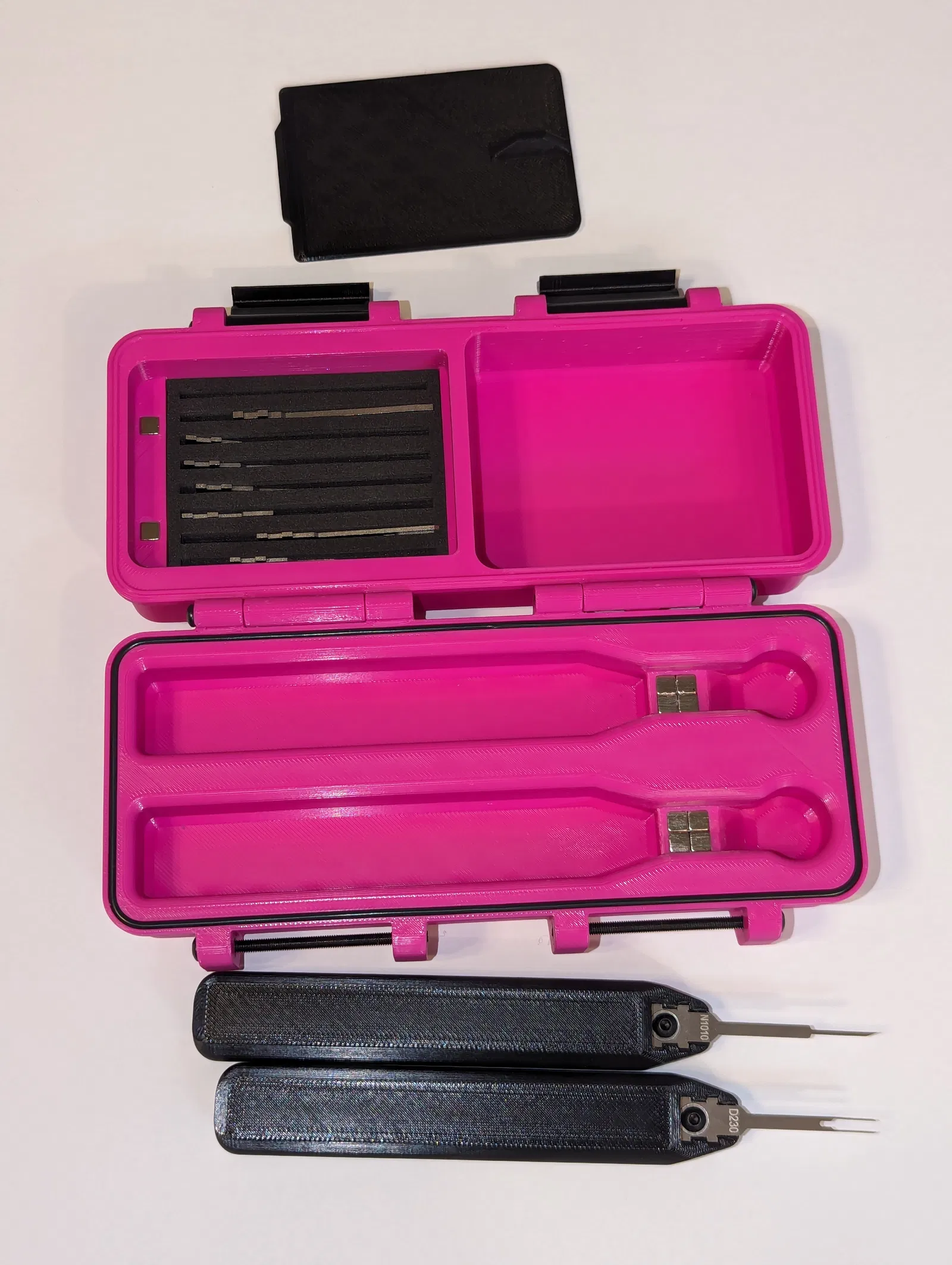 Bộ dụng cụ rút pin này bao gồm tay cầm DIY và hộp đựng cứng cáp, có thể chứa hai tay cầm và các đầu rút pin thay thế. Hộp còn có ngăn đựng nam châm tiện lợi, giúp bạn cất giữ phụ kiện gọn gàng và dễ dàng mang theo. Sử dụng nam châm 5x5x5mm để giữ nắp và dụng cụ.