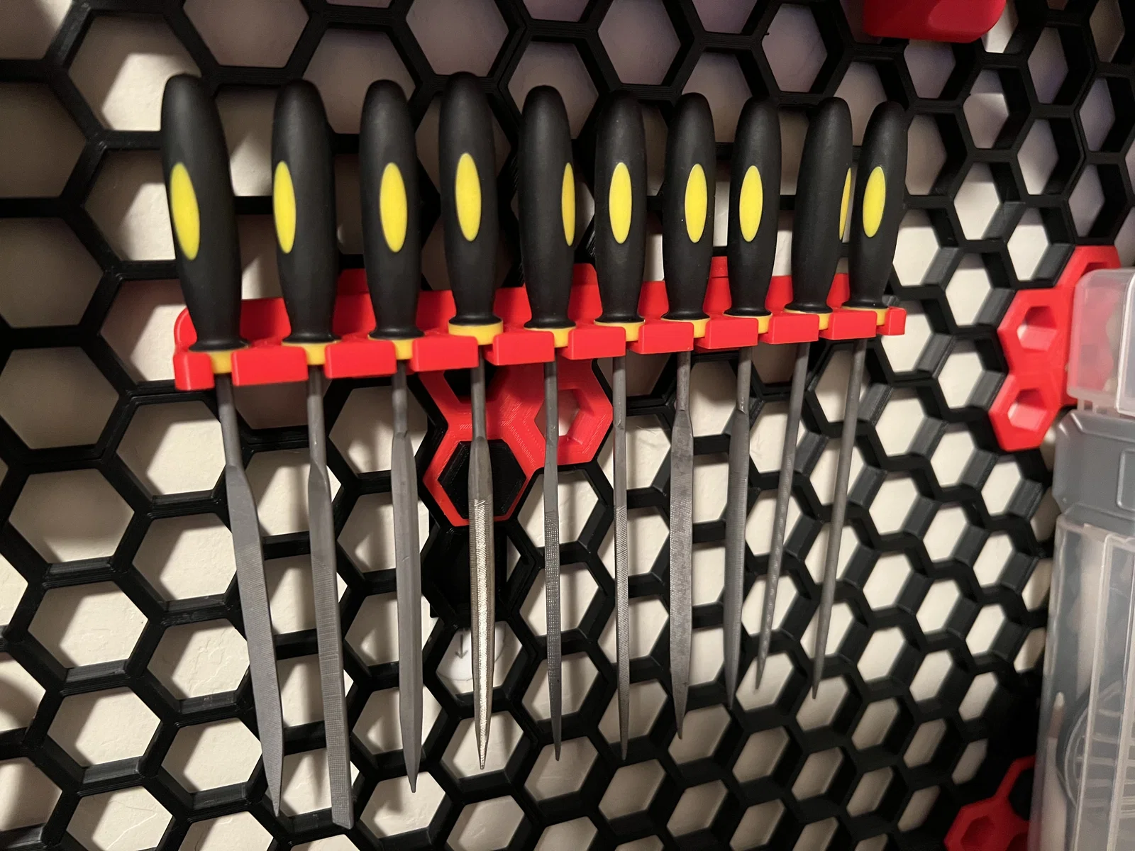 Đây là một cái kẹp đơn giản cho các loại dũa kim nhỏ. Nó tương thích với một số dũa rẻ tiền mà tui mua bên Temu. Cái cán dũa có đường kính khoảng 3mm và cái phần tay cầm để gắn vô kẹp thì khoảng 12mm. Mấy cái kẹp dũa kim khác mà tui thấy thì không có chắc chắn lắm, dũa cứ bị rớt ra hoài. Mẫu này thì có thể giữ dũa chắc hơn, mà vẫn rút thẳng dũa ra được để mấy món đồ khác trên tường tổ ong của bạn có thể đặt ngay phía trên cái kẹp này.