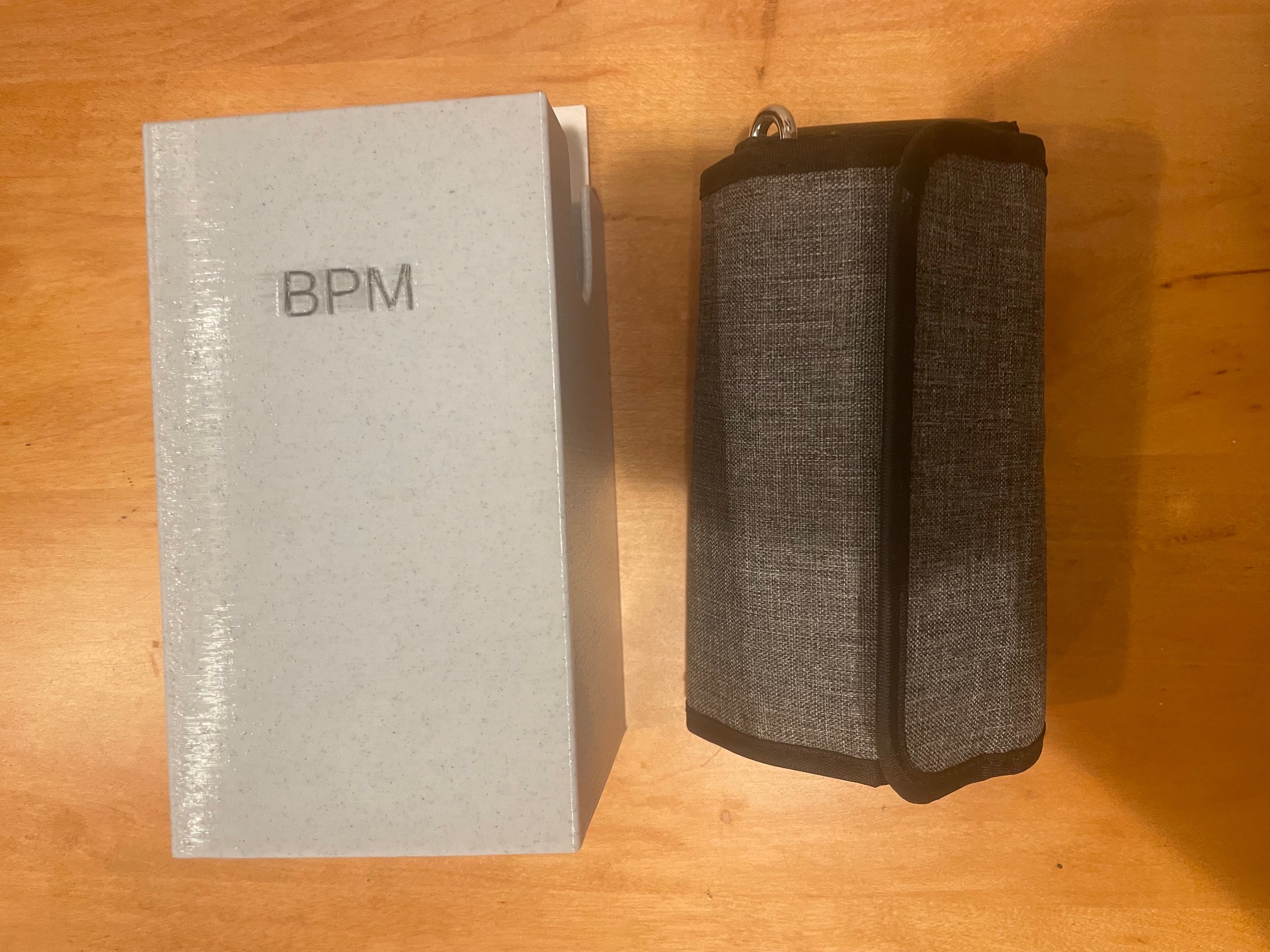 Hộp đựng đơn giản giữ máy đo huyết áp Garmin và sách hướng dẫn (gấp lại) giúp tiết kiệm không gian tối đa trong tủ thuốc.