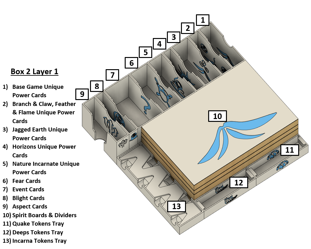 Bộ insert này được thiết kế để chứa tất cả nội dung có sẵn của Spirit Island với các lá bài bọc chất lượng tốt trong hộp Game Gốc và hộp Jagged Earth. Bộ insert được tối ưu hóa cho việc chơi nhiều người, vì các khay như khay năng lượng, nguyên tố và các token khác có sẵn theo cặp. Vì hầu hết tất cả nội dung từ Nature Incarnate đã được tiết lộ, chúng tôi đã có thể sửa đổi Bộ Insert Spirit Island cũ của chúng tôi đã chứa mọi thứ cho đến Jagged Earth để giờ đây bao gồm cả Nature Incarnate! Để có chỗ cho tất cả nội dung mới, hầu hết mọi bộ phận đều đã được thay đổi. Các bộ phận duy nhất giữ nguyên là các miếng đệm bảng đảo. Bộ insert tương thích với: * Game Gốc