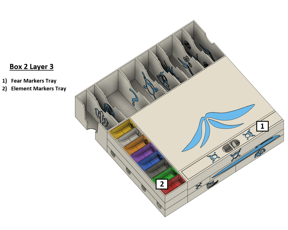 Cả hai khay đều có hai phiên bản: * Phiên bản đa màu (hình ảnh ở đây) trong đó mỗi khay riêng lẻ cho các nguyên tố và token khác nhau được in bằng màu tương ứng và sau đó được lắp vào khay lớn. Dung sai khá sít sao, đó là lý do tại sao chúng tôi khuyên bạn nên kiểm tra dung sai trước khi in toàn bộ. Hãy giảm tỷ lệ khay nếu chúng không vừa. - Phiên bản một màu, trong đó mọi thứ được in thành một khối. ### Khay Token Sợ Hãi