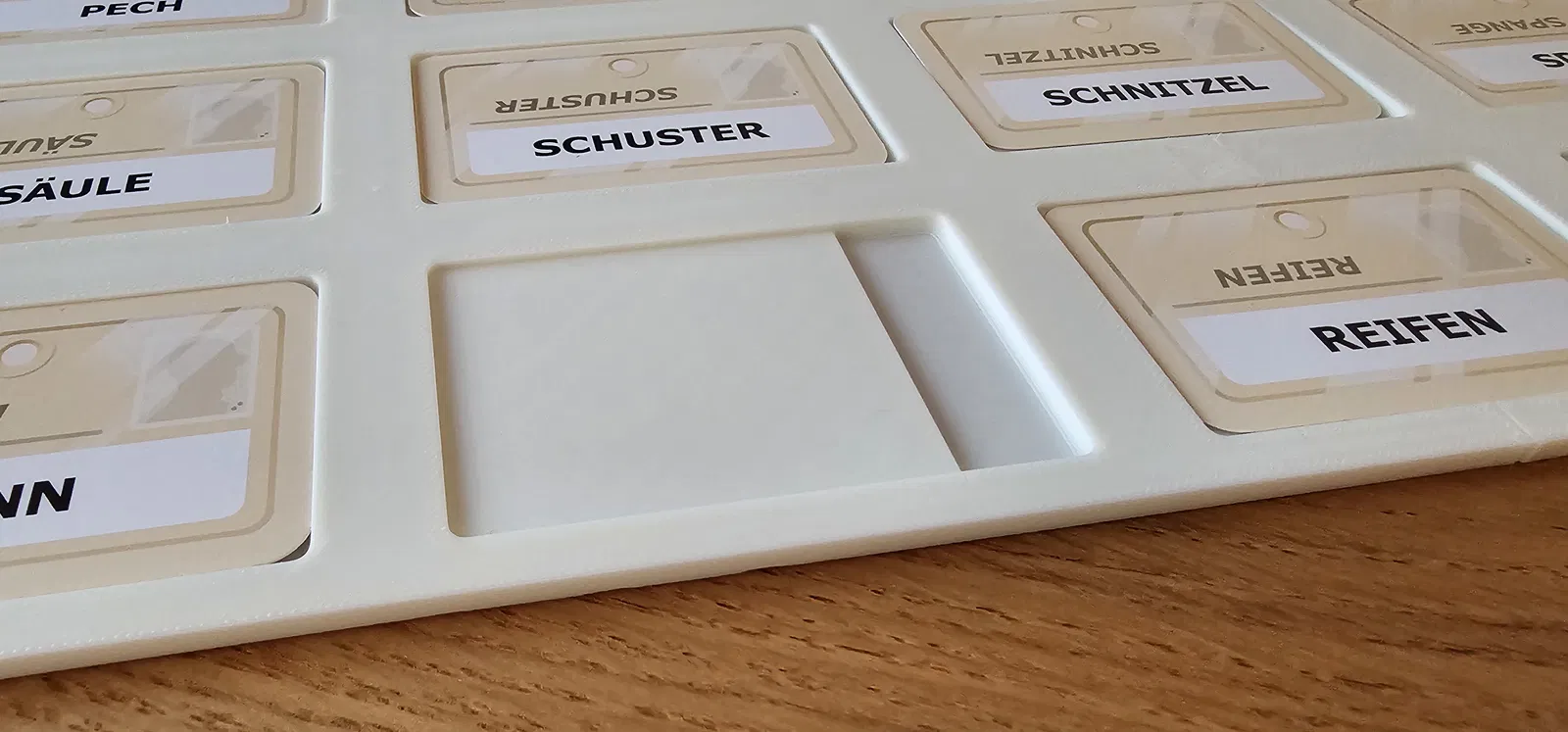 Khay đựng bài cho game "Codenames". Giúp sắp xếp bài gọn gàng, dễ dàng lật chọn lọc từng lá. Có thể tháo rời 4 mảnh để vừa hộp. In bằng PLA, không cần supports.
