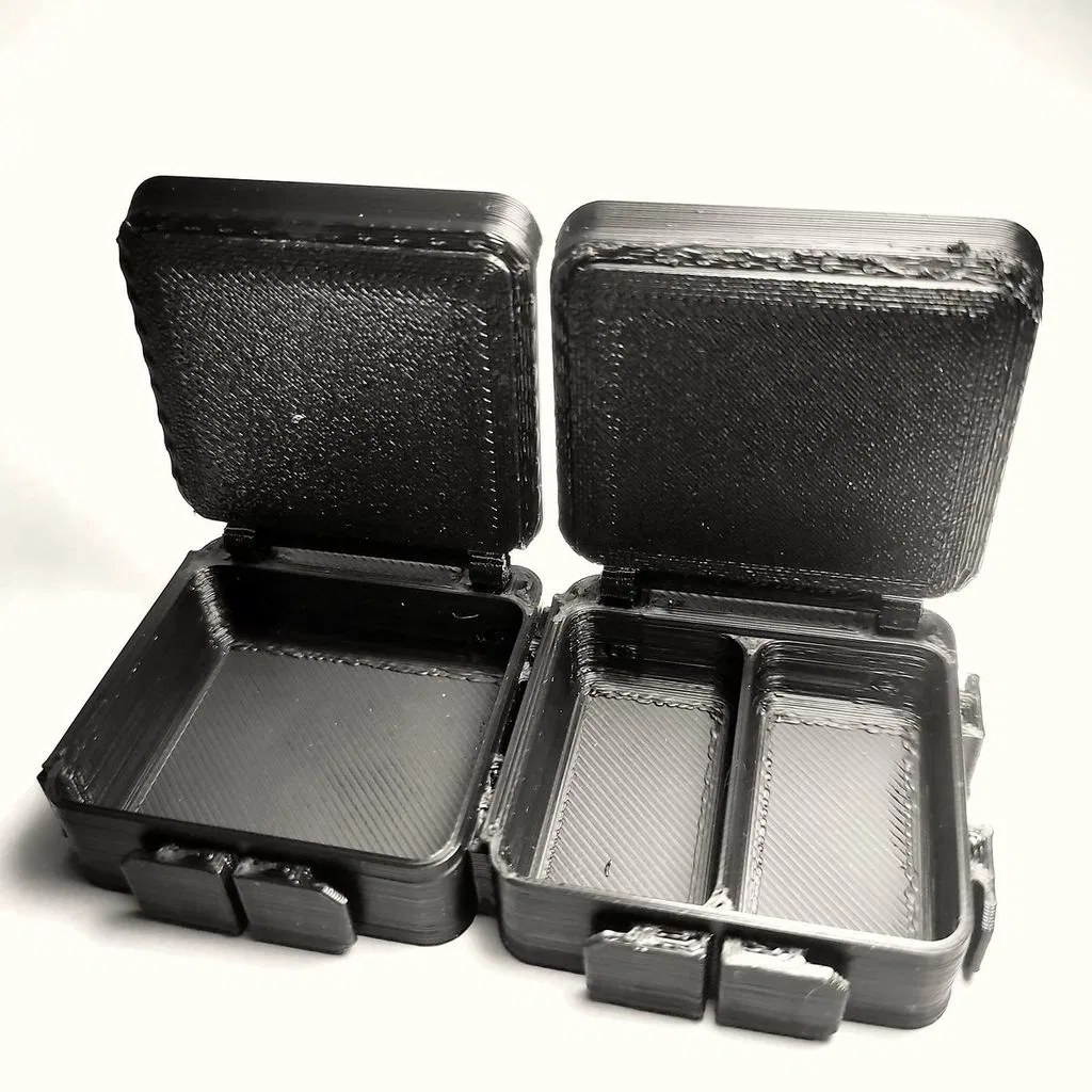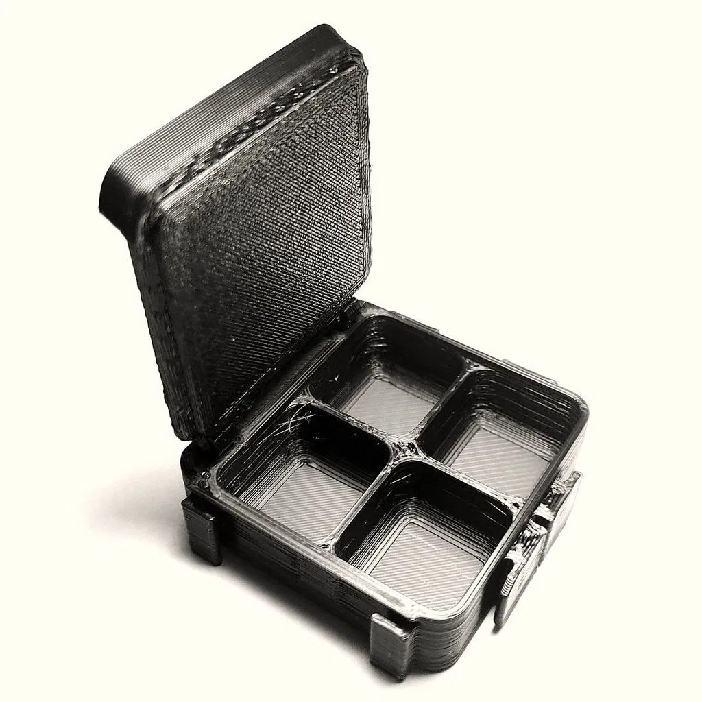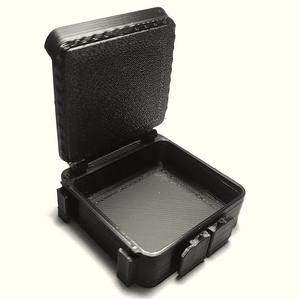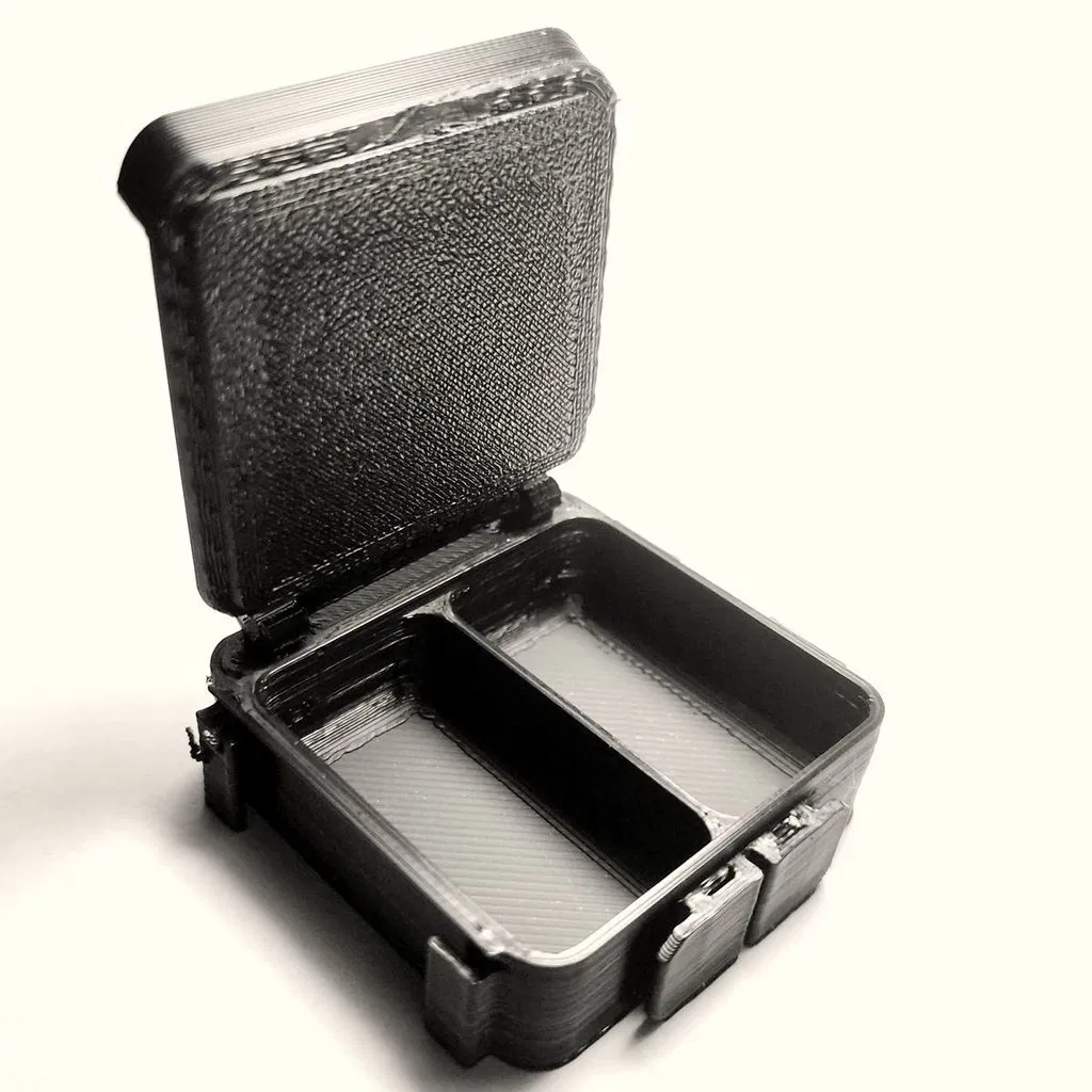 Không cần support cho hộp và phần chèn bản lề. Nắp hộp cần support. Sau khi chèn phần bản lề vào, nó được cố định phía sau bằng một đoạn sợi filament. Các phần chèn bản lề có thể cần được làm sạch bavia một chút để có thể lắp vào.