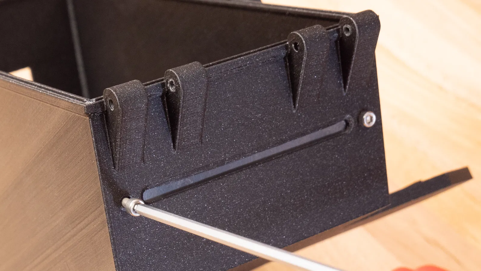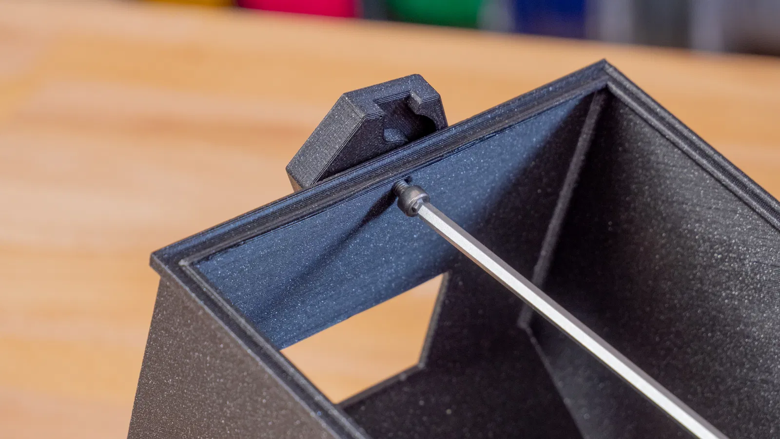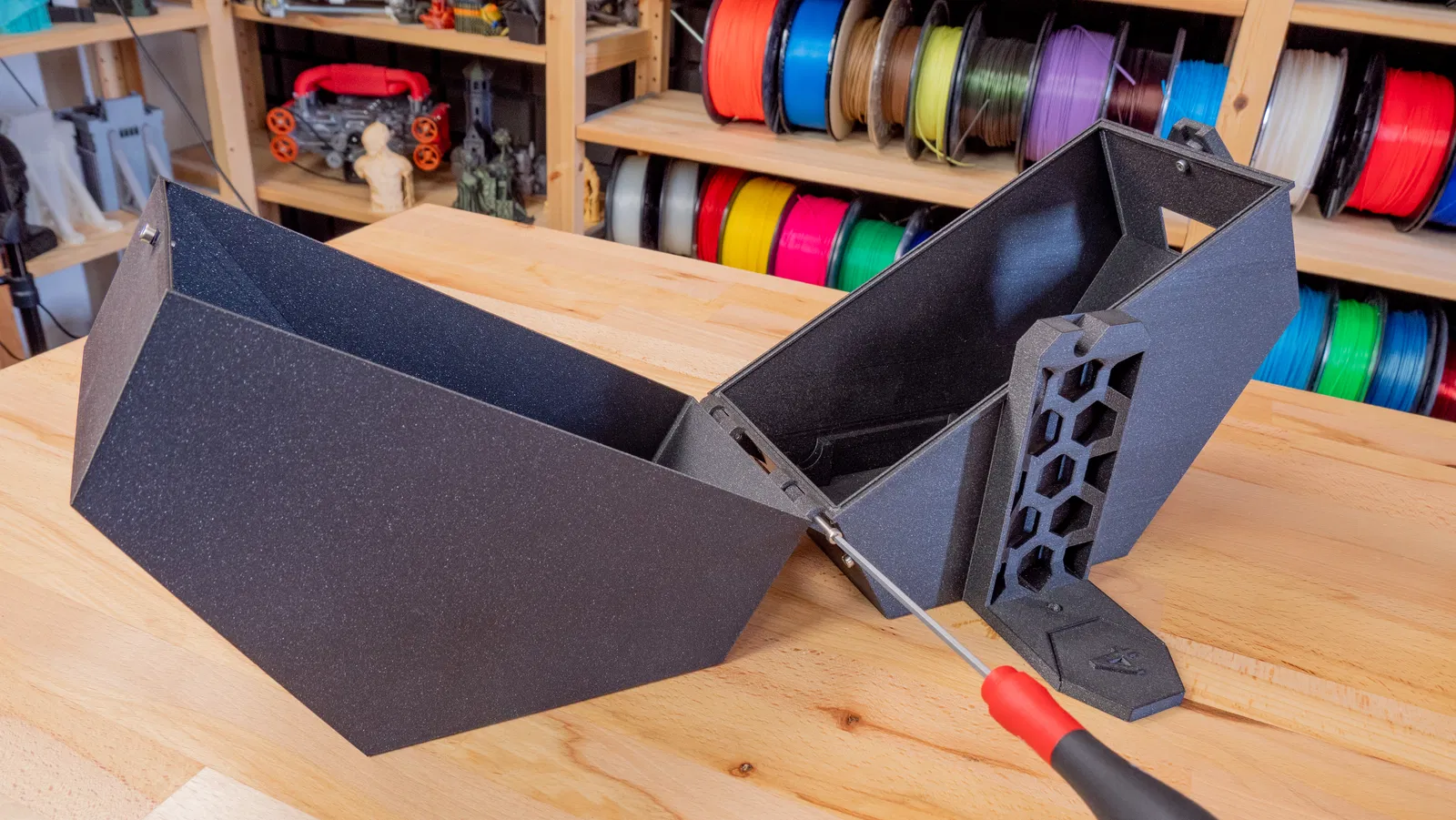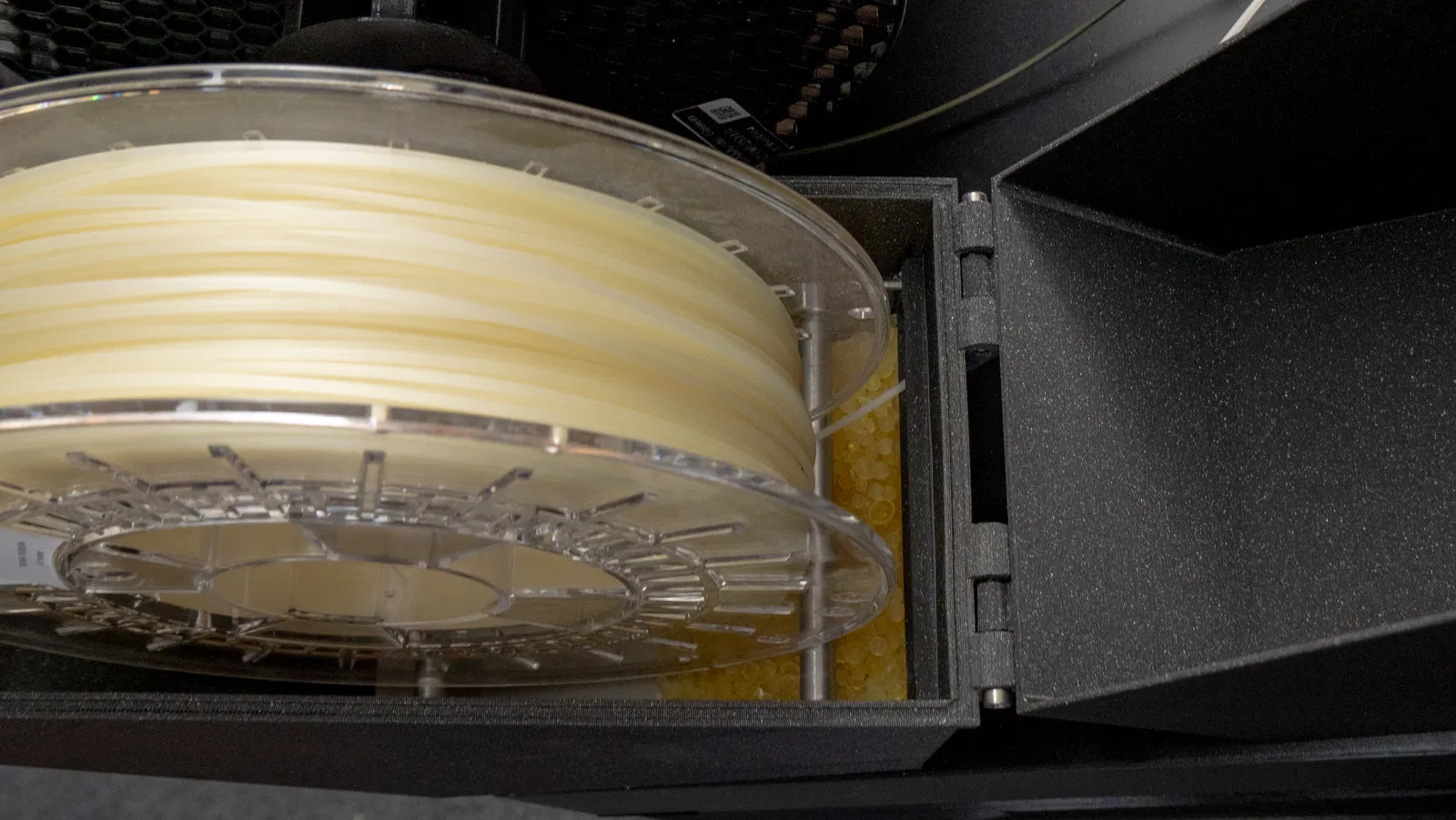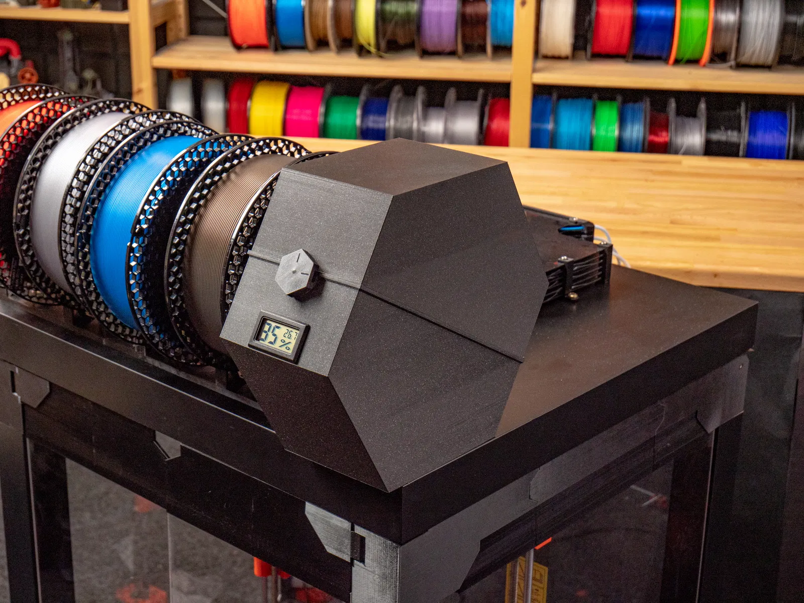 Giá đỡ cuộn sợi này có thêm lỗ để gắn cảm biến độ ẩm, kết hợp chức năng bảo quản sợi trong hộp kín. Hộp được thiết kế tối ưu để đặt bên phải tủ, giúp giữ cho sợi in của bạn luôn khô ráo và sẵn sàng sử dụng.