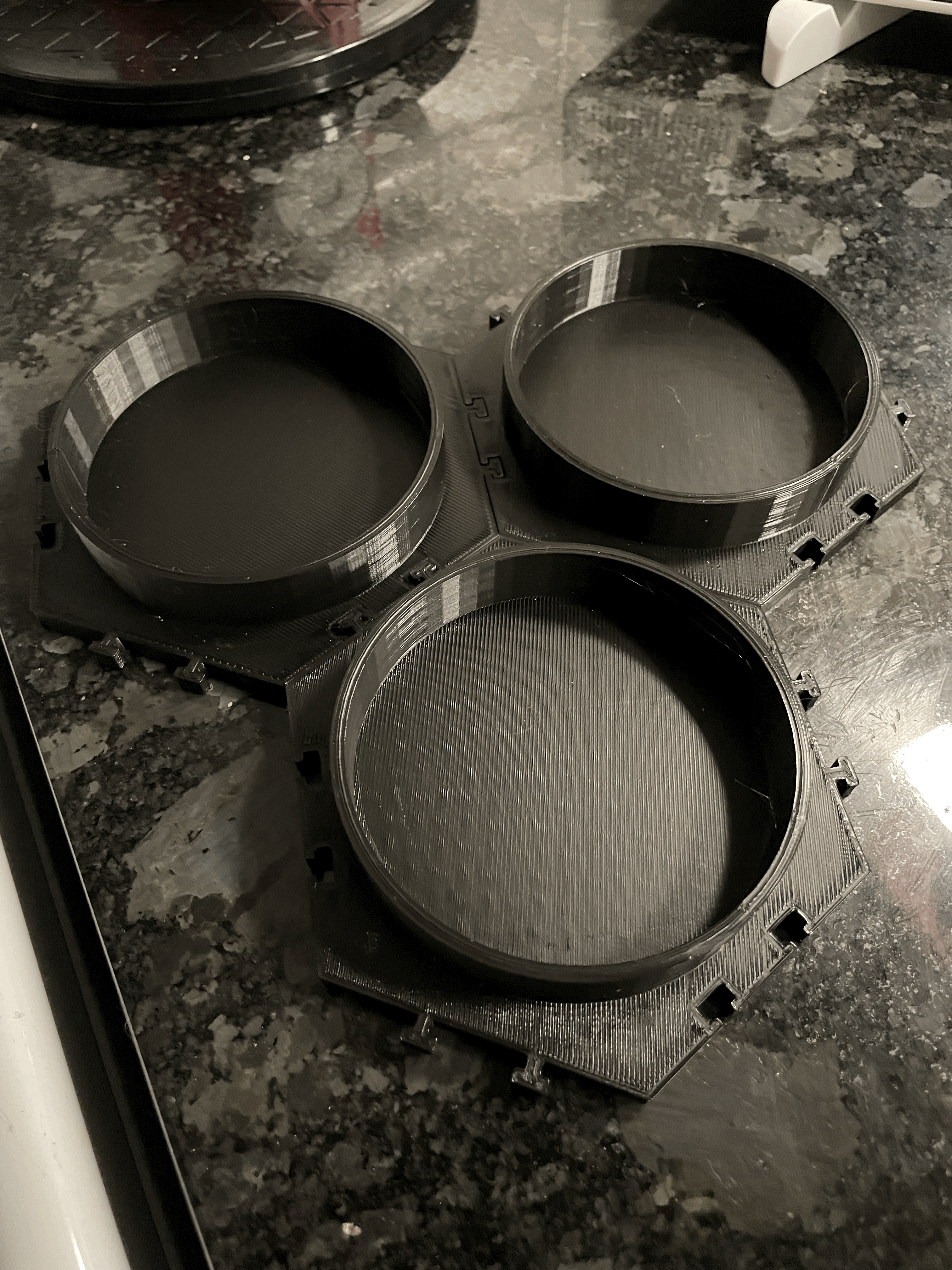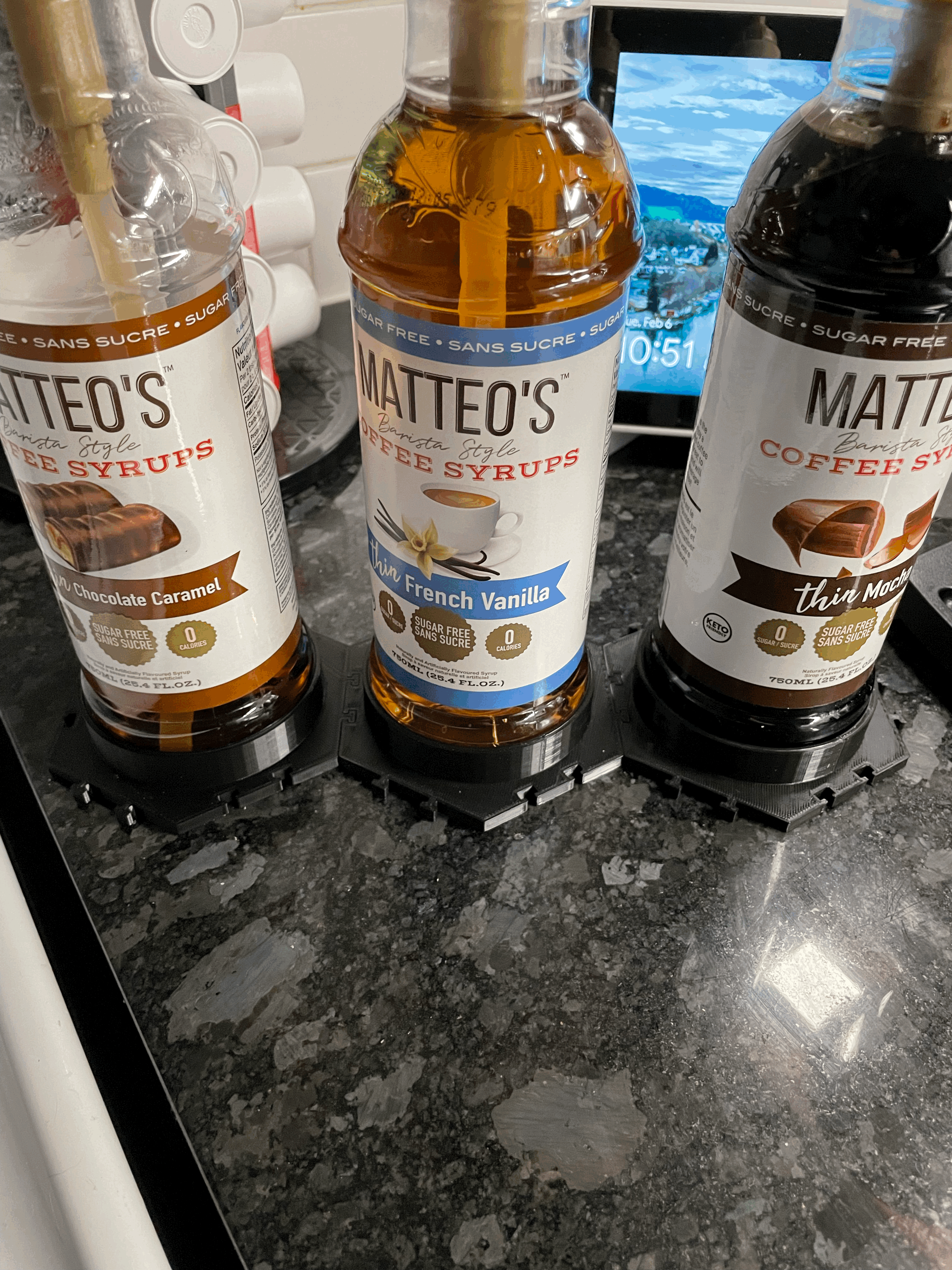 Một cái đế đơn giản để sắp xếp mọi thứ cho gọn gàng, đặc biệt là mấy chai syrup cà phê. Cái này làm ra để vừa chai có đường kính 76mm nha.