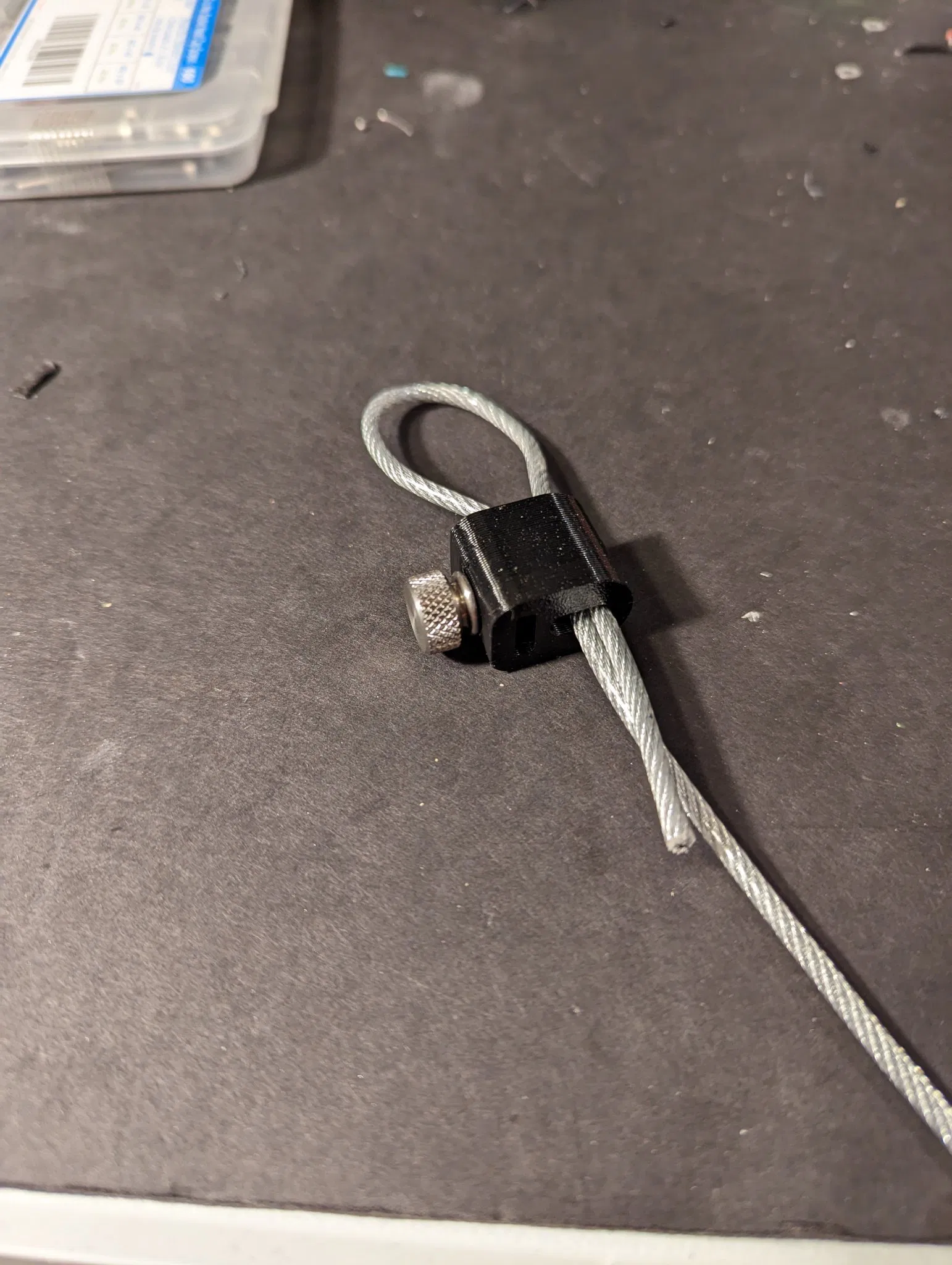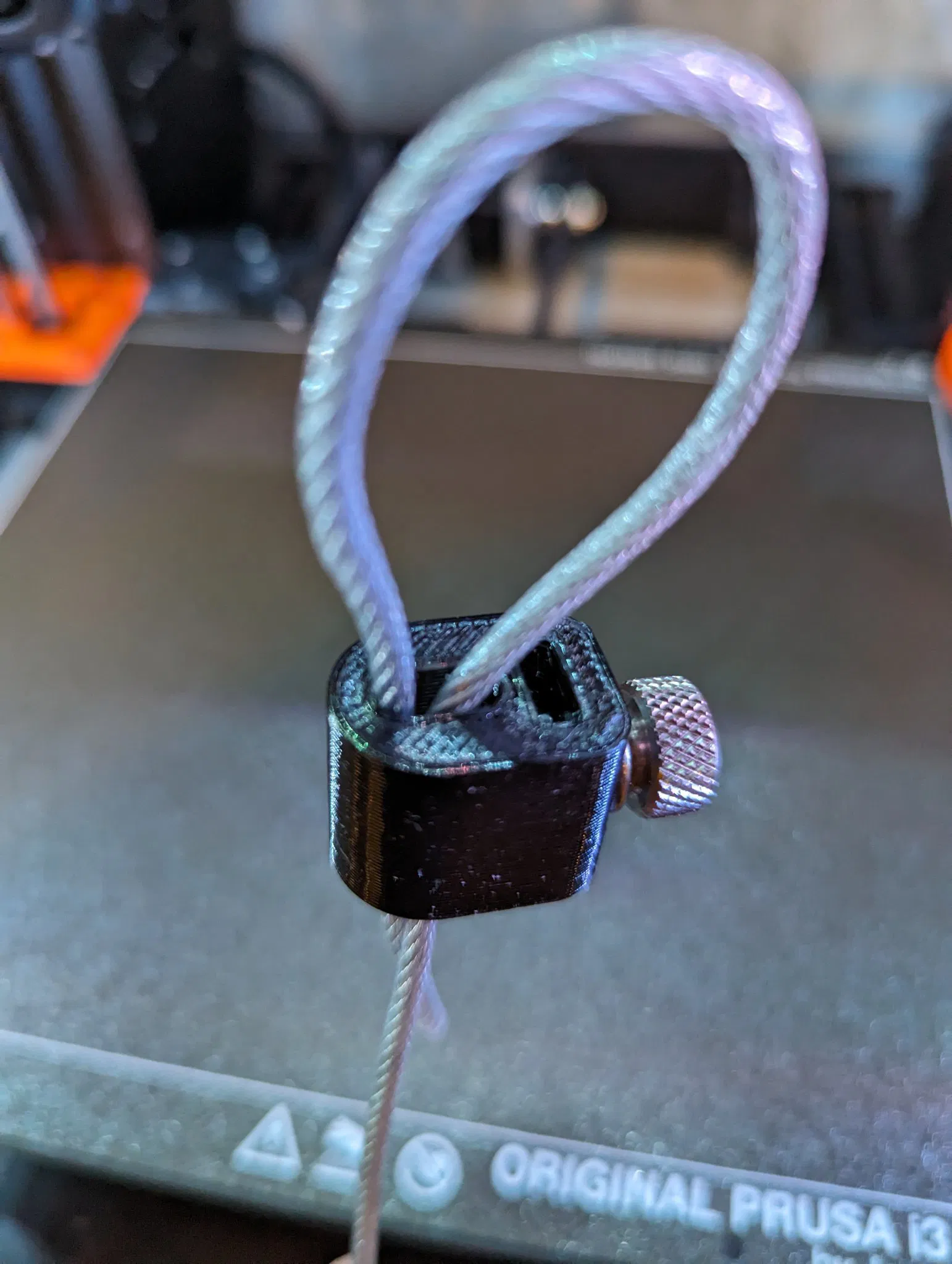 Tôi đã tạo ra cái kẹp này để giữ cho cáp vòng lại với nhau nhằm ổn định một chân đế kính thiên văn, và thay thế cho cáp được gắn vào tường/xà để ngăn TV bị đổ khỏi tủ. Một vít tay #10-32 hoặc vít thay thế xuyên qua đai ốc lục giác và kẹp chặt hai đoạn cáp đã được phủ, ngăn ngừa trượt. Một ví dụ về cáp mà tôi đã sử dụng -