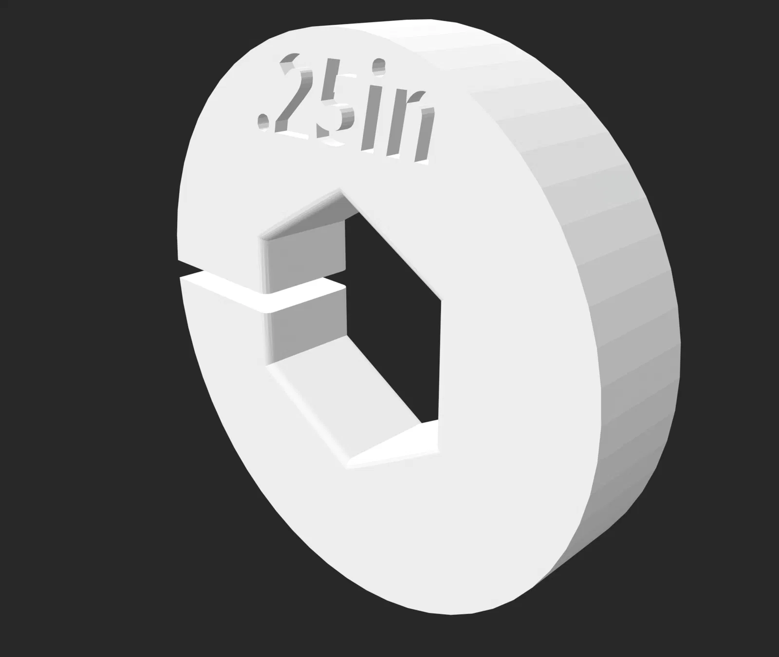 Bộ phận chặn FRC này được thiết kế cho thanh lục giác 0.25in. Có thể in bằng PLA, PETG hoặc TPU tùy nhu cầu. Có đường kính trong bo tròn và kích thước được in trực tiếp lên bộ phận để dễ dàng nhận biết và sử dụng.
