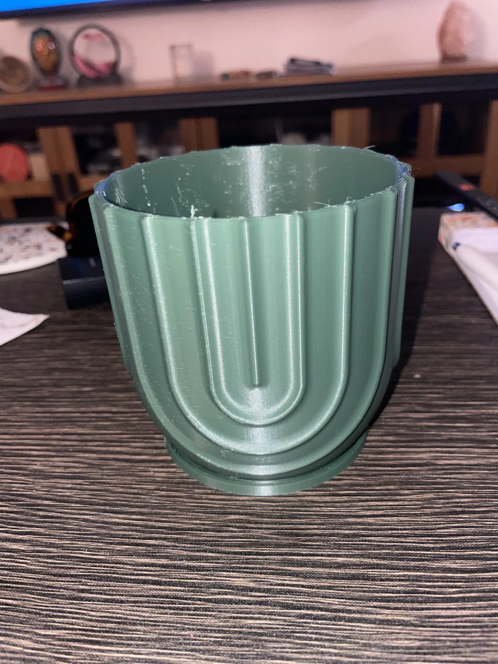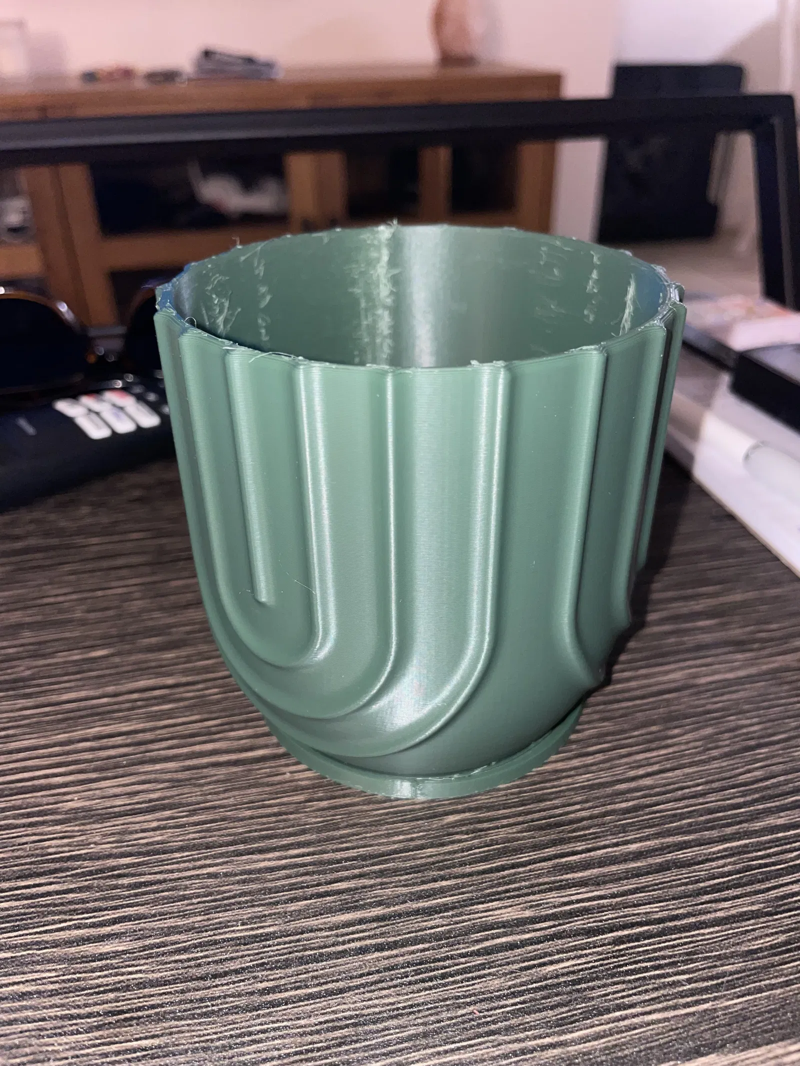 Chậu cây có lỗ thoát nước và đế lót, bạn có thể trồng cây trực tiếp vào chậu. Bản dịch cho: "Plant Pot with holes and coaster". Nội dung được dịch: Tôi bị dính nhiều sợi nhựa bên trong. Tôi vô tình để chế độ in ruột (infill), tôi nghĩ đó là nguyên nhân chính. Tôi khuyên bạn nên tắt chế độ in ruột đi.