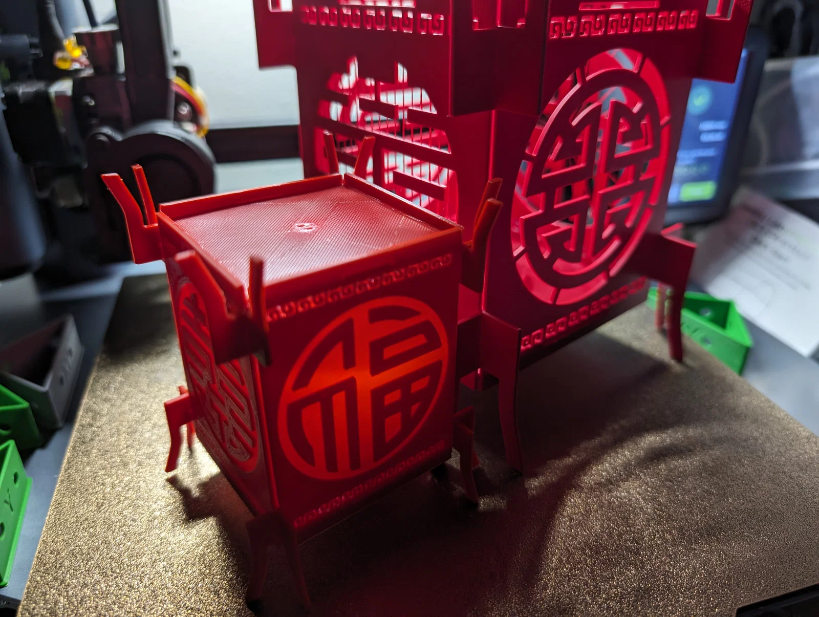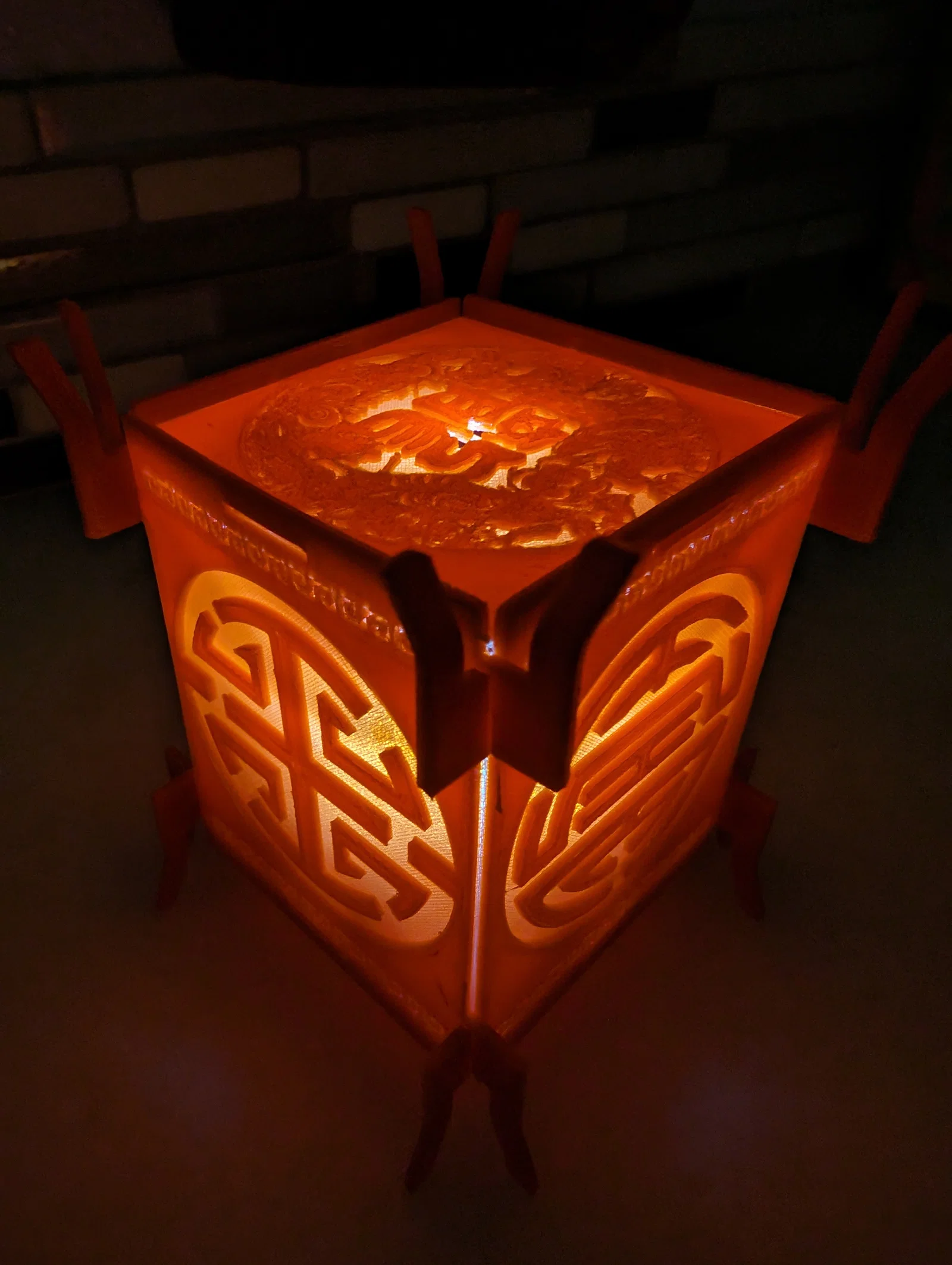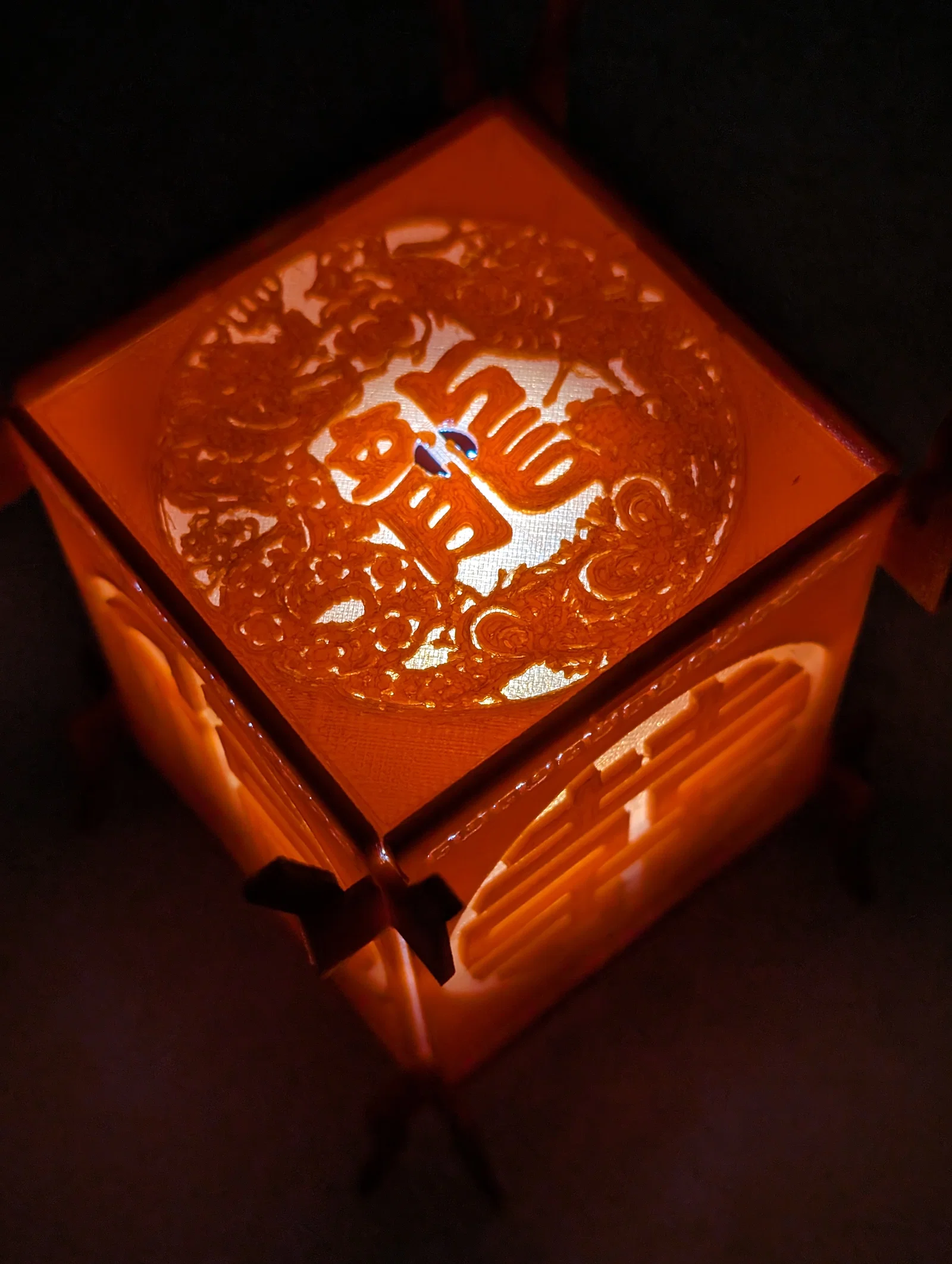 Mô hình đèn lồng đỏ Chúc Mừng Năm Mới với các mặt trượt vào nhau không cần keo. Có hai kích cỡ, phiên bản cho đèn LED và phiên bản PLA mờ. Tùy chỉnh các ký tự may mắn trên bốn mặt.
