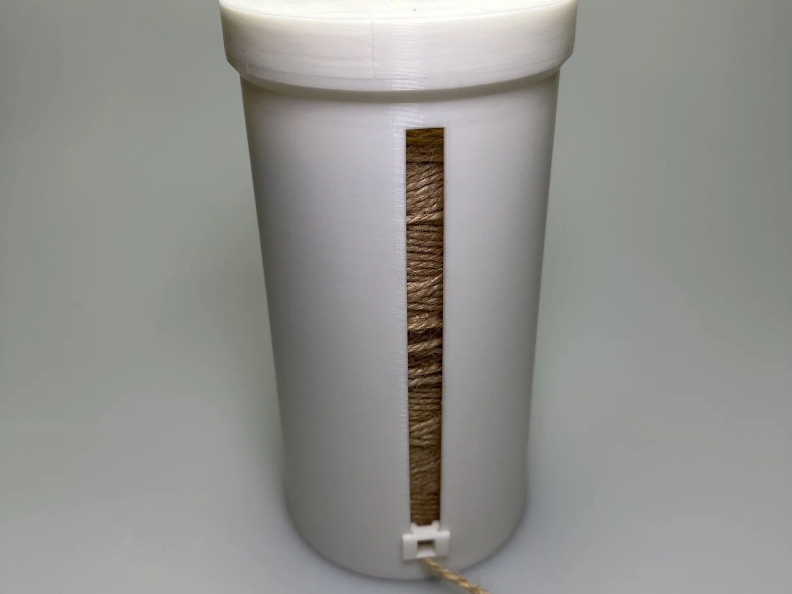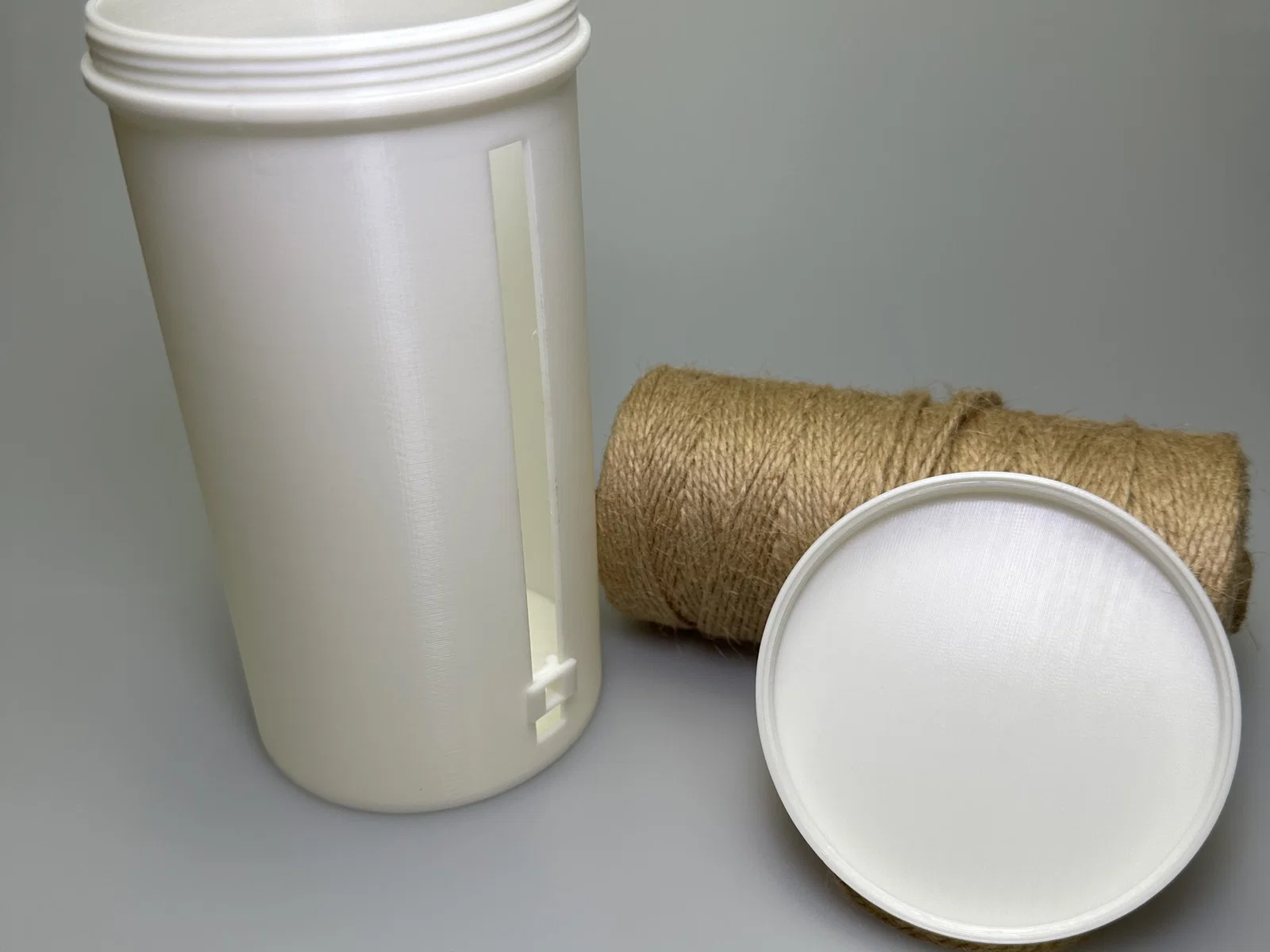 Tôi cần giữ một cuộn dây jute/sợi an toàn khỏi việc bị rối (hoặc mất) với một cách dễ dàng để phân phát. Tôi đã tìm kiếm xung quanh và không thể tìm thấy thứ gì phù hợp với nhu cầu của mình, đặc biệt là vì tôi có một cuộn hình trụ, tôi đã sử dụng thiết kế hộp tròn tùy chỉnh có nắp ren của FaberUnserzeit tìm thấy trên thingiverse. Tôi đã thêm hai thứ bổ sung vào đó, một thanh trung tâm để giữ cuộn dây ở vị trí bên trong hình trụ trong khi cho phép nó cuộn ra một cách tự do và một lỗ mở theo chiều dọc ở một bên để giúp phân phát dây khi cần. Tôi cũng đã thiết kế một khóa nhỏ để giữ dây kéo ở vị trí (ở trên cùng hoặc dưới cùng) khi không sử dụng, cái này cũng có thể đóng vai trò như một hướng dẫn nếu bạn cần.