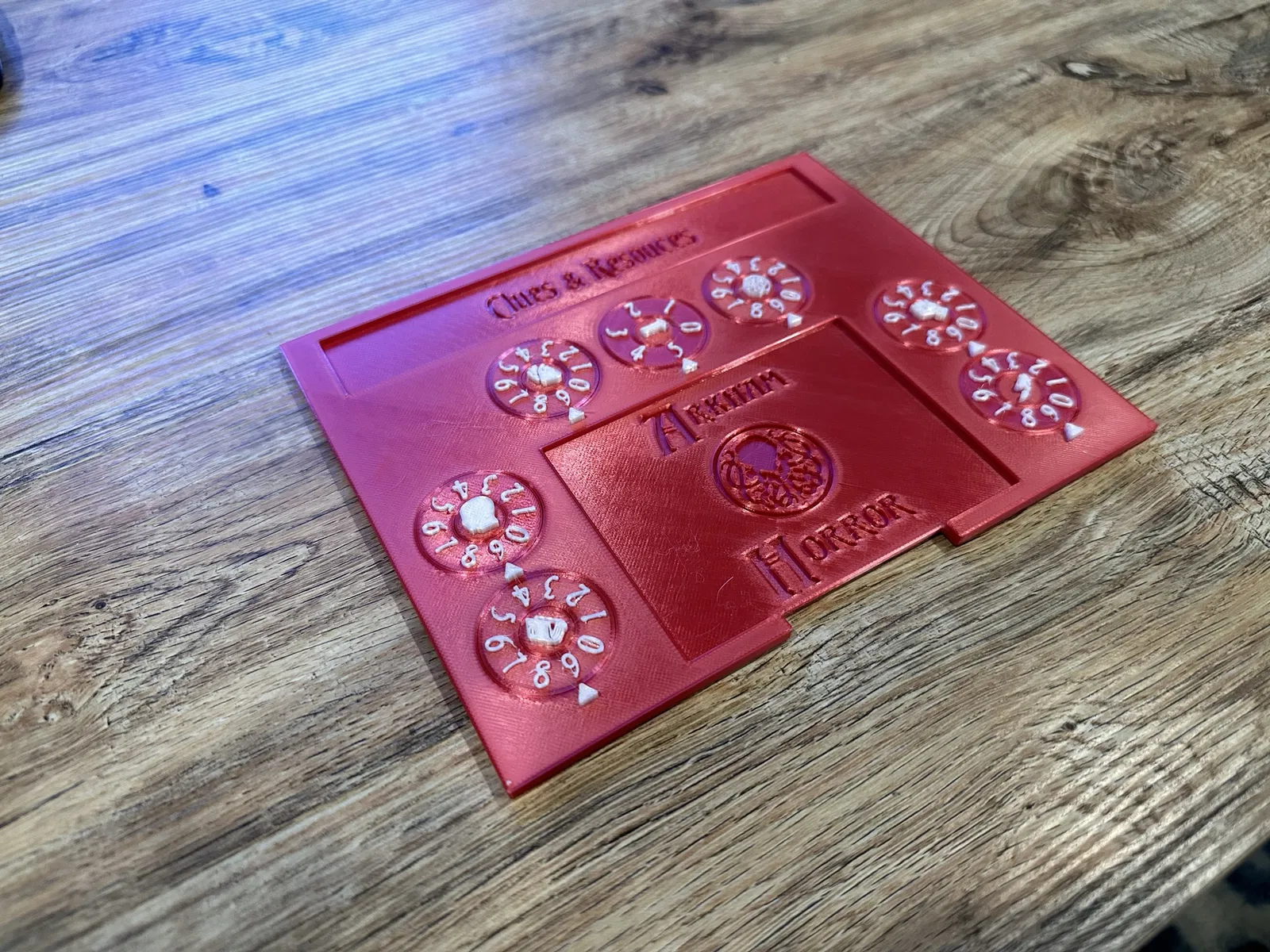 Đây là phiên bản cập nhật của mình cho cái playerboard của Arkham Horror LCG để theo dõi thông tin của các điều tra viên. Nó vừa với cả card có bọc sleeve luôn nha. Mô hình này có 7 cái bánh răng xoay để theo dõi các chỉ số động như là sát thương, nỗi sợ, lượt còn lại & các chỉ số cơ bản. Có 2 loại bánh răng xoay để bạn lựa chọn: loại từ 0-9 và loại từ 0-5 (mình thì dùng loại 0-5 để đếm số lượt còn lại, nhưng bạn cứ in hết loại 0-9 cũng được). Phần khoét ở trên là để thu thập manh mối và tài nguyên bạn kiếm được trong lượt của mình. Bạn có thể dùng các bánh răng xoay này mỗi lượt để giúp bạn tính toán cấp độ kỹ năng cuối cùng trước khi rút từ túi chaos, hoặc đơn giản là để theo dõi các chỉ số cơ bản tăng vĩnh viễn mà bạn kiếm được (ví dụ: +1 điều tra sau khi bạn chơi cái kính lúp). Nếu bạn muốn một cái playerboard mà dùng ít chi tiết hơn và không cần đổi màu filament, thì xem thử cái playerboard khác của mình nha! ()