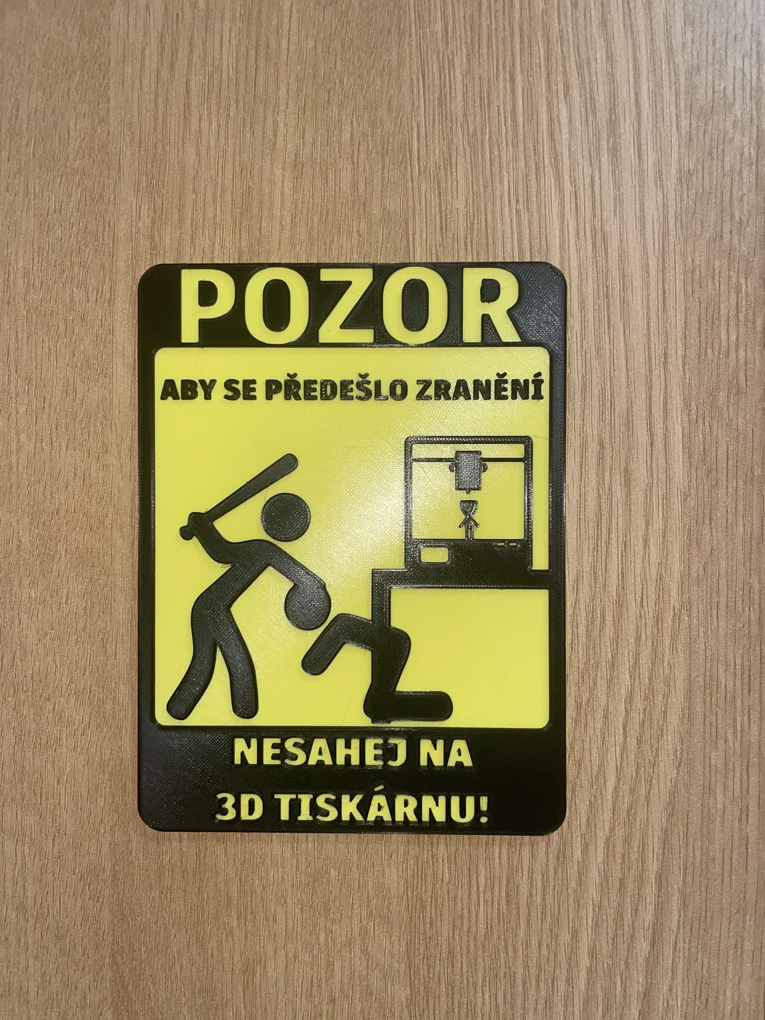 Bản dịch tiếng Việt của bảng cảnh báo dành cho máy in 3D. Lưu ý: Bảng này chỉ mang tính giải trí, không khuyến khích sử dụng bạo lực. Thông tin in chi tiết: cần thay đổi màu sợi nhựa sau khoảng 4h 24phút khi in lớp 2,3mm.