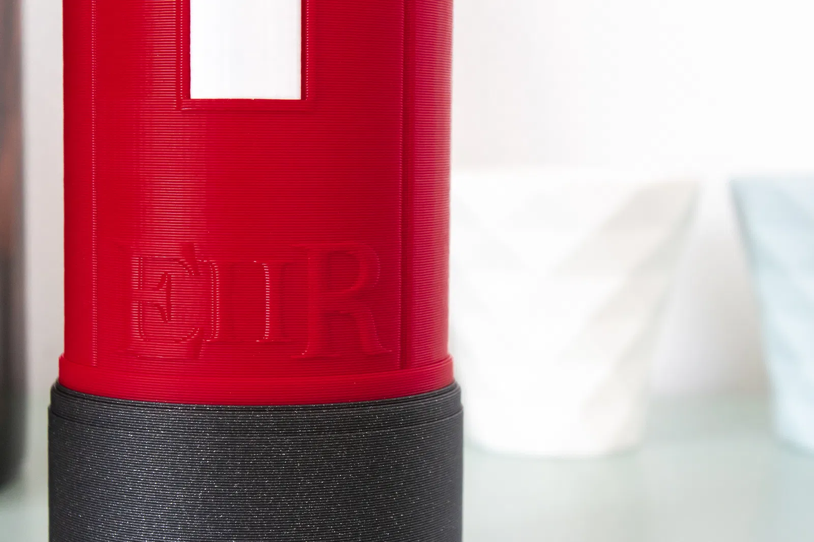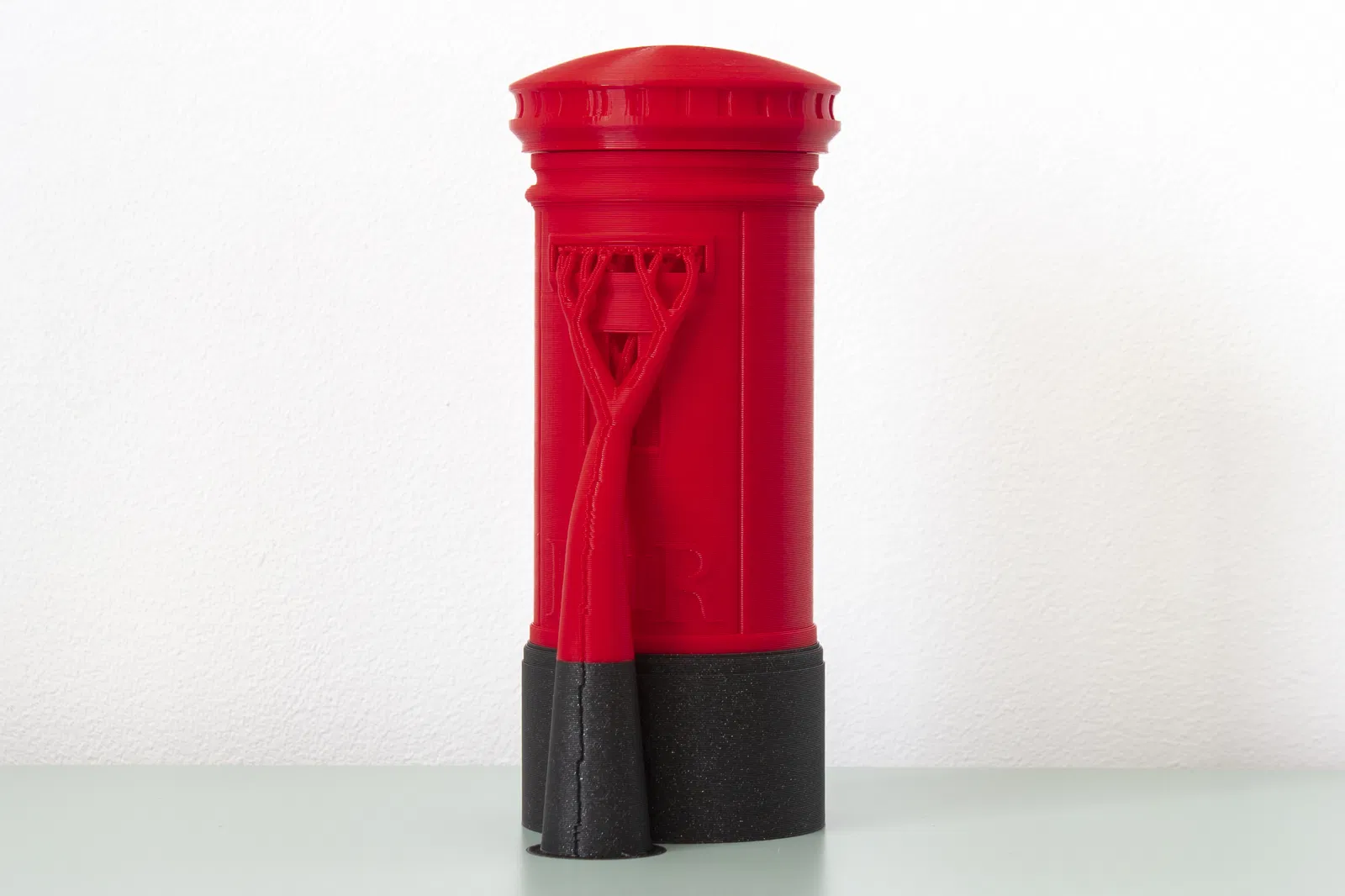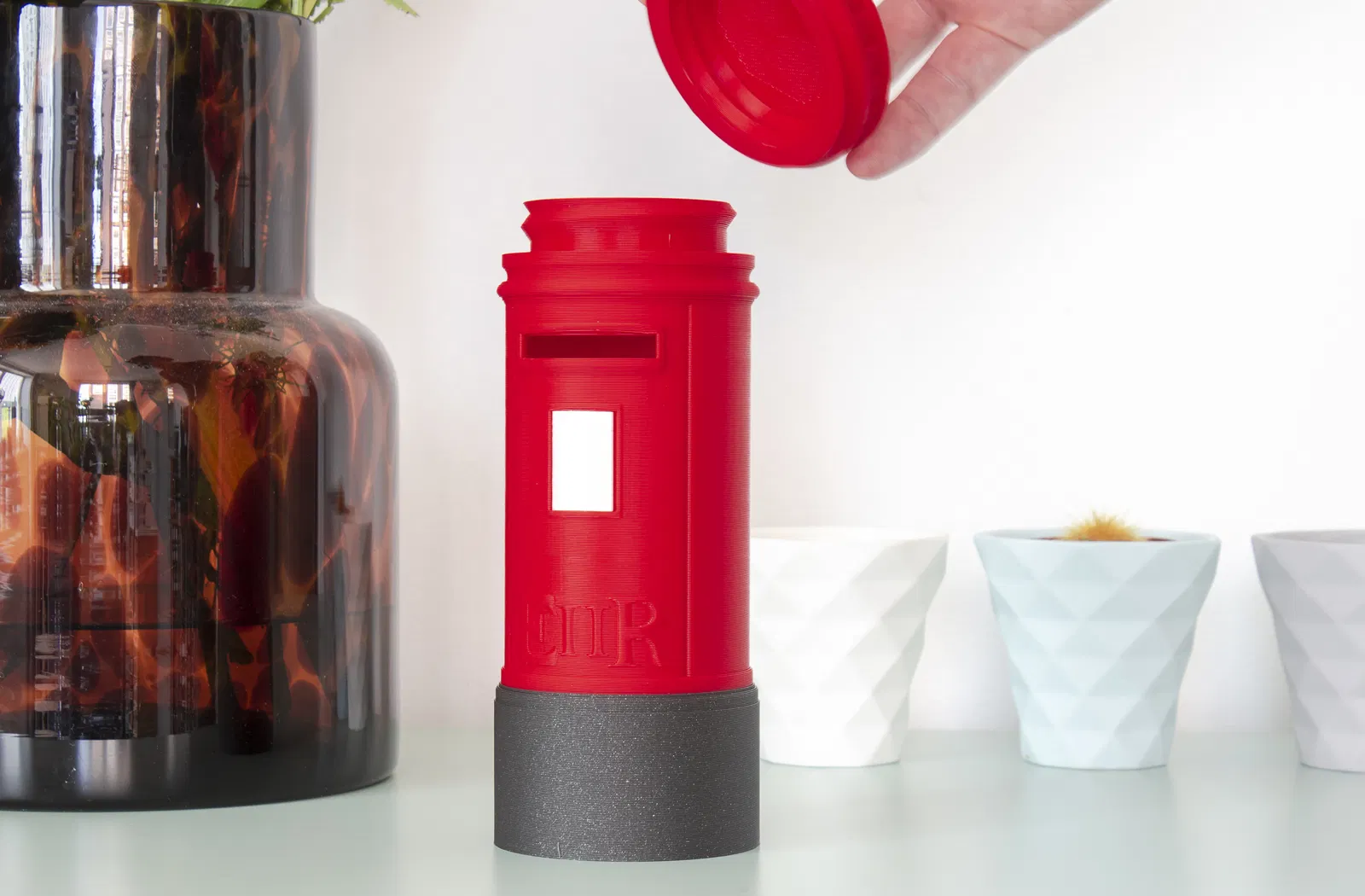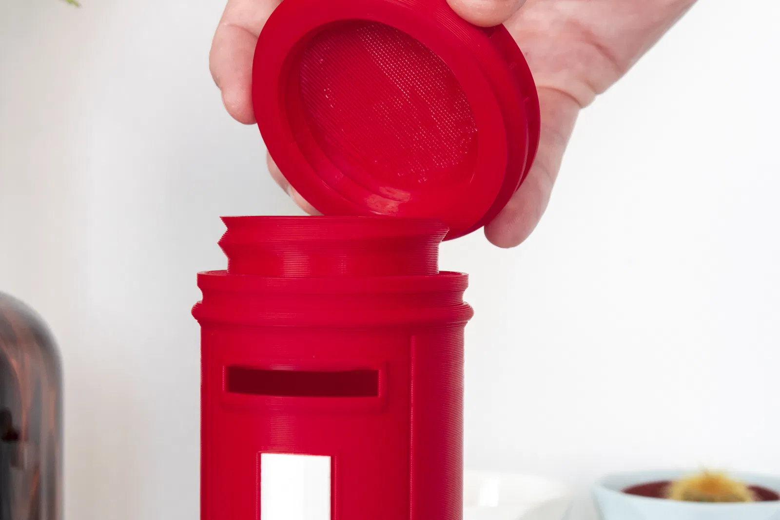 Thân chính là một khối liền, nên cần phải đổi màu nếu bạn muốn cái đế có màu khác. Phần nắp trên thì vặn vào thân chính, còn cái bảng thời gian thì gài vô khe dọc. Cũng cần một ít giá đỡ cho cái khe đựng tiền xu.