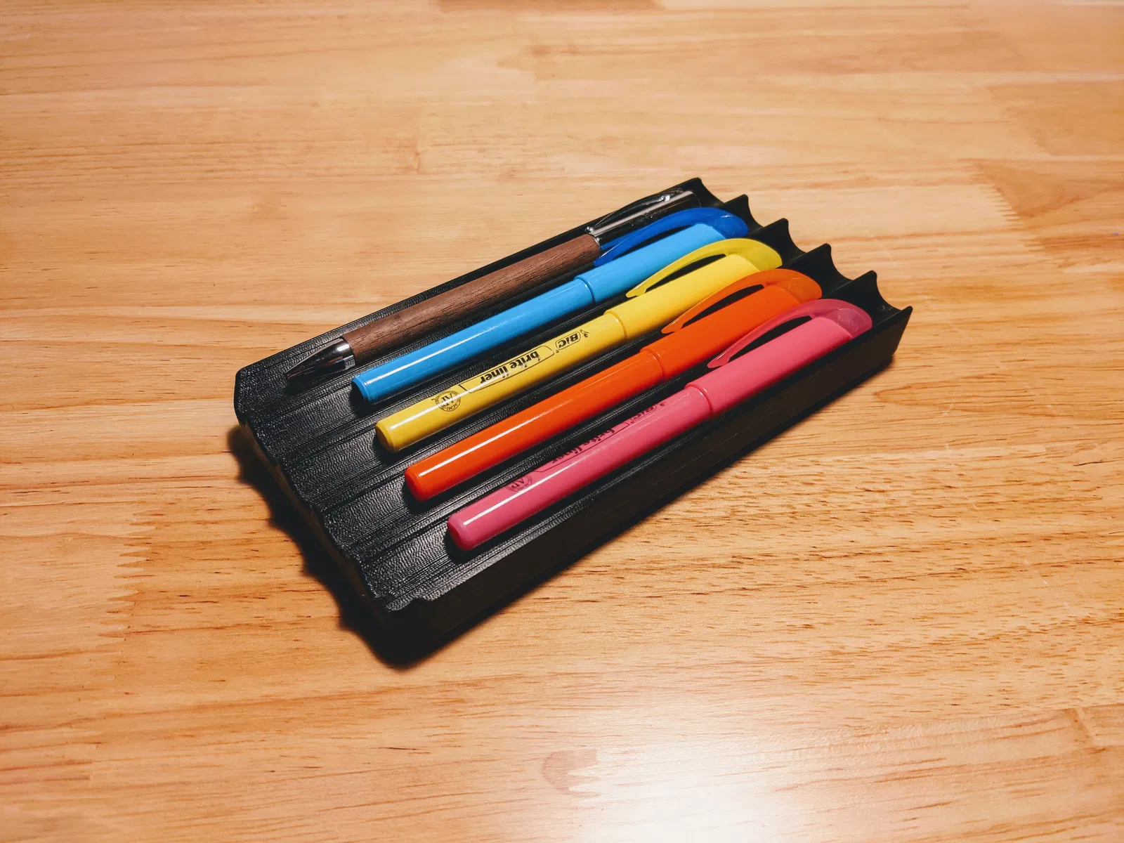 Khay đựng bút in 3D, có chỗ cho năm cây bút. Đây là một vật dụng tối giản, không rườm rà, trông rất đẹp và ngăn không cho những cây bút yêu thích của bạn bị lăn đi. Kích thước của nó là 18x93x180mm.