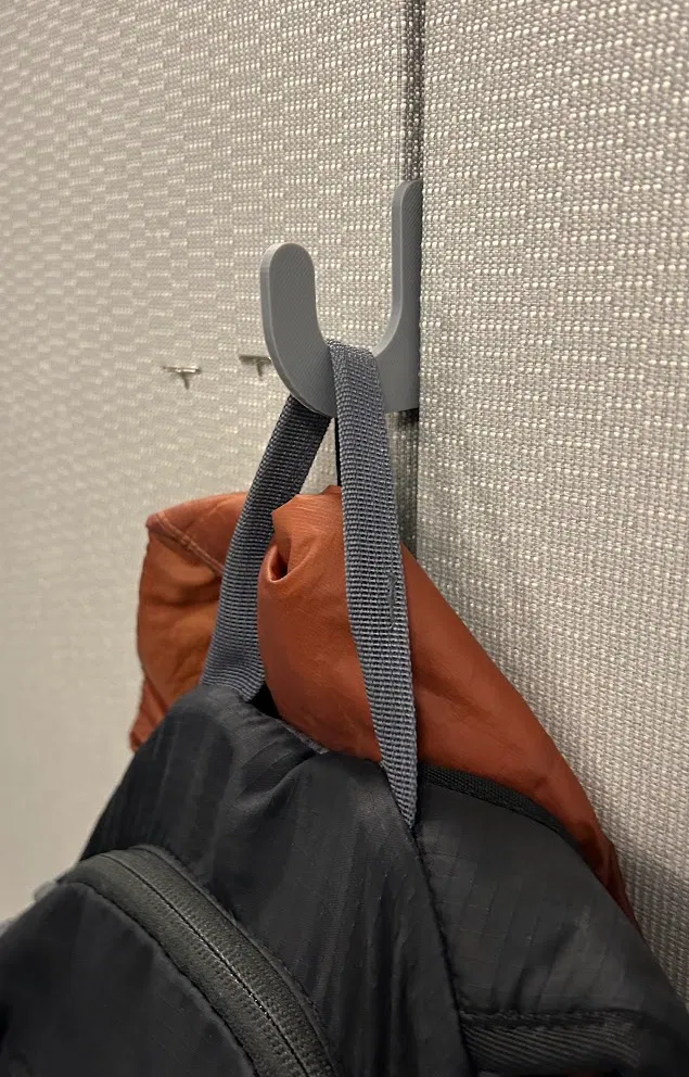 Một bản sao của móc treo tường hình khối, làm từ PLA, đủ cứng cáp để treo túi xách có laptop. Có thêm phiên bản rộng để vừa vặn hơn hoặc với vách ngăn có khe hở.