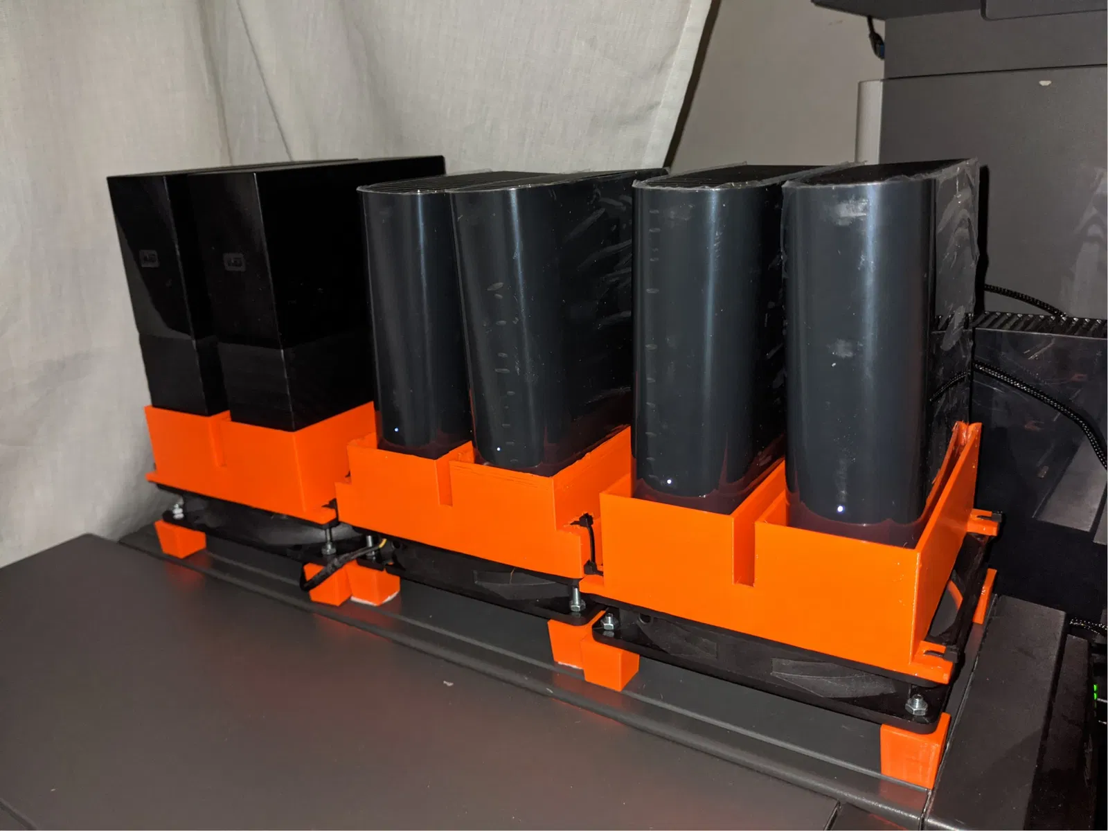 Tui thiết kế cái đế này cho hai ổ cứng WD MyBook / Elements để giảm nhiệt độ và để tui khỏi va vô làm đổ chúng. Chỉ cần gắn mấy cái chân đế vô quạt 140mm bằng mấy con ốc M4 là được. Nên in bằng PET-G hoặc ABS để tránh bị chảy nhựa.