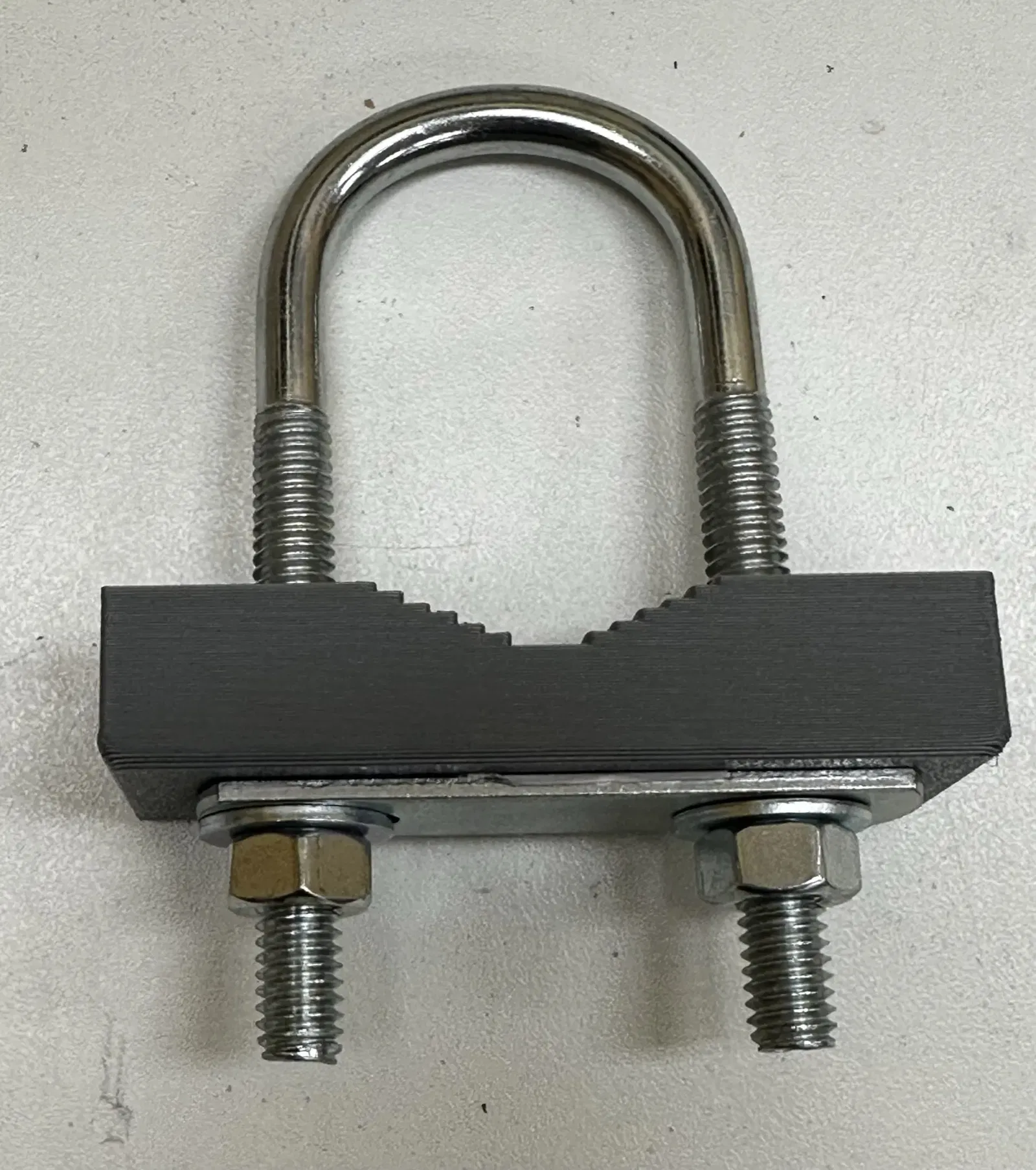 Một giá đỡ yên xe in 3D cho một bu-lông hình chữ U 1 1/14" (1.25 in) 5/16". Thông thường, phần này sẽ chịu nhiều lực, vì vậy bạn cần in nó để chịu được lực thẳng đứng cũng như lực xoắn. Lần thử nghiệm đầu tiên của tôi (chưa được thử nghiệm dưới tải) là như sau:
